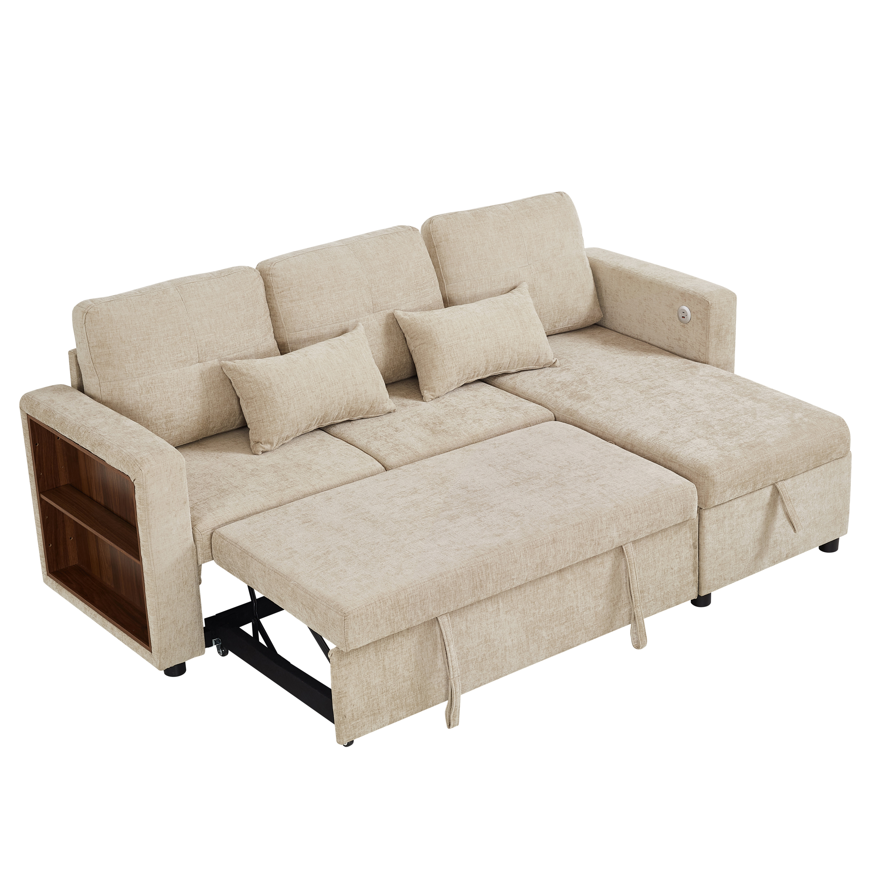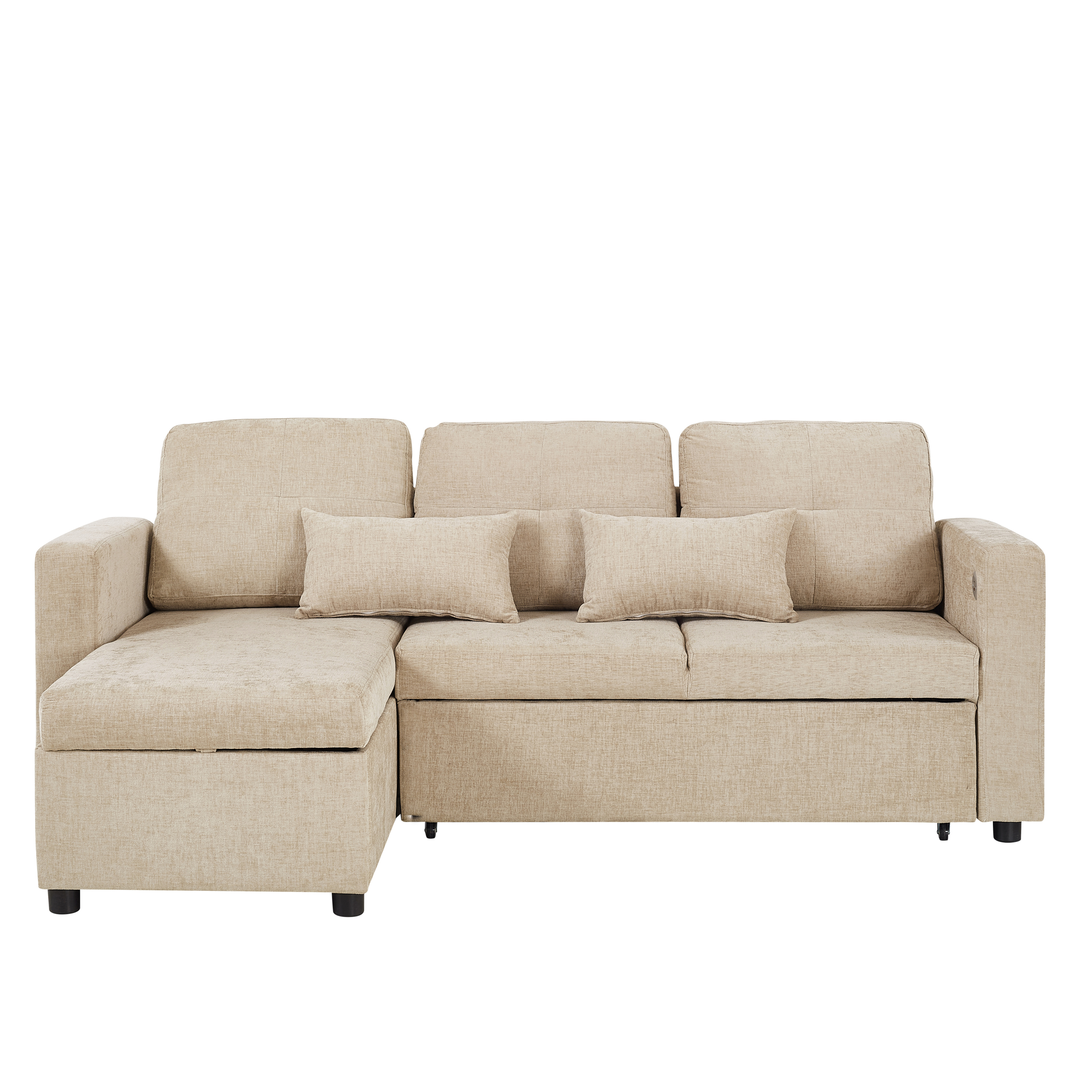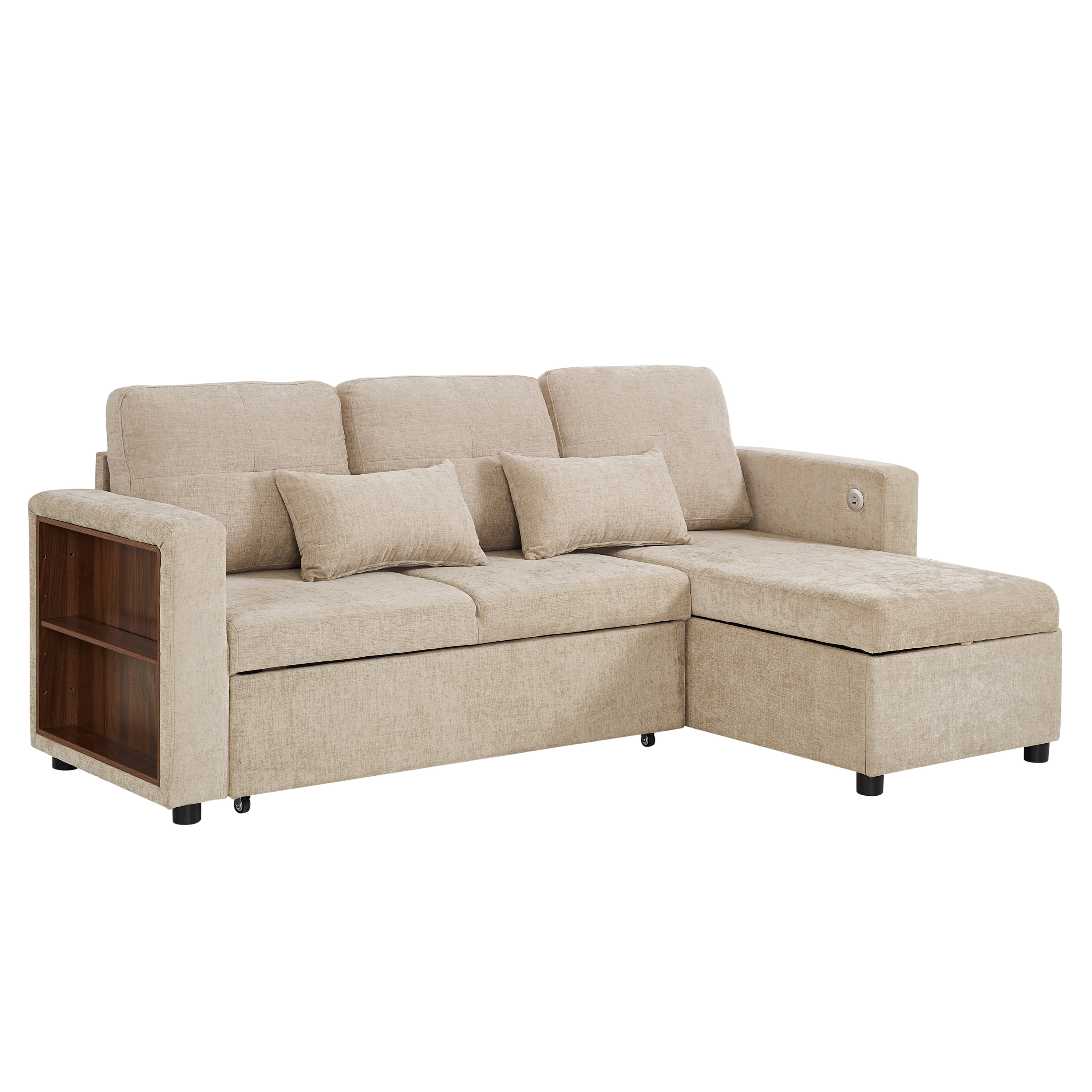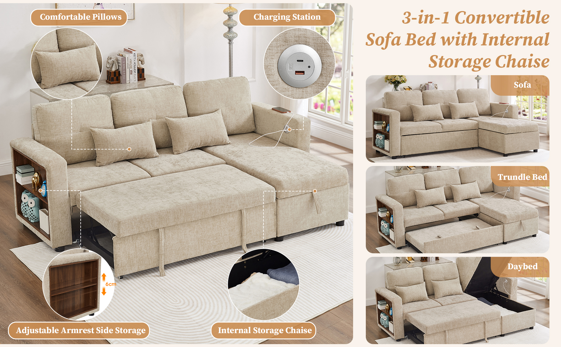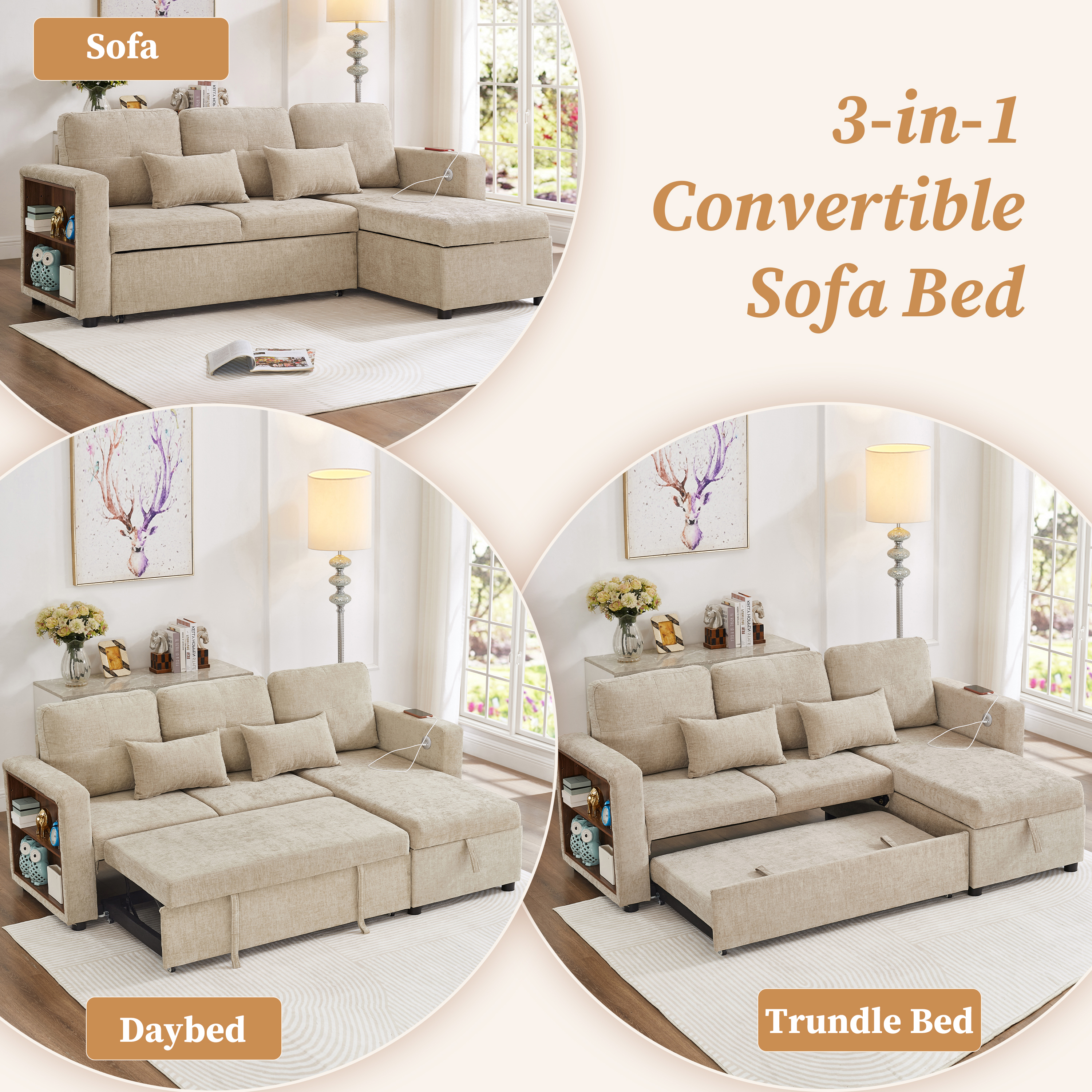 Product Name:3-in-1 Convertible Chenille Sectional Sofa Bed with Reversible Storage Chaise, L-Shaped Sleeper Sofa with Integrated Charging Station and Adjustable Armrest Side Storage, USB & Type-C Ports, Beige