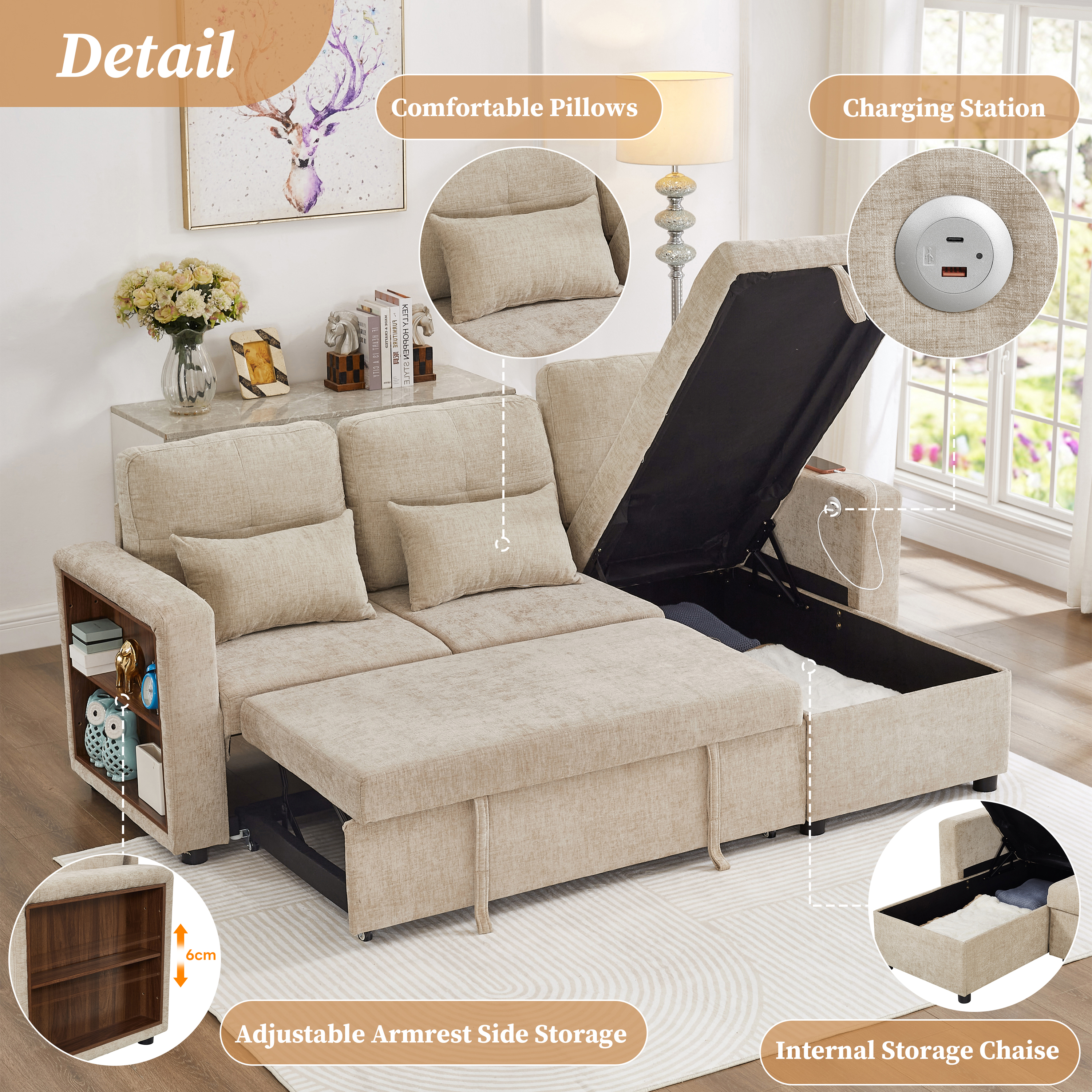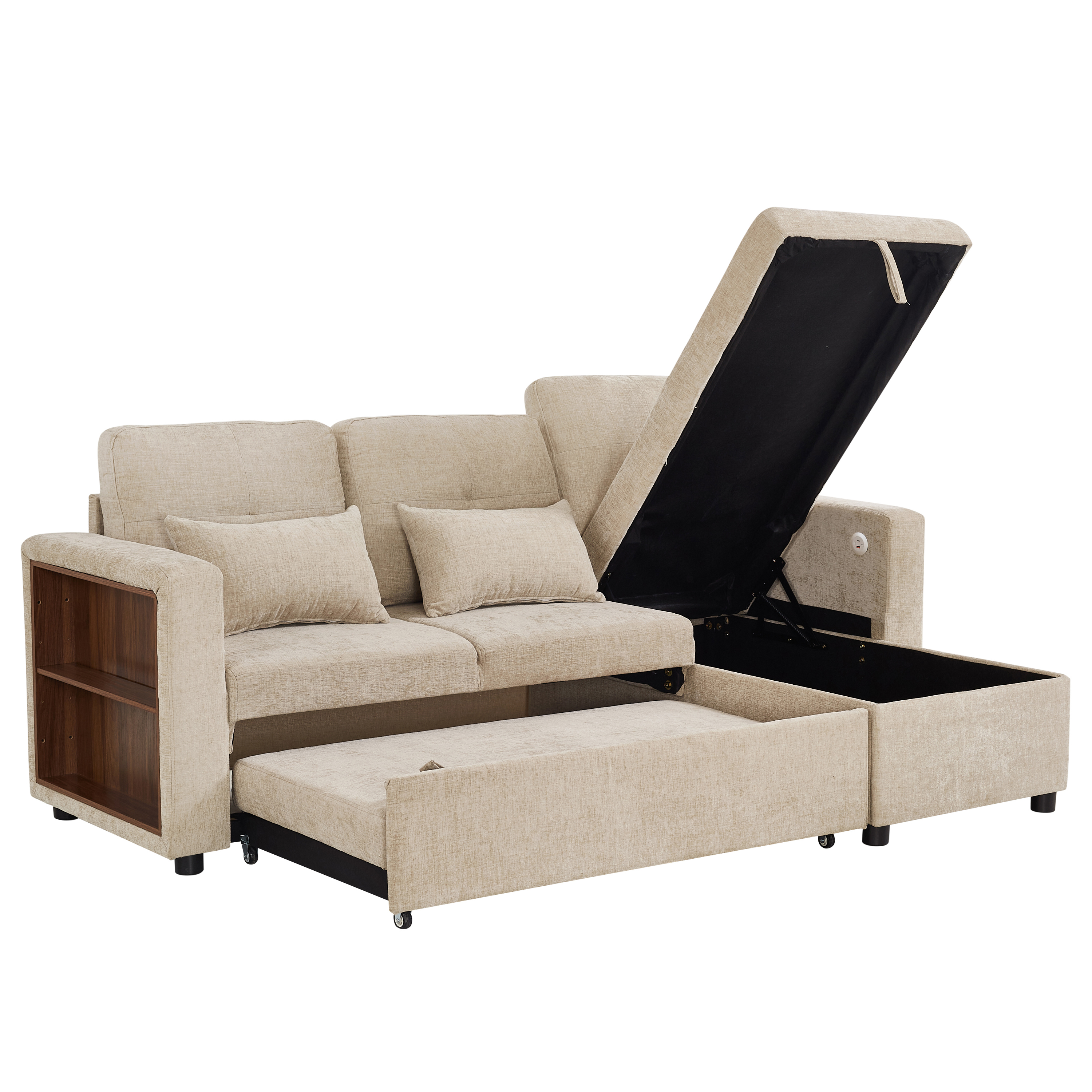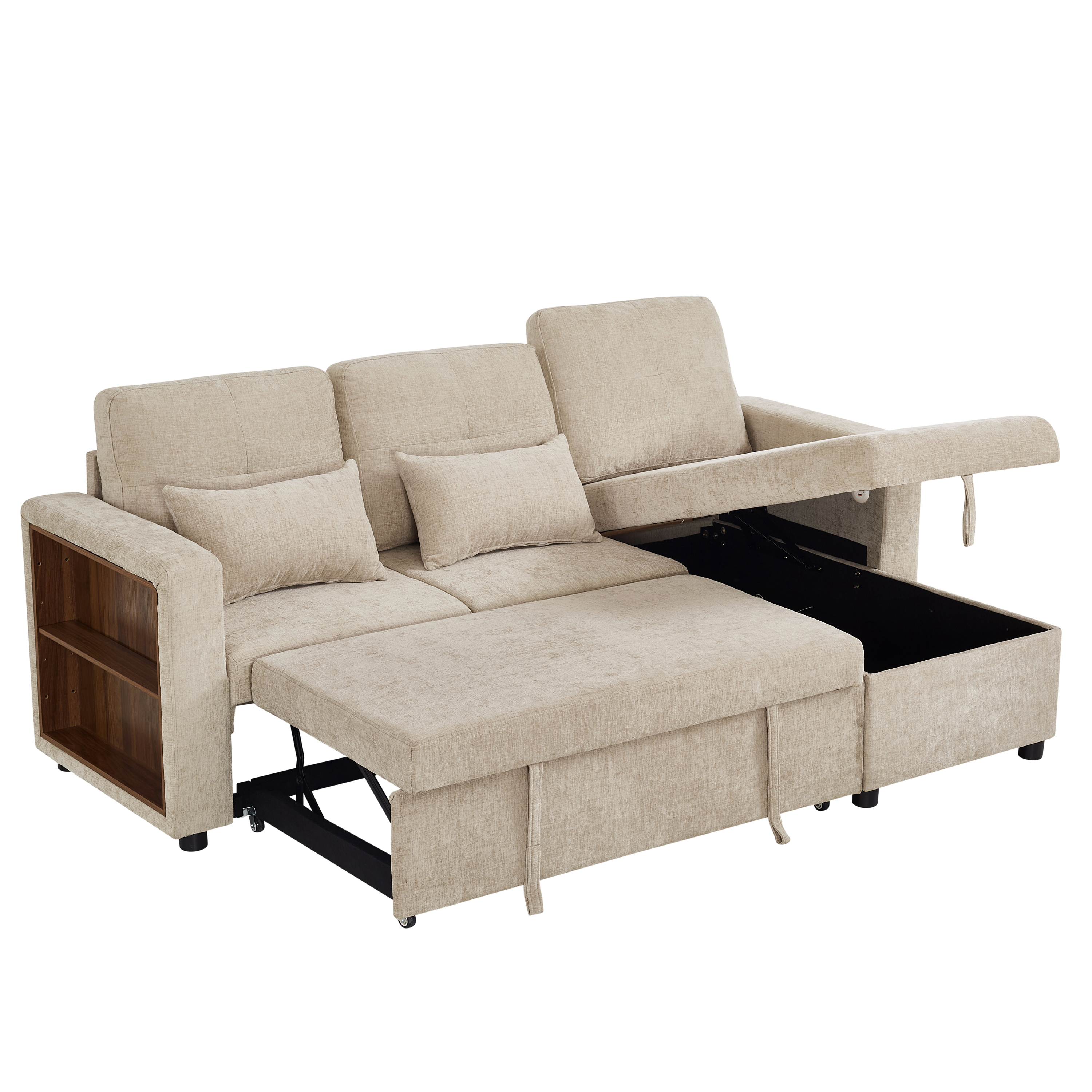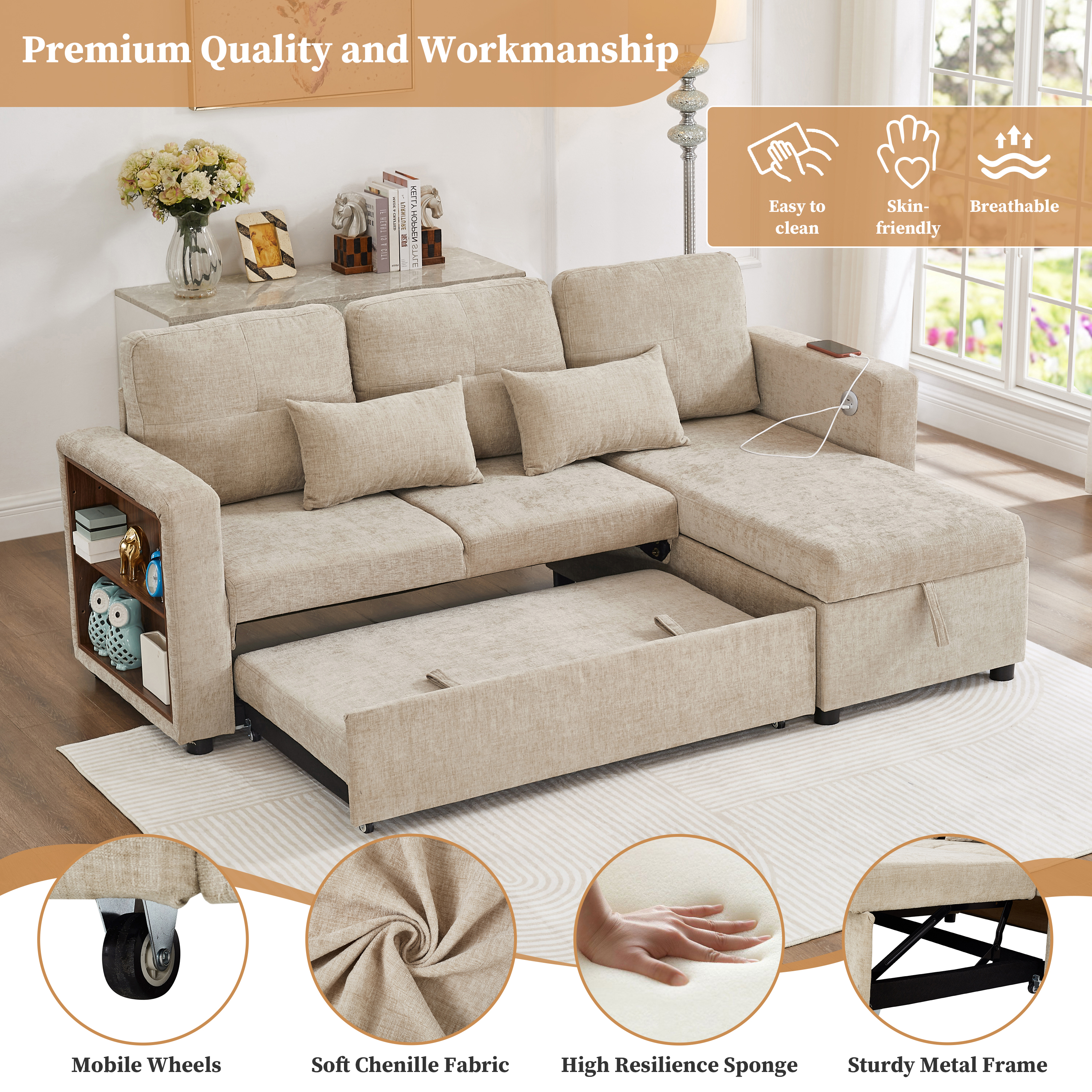 Product Name:3-in-1 Convertible Chenille Sectional Sofa Bed with Reversible Storage Chaise, L-Shaped Sleeper Sofa with Integrated Charging Station and Adjustable Armrest Side Storage, USB & Type-C Ports, Beige