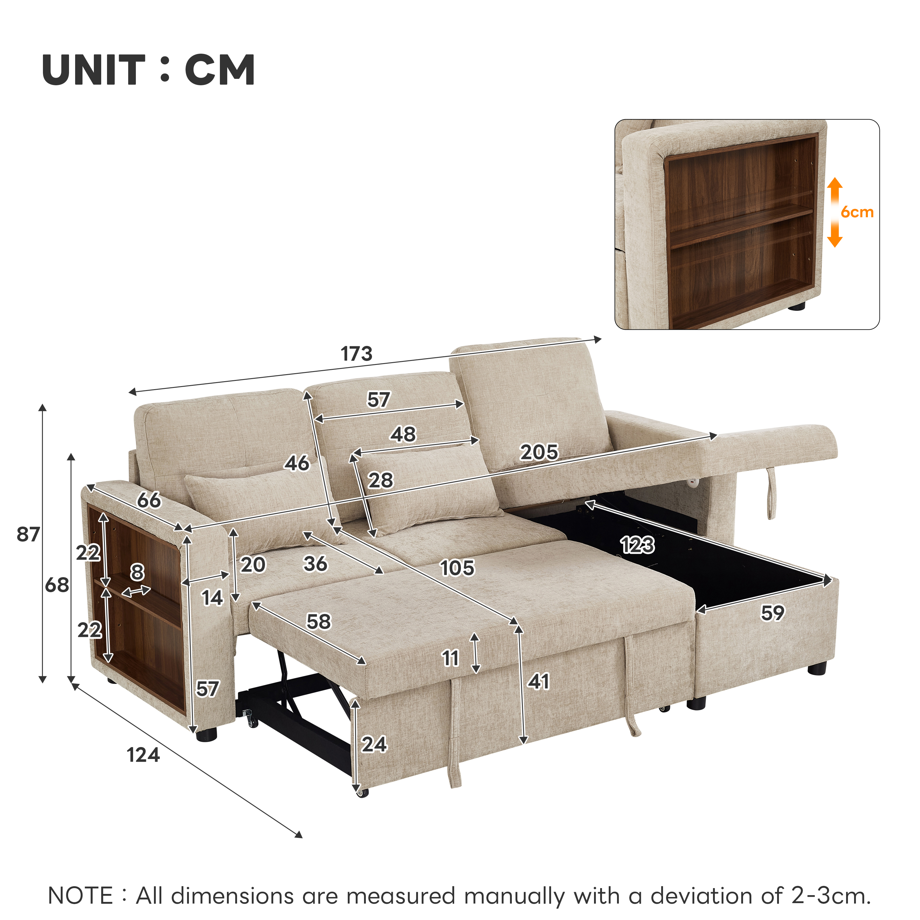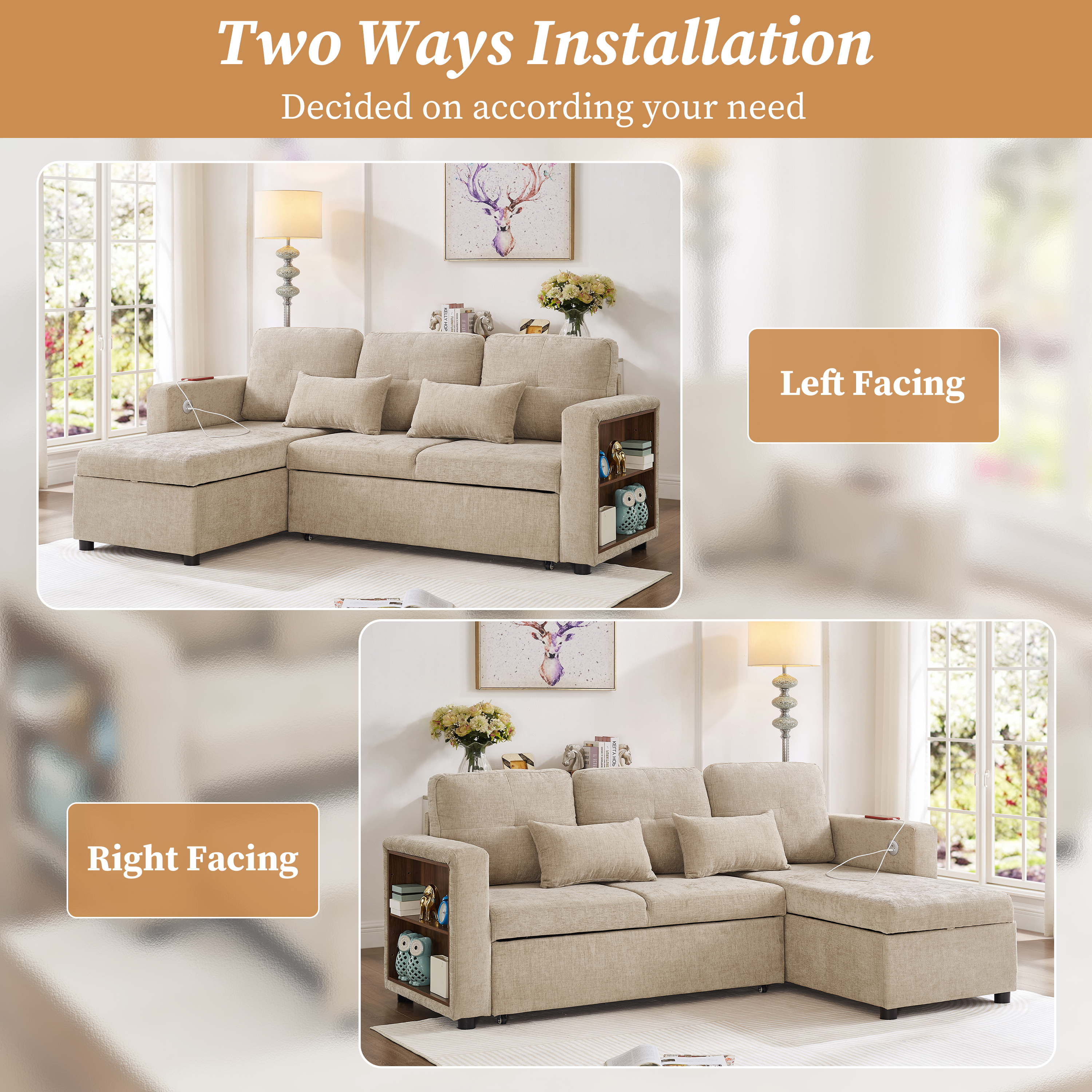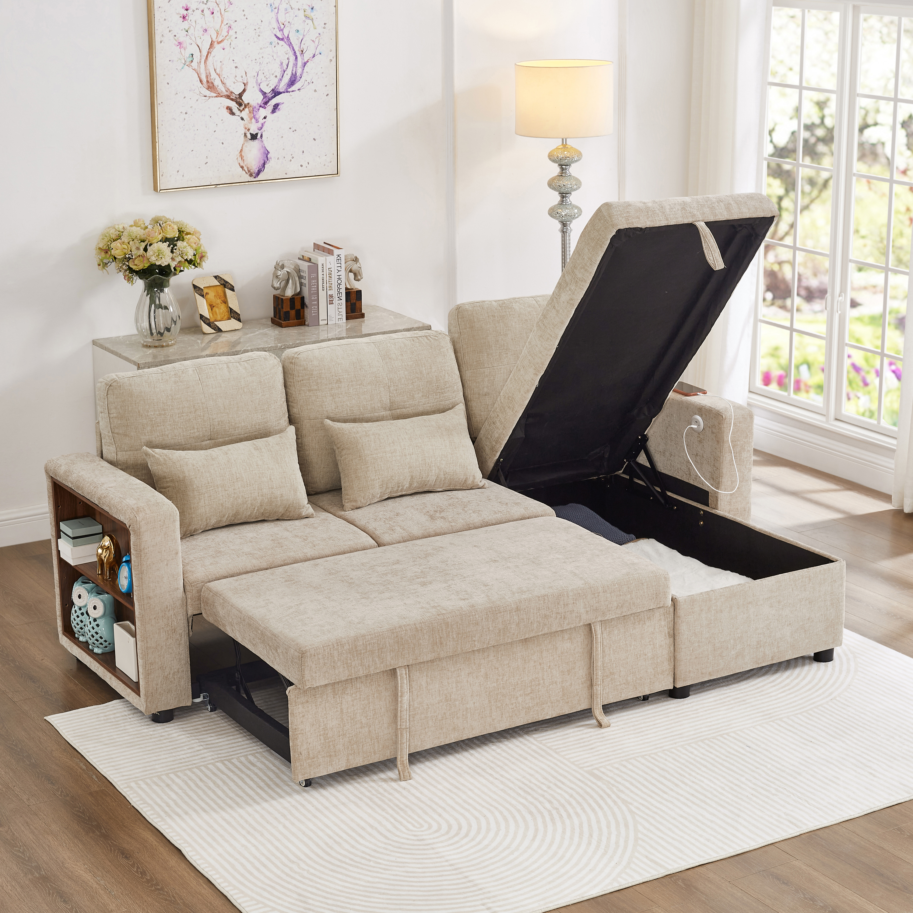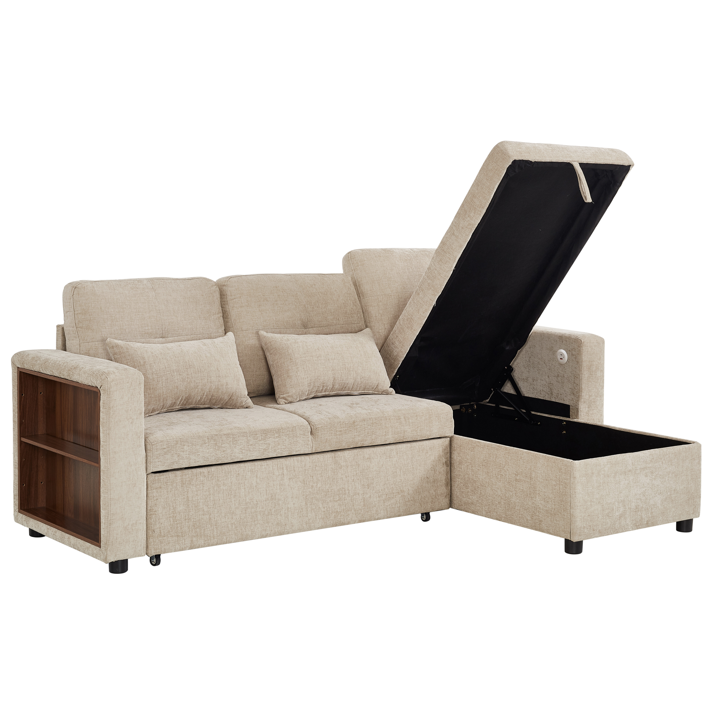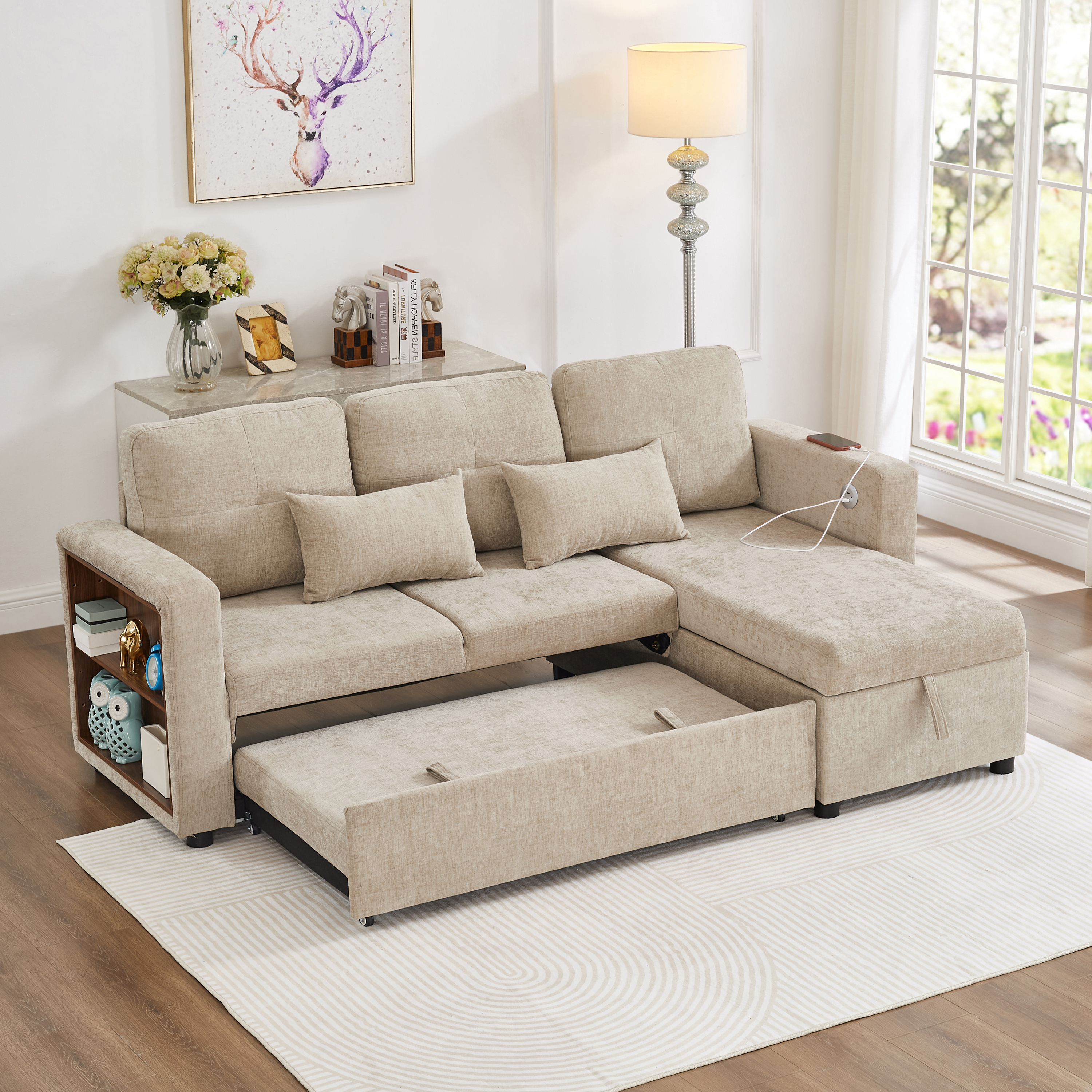 Product Name:3-in-1 Convertible Chenille Sectional Sofa Bed with Reversible Storage Chaise, L-Shaped Sleeper Sofa with Integrated Charging Station and Adjustable Armrest Side Storage, USB & Type-C Ports, Beige