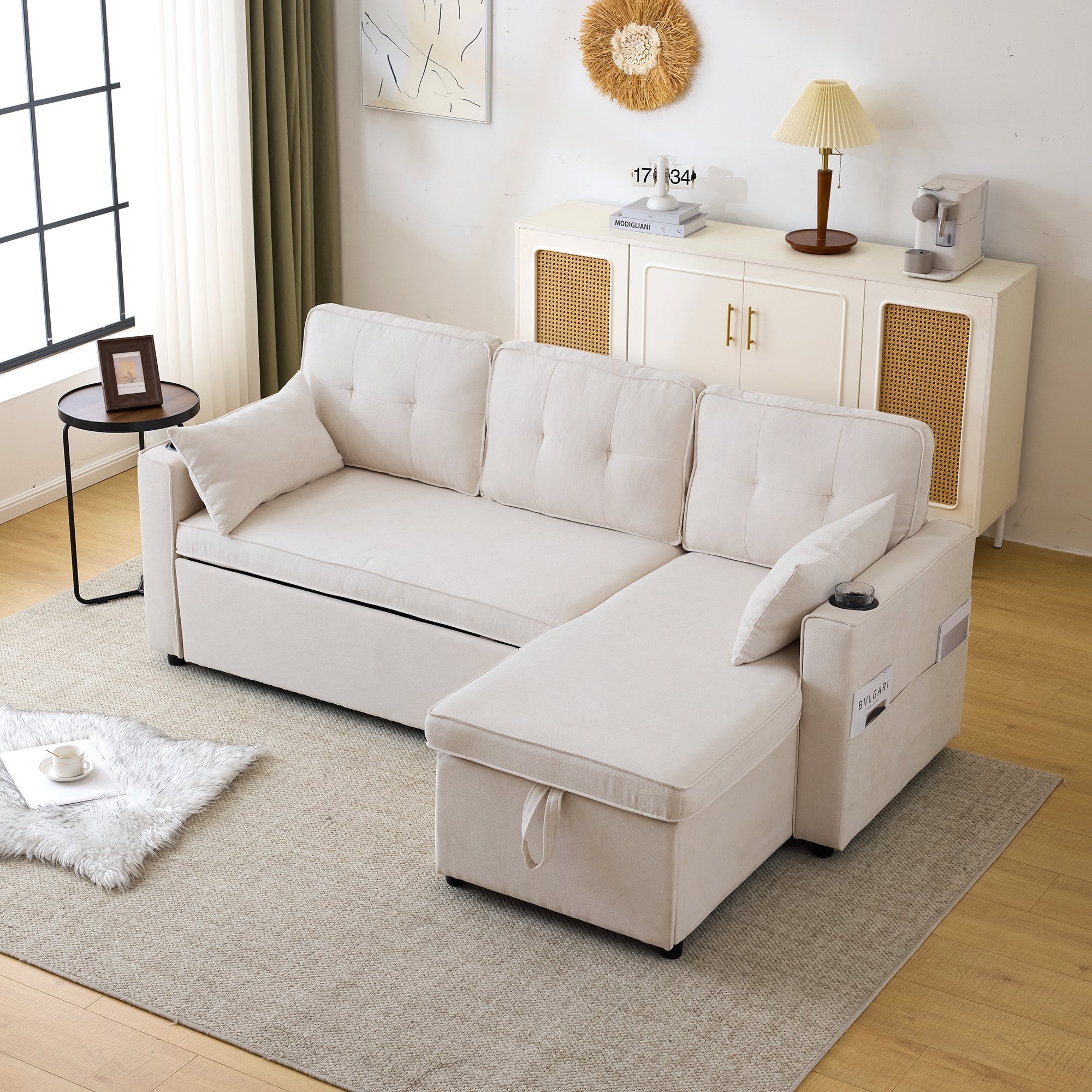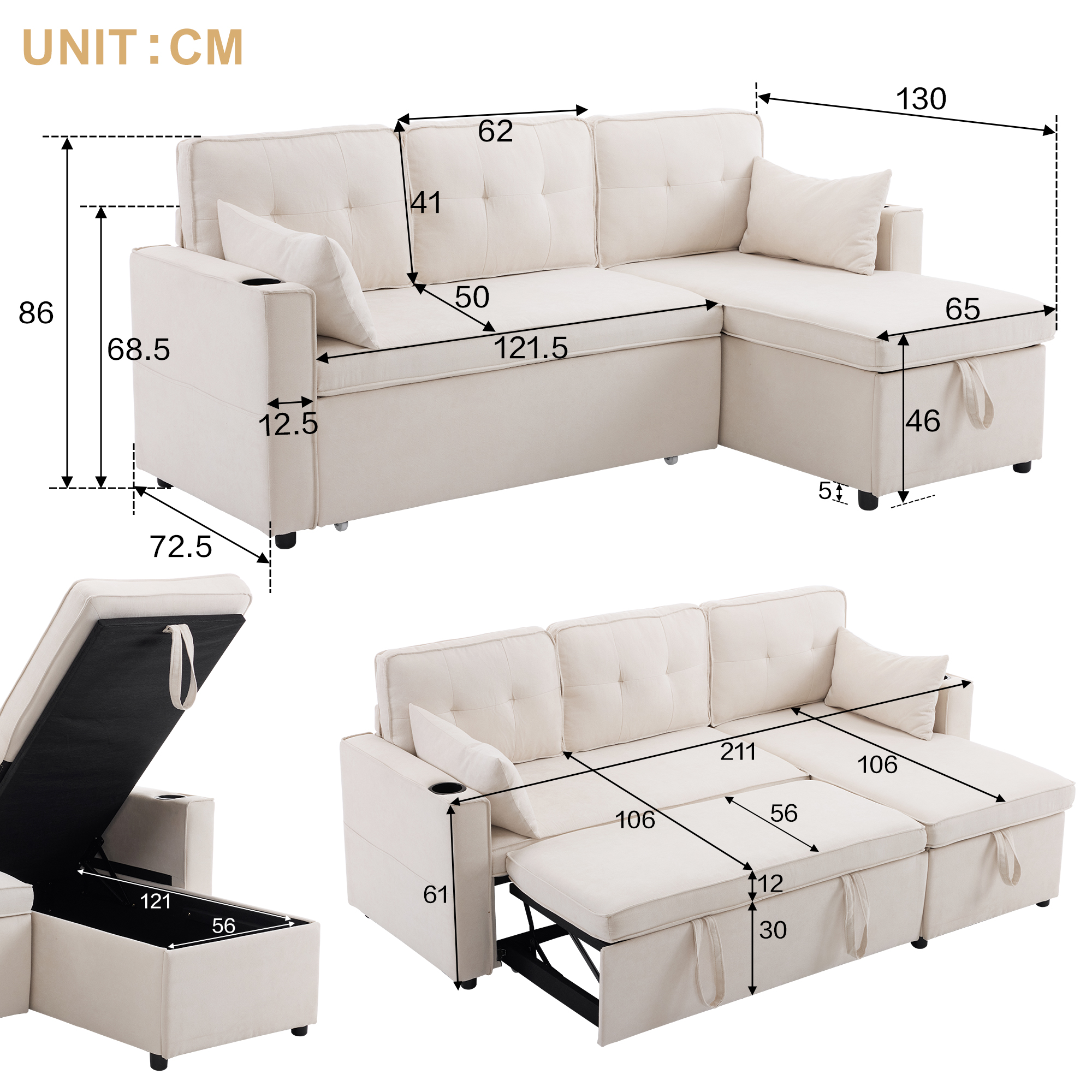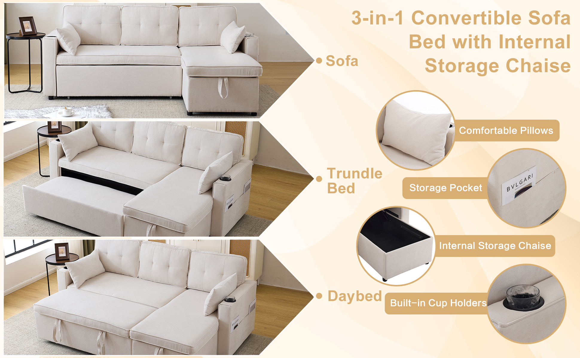 Product Name:3-in-1 Convertible Sofa Bed with Internal Storage Chaise, L Shaped Sleeper Sofa Couches with Cup Holders, Pillows and Storage Pocket. Pullout Sectional Daybed for Living Room/Bedroom/Office, Beige