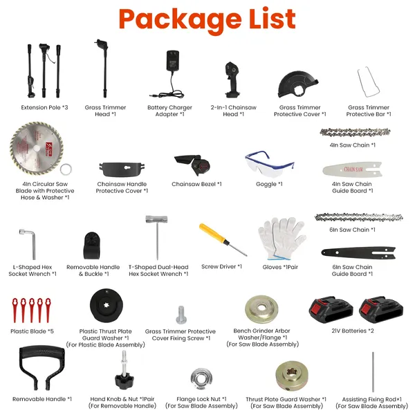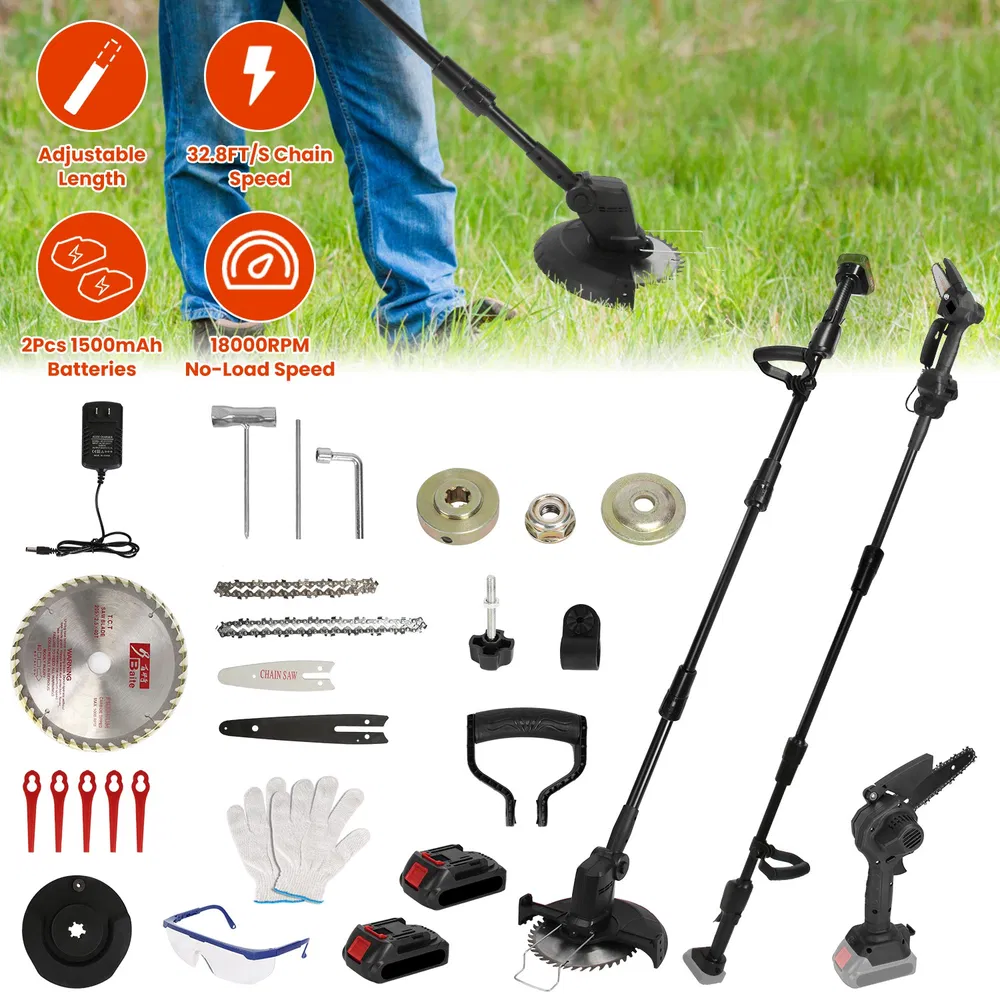 3-in-1 Cordless Electric Pole Saw & Mini Chainsaw & Grass Trimmer Kit With Adjustable Length 2Pcs 21V 1500mAh Batteries 4in/6in Chains Saw Blade 5Pcs Plastic Blades