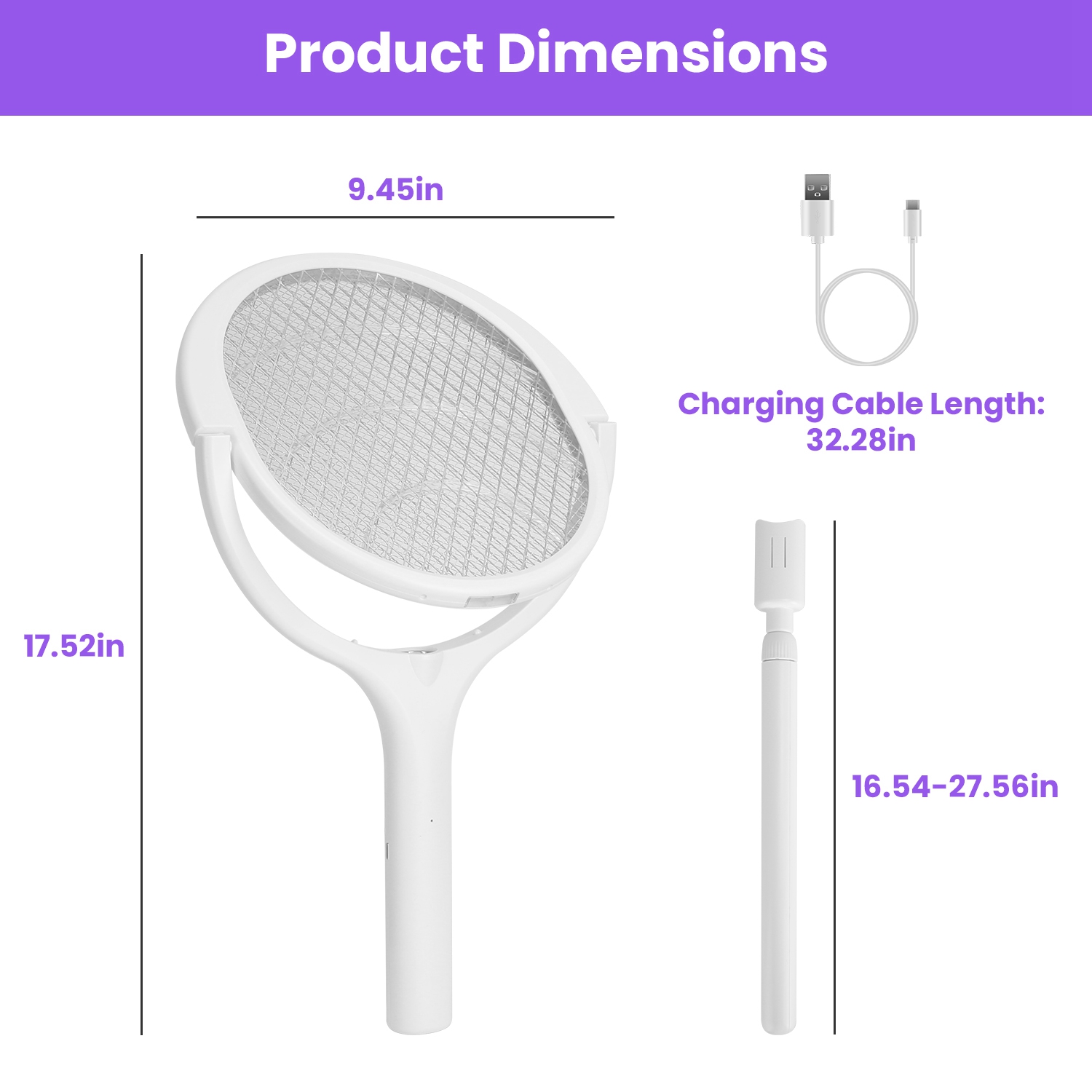 • *Telescopic Extension Wand*:With 16.54-27.56in long telescopic extension wand,this electric bug zapper racket can be extended from 17.52in to 42.91in,capturing all the annoying bugs in high places with ease.