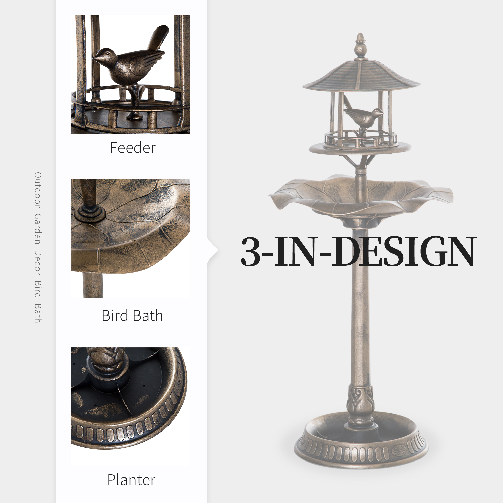 3-in-1 Garden Bird Bath Bowl Pedestal With Bird Feeder, Large Water Basin, Underneath Flower Planter, Bronze
