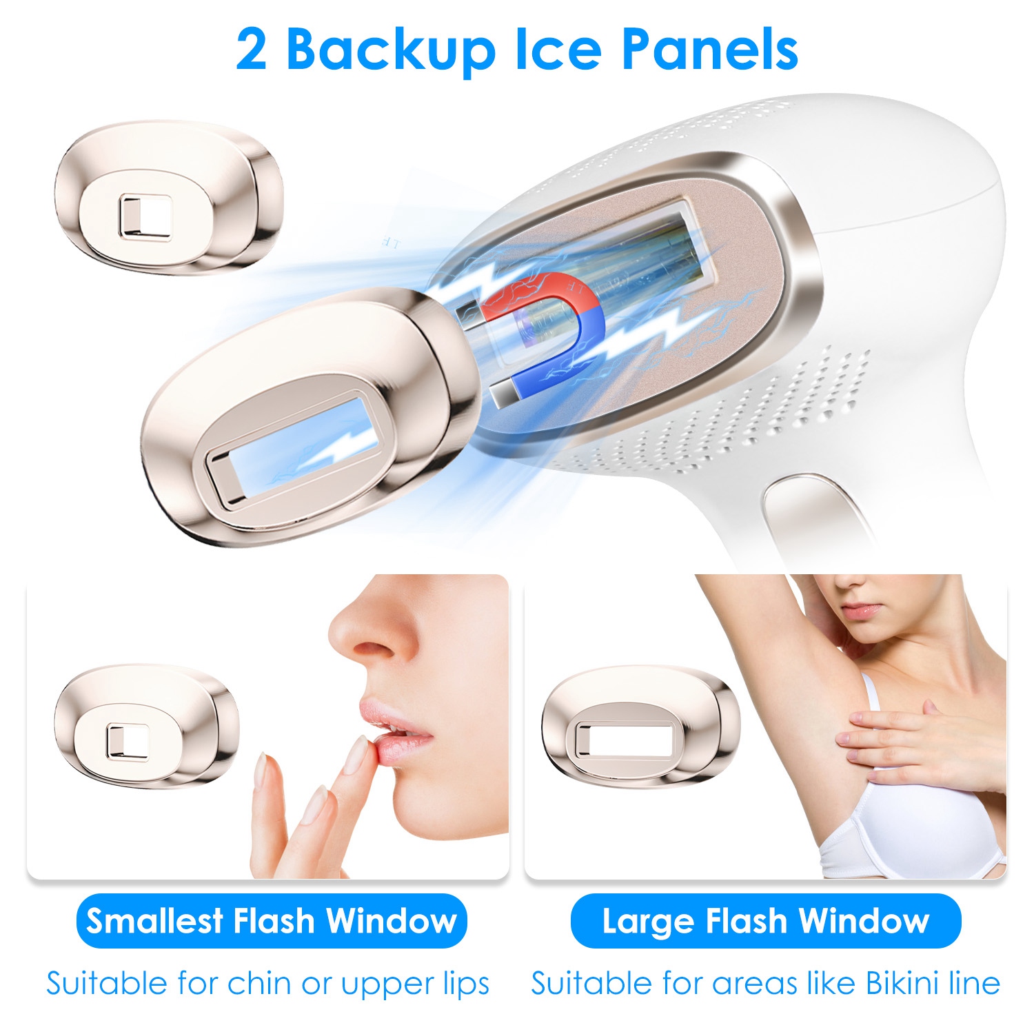 *Ice Cooling & Painless*: Paired with cool ice panel on the falsh window, our Bikini line hair removal keeps your skin temperature ar low as 6°C/42.8°F, which soothes the burning sensation and won't cause skin redness. Make the hair removal treatment painless and skin-friendly. Note:For changing the ice panel,you can make use of the magnetic function on the original ice panel.