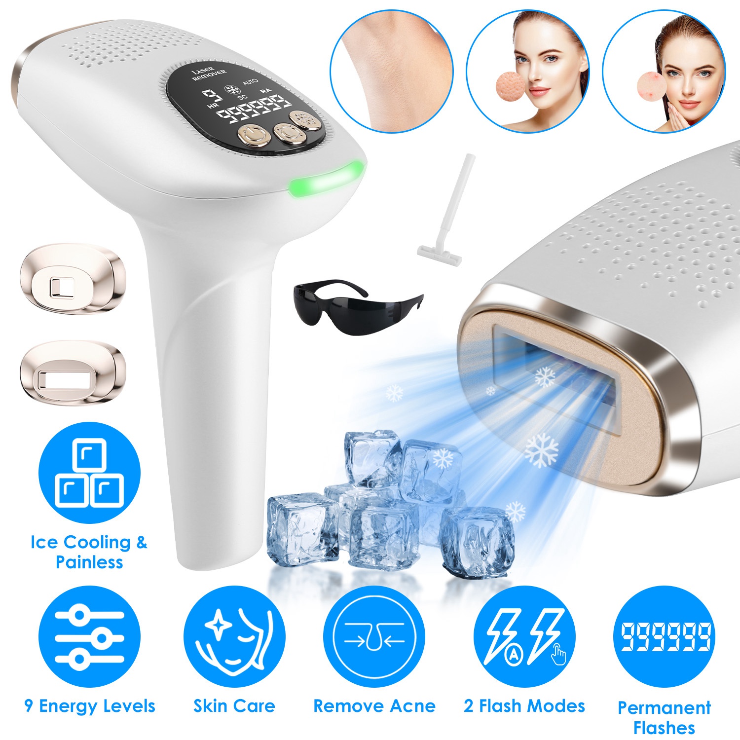 3 In 1 Ice Cooling Laser Hair Removal Painless Permanent At-Home IPL Hair Removal With 999,999 Flashes 9 Energy Levels 2 Modes For Armpits Legs Arms Bikini Line