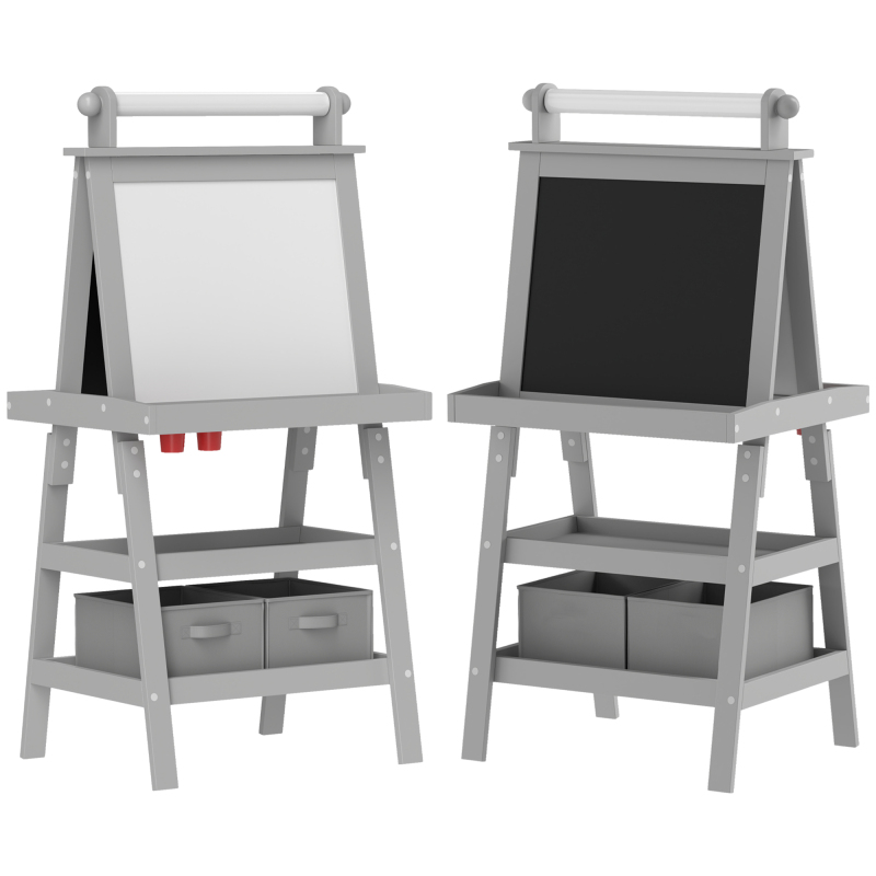 3 In 1 Kids Easel Double-Sided Magnetic Whiteboard And Chalkboard With Paper Roll, Storage Baskets - Grey