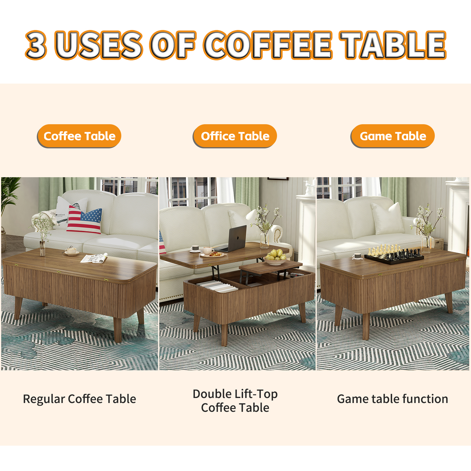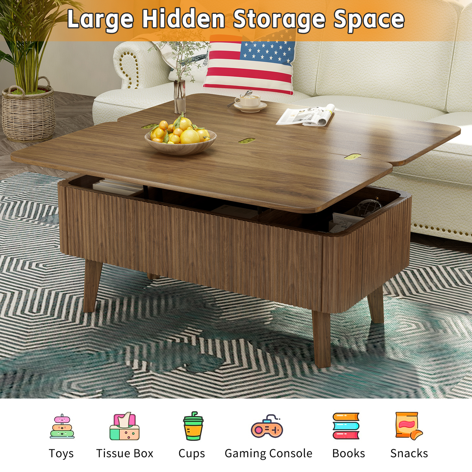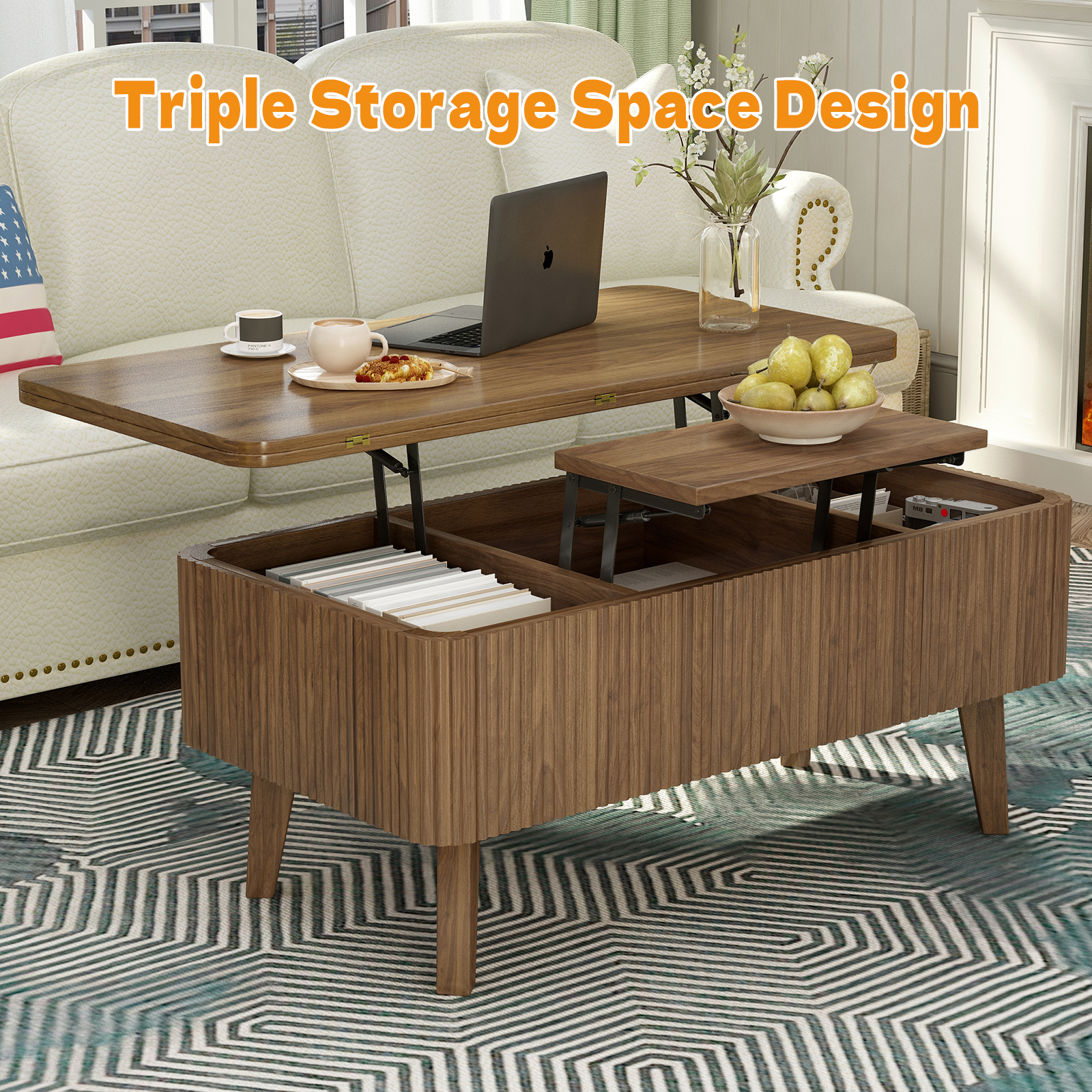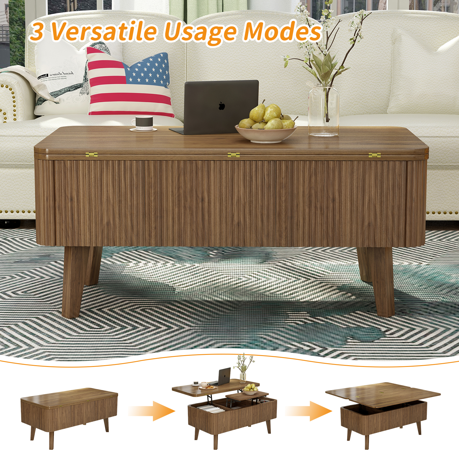 Product Name:3 in 1 Lift Top Coffee Table, Fluted Convertible Coffee Tables Converts to Dining Tables, Modern Oval Wooden Center Table with Storage for Living Room Office Small Space (Walnut)