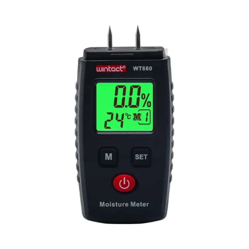 Wood and Building Material Moisture Meter Model: Wintact WT660 Product Features Compact and Portable: Its compact design fits easily into any pocket, allowing you to carry it with you at all times. Durable and Versatile: Suitable for the rapid determination of moisture levels in various wooden materials, such as firewood, plywood, particleboard, veneer, paper, medicinal plants, and bamboo. It is also ideal for measuring the moisture content of building materials like cement mortar, lime mortar, bricks, and more. Applications Proper wood processing requires knowledge of its moisture content. Wood that is too dry or too moist can lead to distortions in wooden objects. The ideal moisture level for wood varies depending on the type of wood, storage location, and its intended use. A wood moisture meter is an essential tool for both hobbyists and professionals in the following settings: Sawmills Carpentry Shops Construction Sites Wood Depots Forestry Sculpture Studios Home Settings Device Functions Measurement Group Selection: Allows you to choose the appropriate measurement group among 4 wood groups and 3 building material groups. Lock Measurement Result: Locks the measurement result on the screen. Battery Level Indicator: Displays the battery level. Automatic or Manual Shutdown: You can choose between automatic and manual shutdown modes. Backlit Screen: Ensures clear data visibility even in low-light conditions. Technical Specifications Wood Moisture Measurement: Measurement Range:6%~40%/6%~50%/6%~60%/6%~70% Resolution:0.10% Measurement Accuracy:+/-2%, 1 mode Number of Measurement Modes:4 Building Material Moisture Measurement: Measurement Range:0%~7.9%/0%~8.5%/0%~15.2% Resolution:0.10% Measurement Accuracy:+/-2%, 1 mode Number of Measurement Modes:3 Other Parameters: Operating Temperature:0°C~40°C Operating Humidity:20%RH ~ 90%RH Automatic Power Off:Yes Probe Length:9.8mm Battery:2×1.5V AAA Weight:44.8g Dimensions:93.5×43×24.4mm
