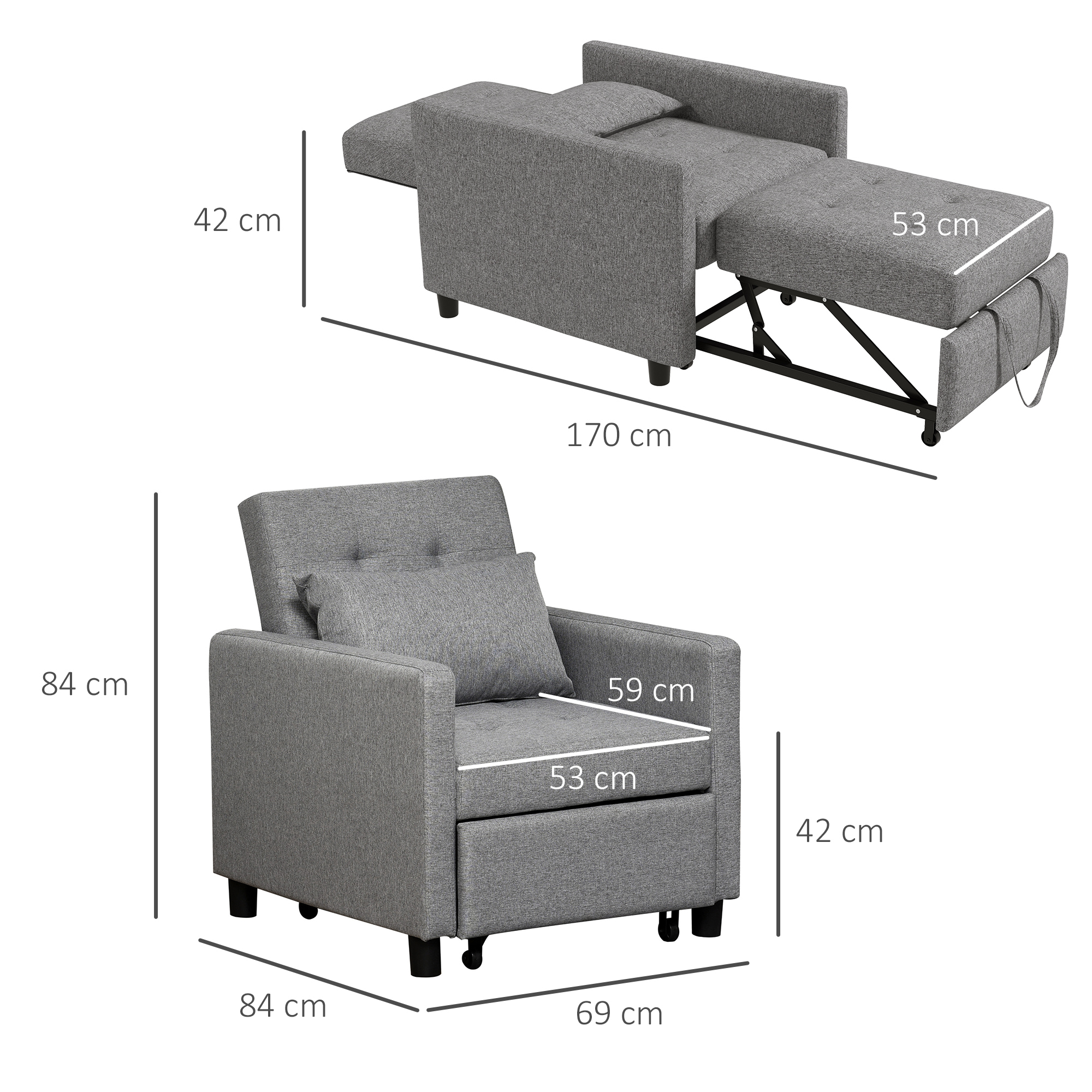 3-In-1 Single Chair Bed With Adjustable Backrest, Pillow And Footrest For Living Room, Grey