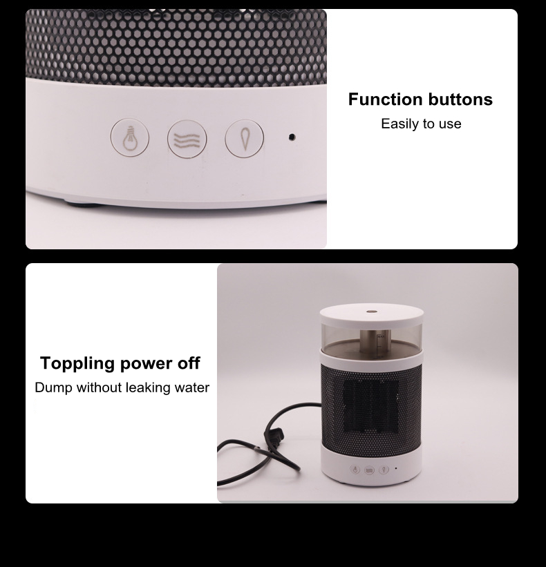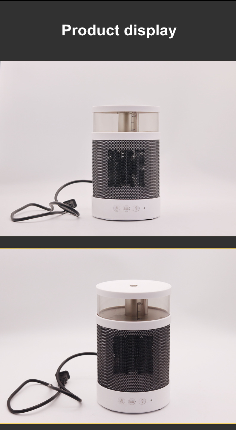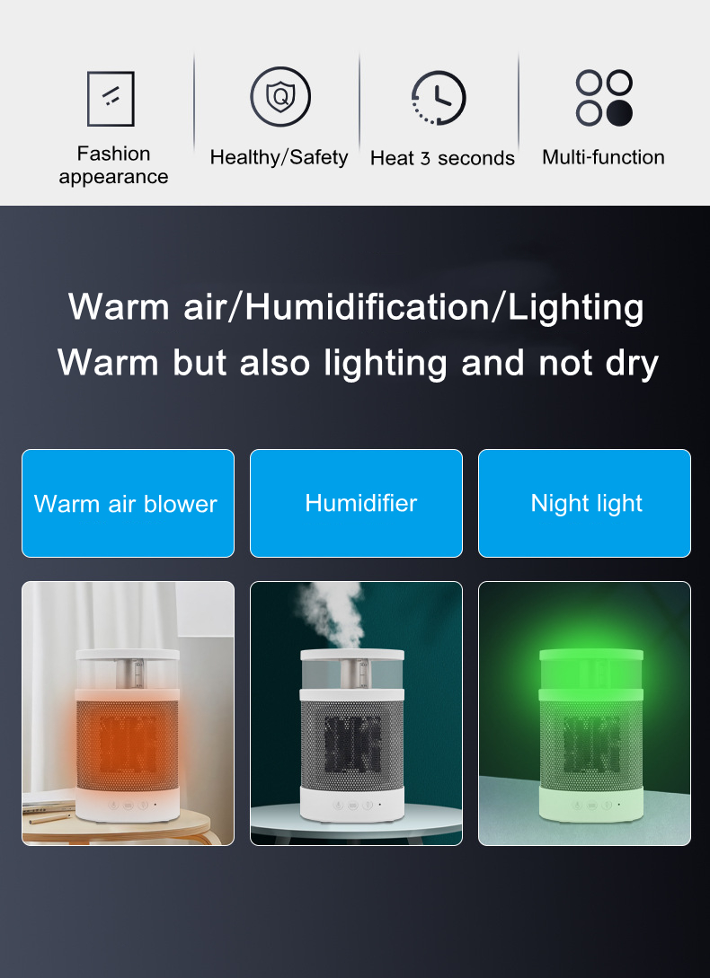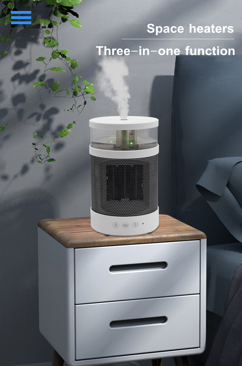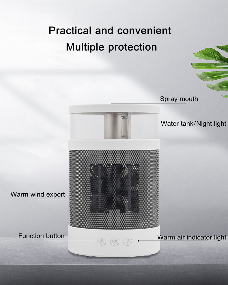 1. This space heater is a small one for indoor use that integrates humidification and heating. Heating will dry the skin, but with the humidification function at the same time, this problem can be well solved; the humidifier has 2 wind speed adjustments, and the heating temperature has 2 adjustments, you can choose according to your own needs; when the temperature reaches 45℃ the space heater will automatically turn off to avoid skin burns; the white appearance, if you are a beauty control, you will like this space heater.