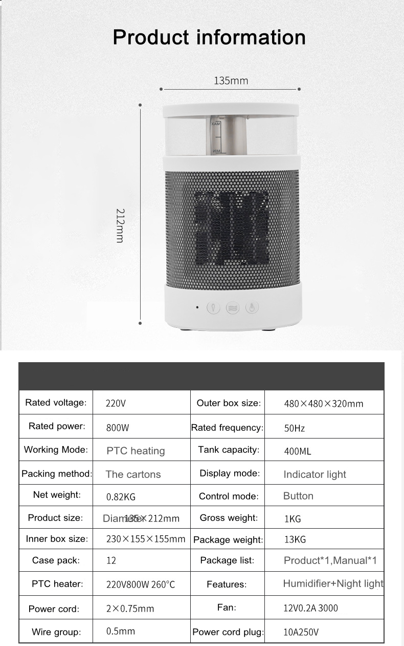 5. The power of this space heater is 800W, and the capacity of the humidifier is 400ml; if you have any questions, you can email us at any time, we are honored to serve you.