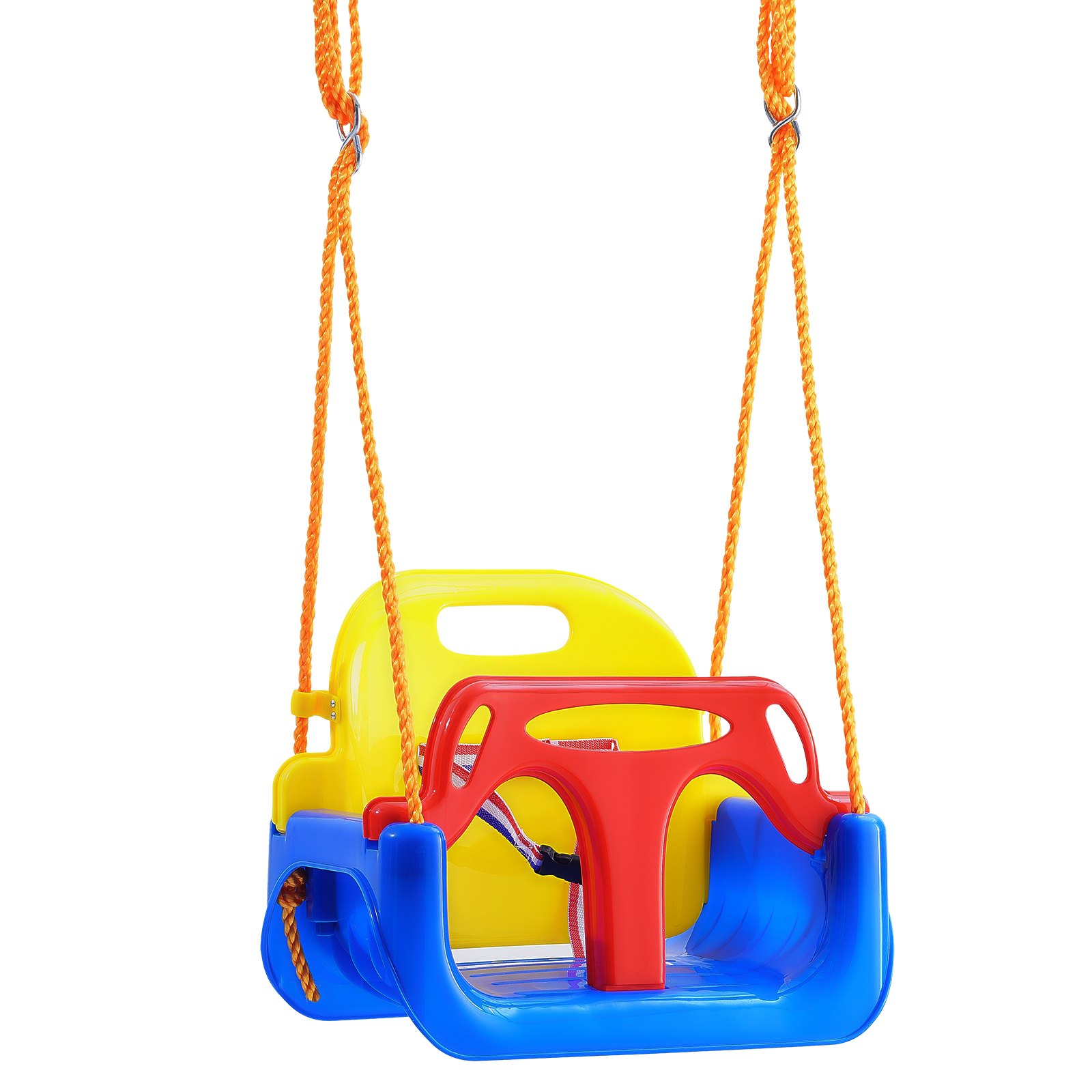 Features & Details 3-in-1 Design: The VEVOR toddler swing seat features a special design suitable for three stages of children: 6-36 months toddlers, 3-6 years old children, and 6-10 years old kids, providing endless fun throughout your child's growth. 200 lbs High Load Capacity: With a maximum load capacity of 200 lbs (90 kg), the swing outdoor can accommodate older children for extended use. It includes an adjustable woven rope, non-slip seat, and snap hooks to ensure safe play. Durable and Reliable: The outdoor swing seat is made from durable PE, designed to withstand outdoor conditions and provide hours of safe fun. The adjustable high-quality PE woven hanging rope is UV-resistant and does not fade over years. Combined with a secure backrest safety belt, it ensures ultimate comfort and safety during play. Ideal Gift: This outdoor swing is a perfect addition to any child's playhouse! Widely used in backyards, playgrounds, trees, swing sets, and more, it encourages children to spend more time outdoors and enjoy a happy childhood, making it an excellent gift for kids. Safety Certified:Our toddler swing outdoor is CE/CPC certified for your peace of mind. Safety is our top priority when children are playing. There is no need to worry about the quality.