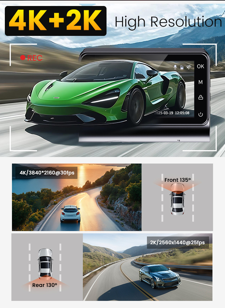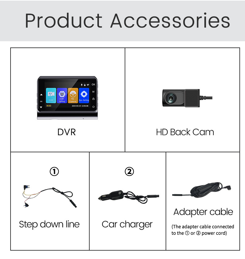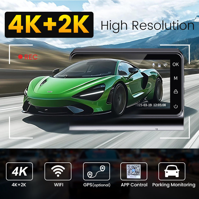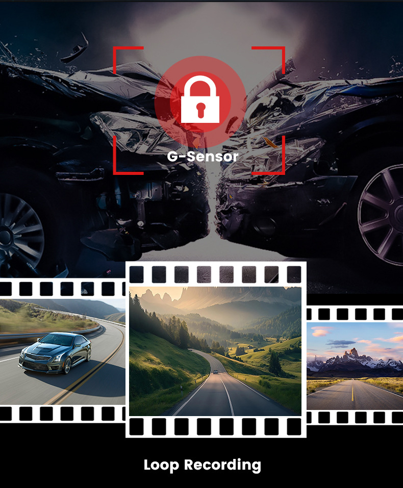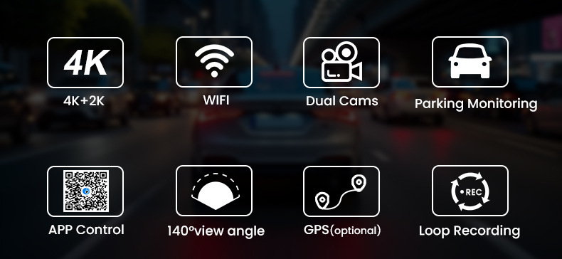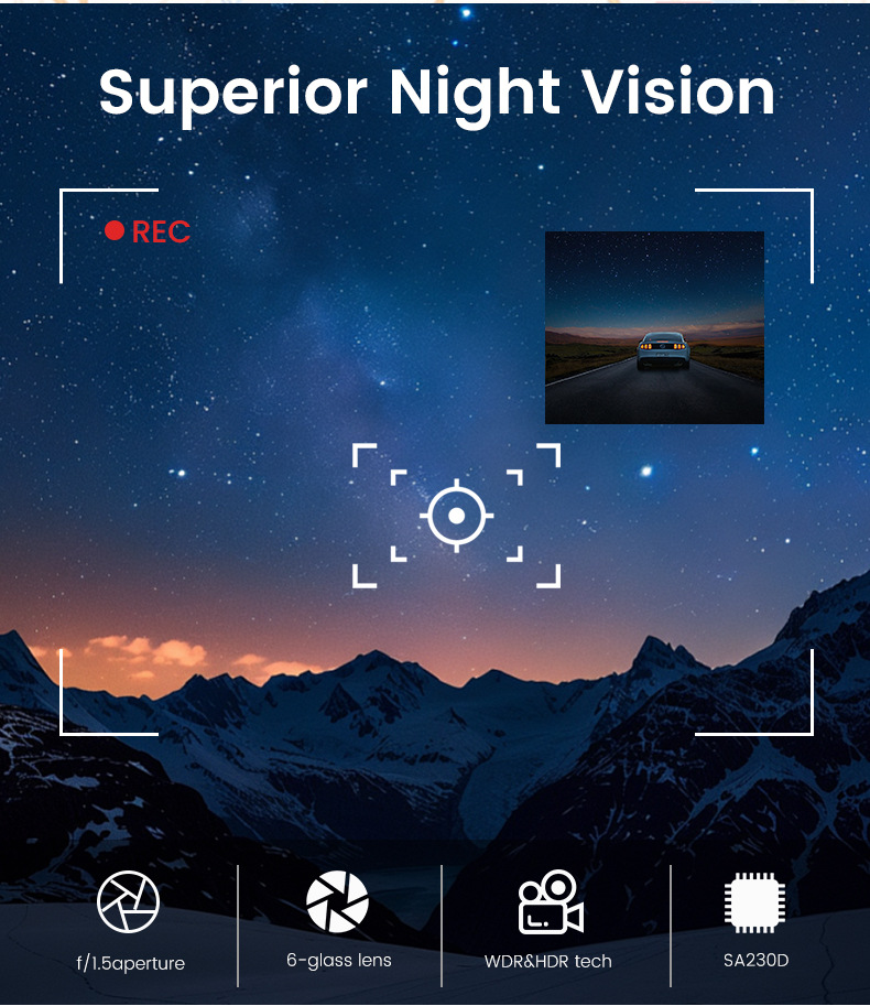 Functions: Rearview camera, loop recording, parking monitoring, collision detection, enhanced night vision, front-and-rear dual recording