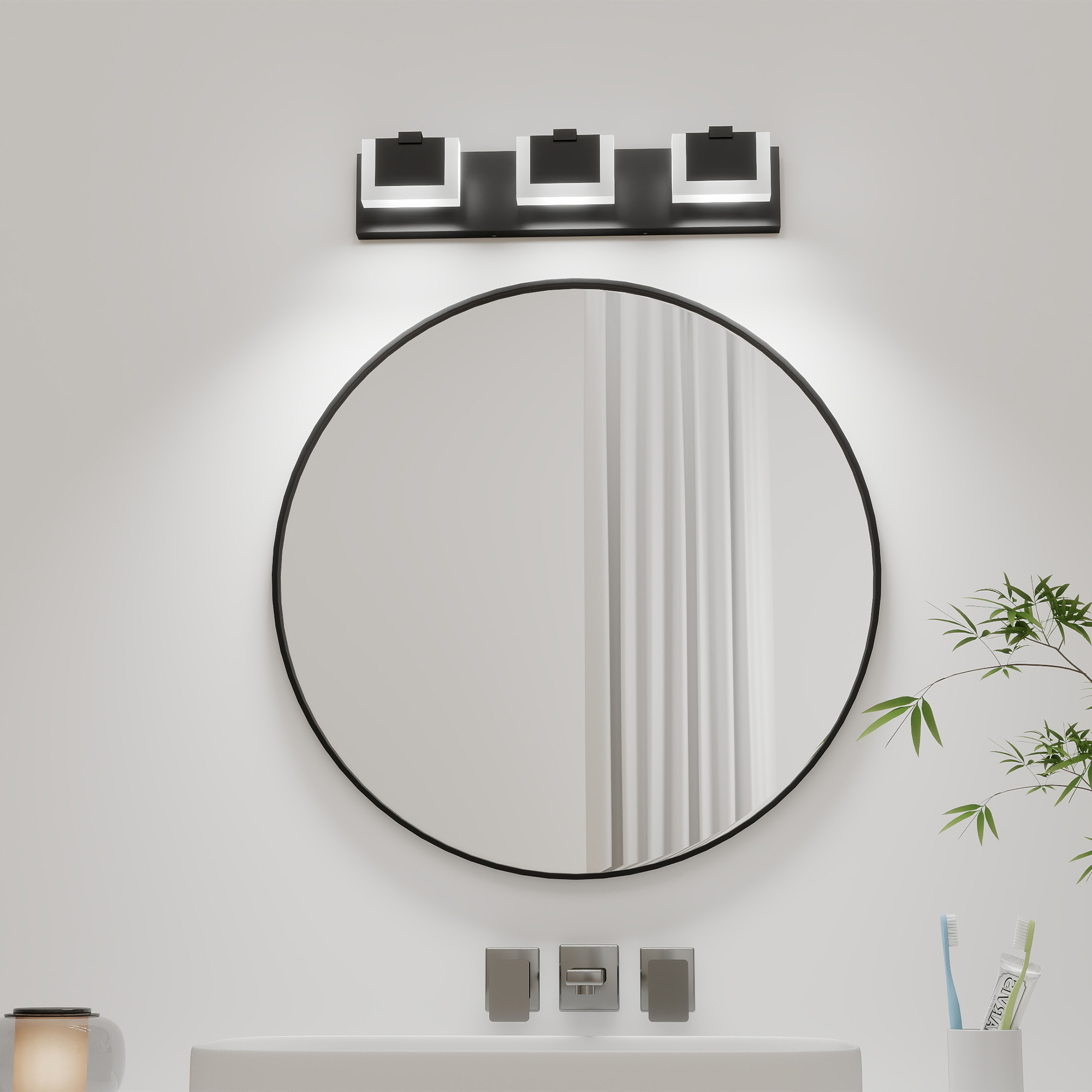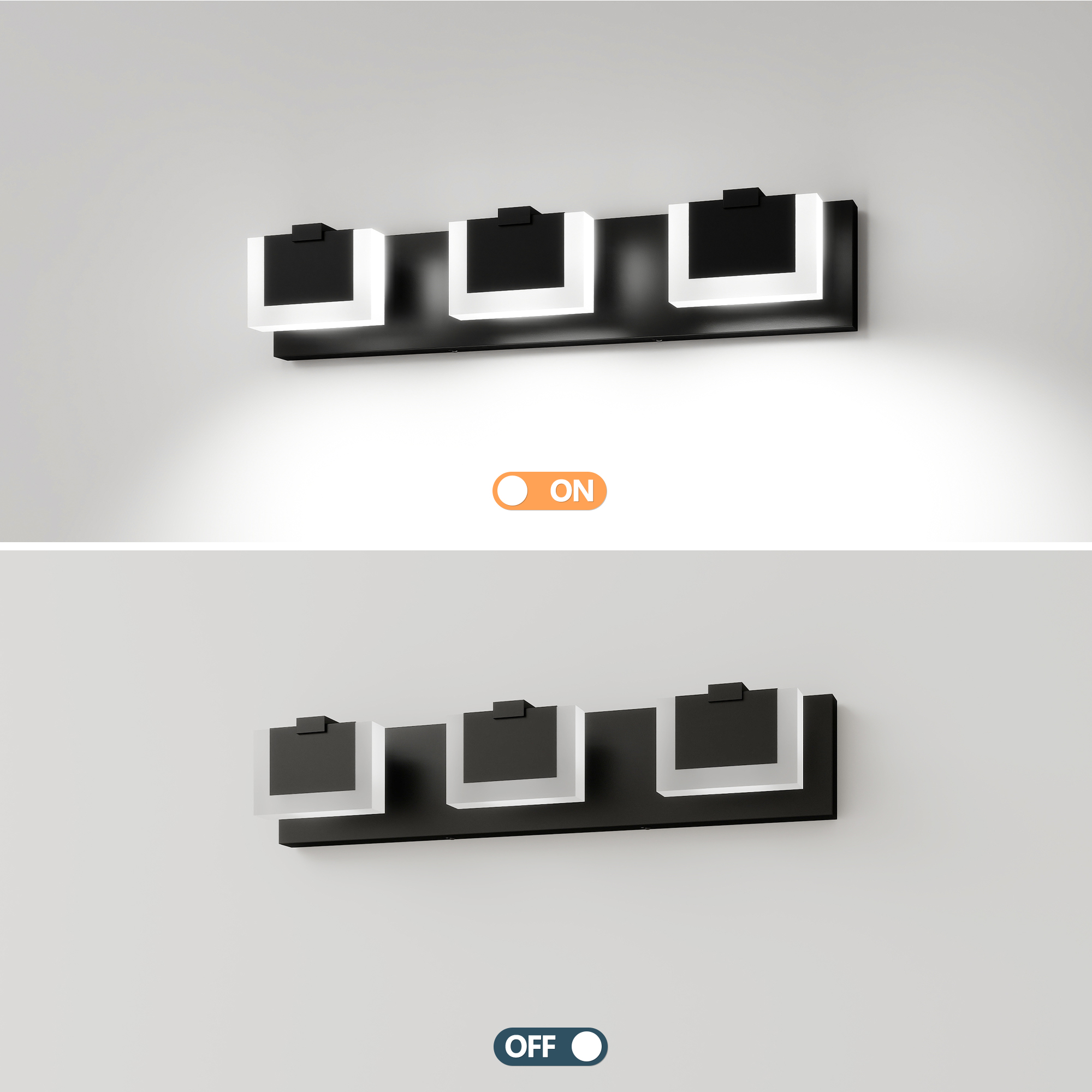 Modern and Minimalist: Up and Down Light creating a beautiful lighting effect.The luxurious and fashionable Bathroom Vanity Light fixtures design accords with the ultimate pursuit of modern people. The light comes from LED source and with a uniform light-emitting by going through the frosted acrylic.Easy to Install: Hard Wired. No switch or cord on these bathroom light fixtures. Just connect to the reserved wire directly. Suitable for US junction box standard.High Quality Material:Black aluminum frame,strong corrosion resistance.Solid thick frosted acrylic shade,releasing bright light effect.(LED Light include)Double output light effect:Up and down light design,bright and not dazzling.