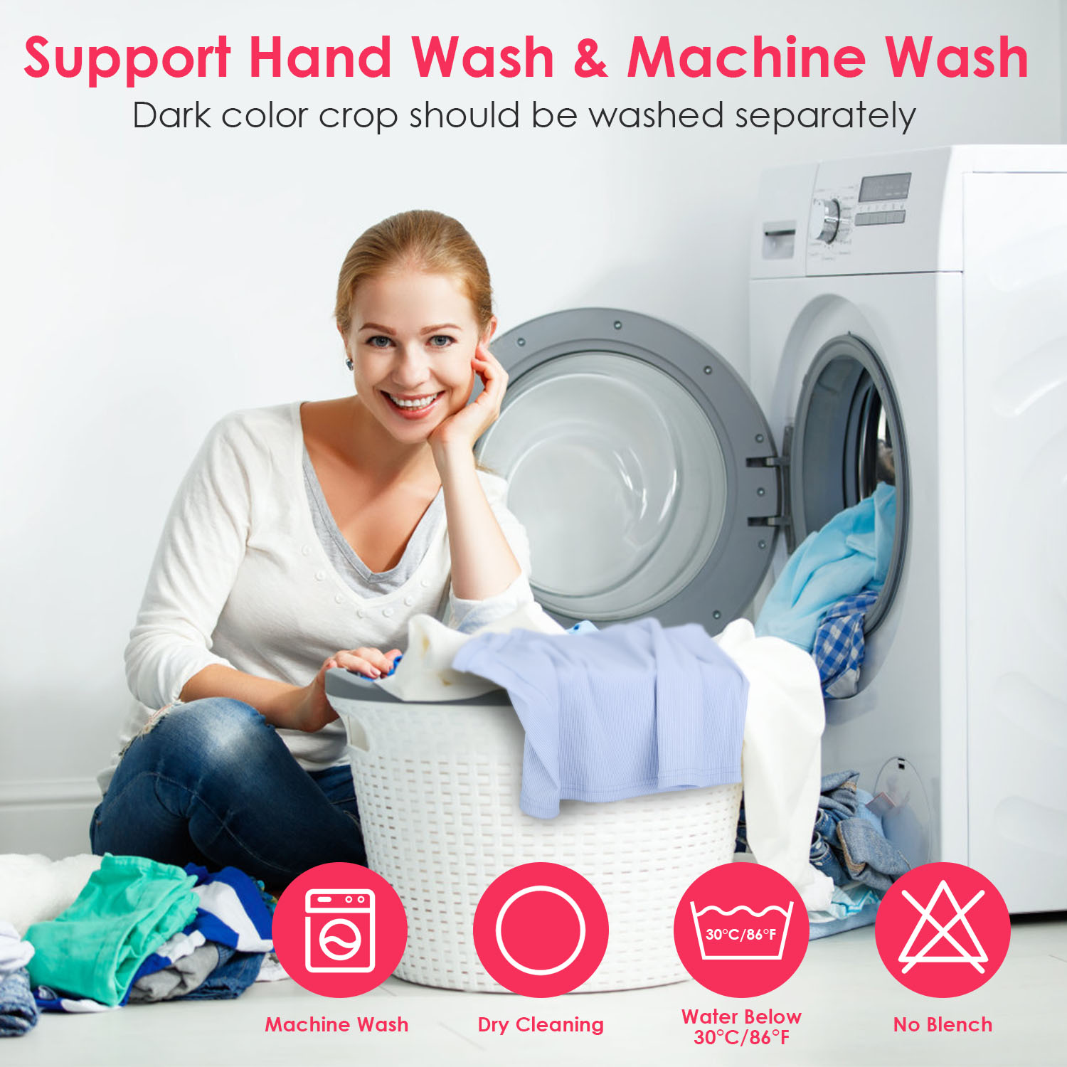 *Machine & Hand Washing*:Support hand wash or machine wash,but please note that the water temperature must be kept below 30°C/86°F. It can be dried but not bleached. Dark color crop should be washed separately.