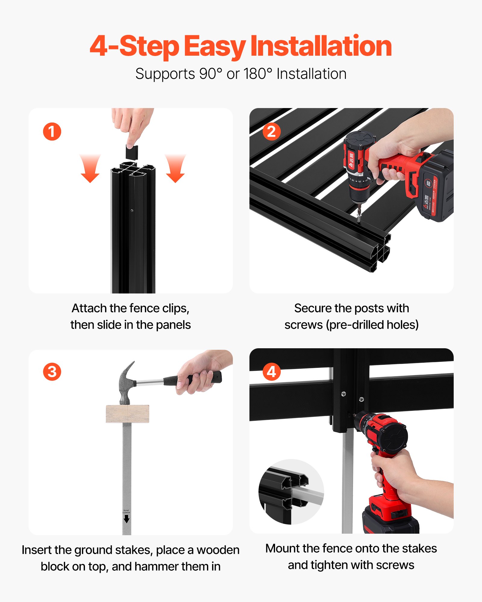 Easy Installation: The vinyl fence features a slide-in grooved design with detailed instructions, allowing panels to be inserted and secured with screws—no extra drilling needed. Flexible layout options include 90° L-shape or 180° straight arrangements, and additional panels can be added to expand coverage for different needs