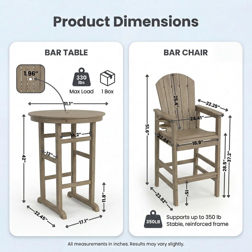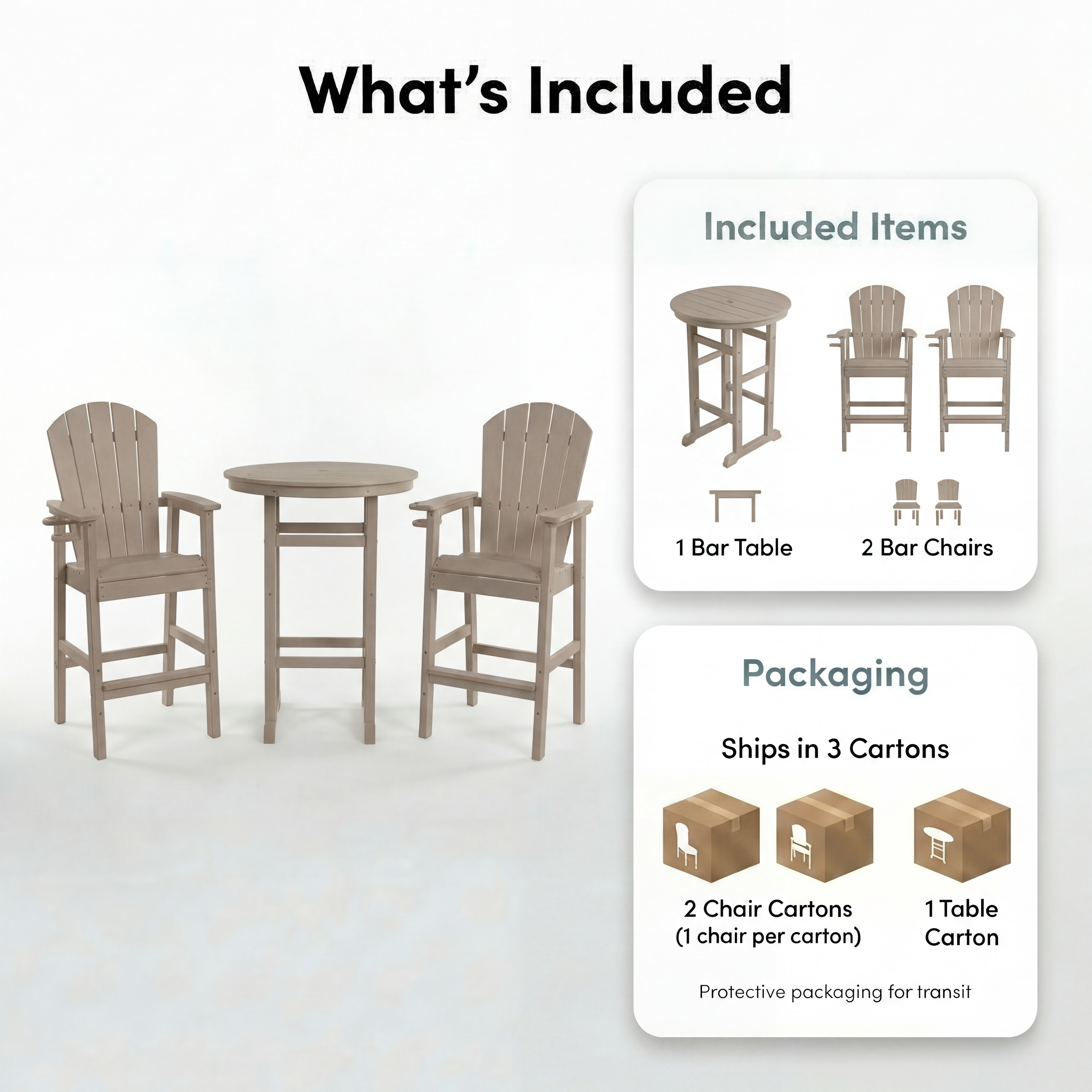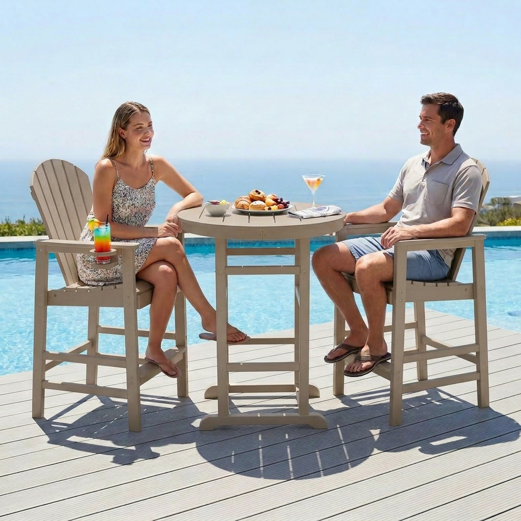 Product Name:3-Piece Antique Wood HDPE Indoor/Outdoor Bar Height Bistro Set, 31.1" Round Pub Table with 2 Bar Stools, All-Weather Patio Furniture for Balcony, Deck, Poolside & Coastal Use