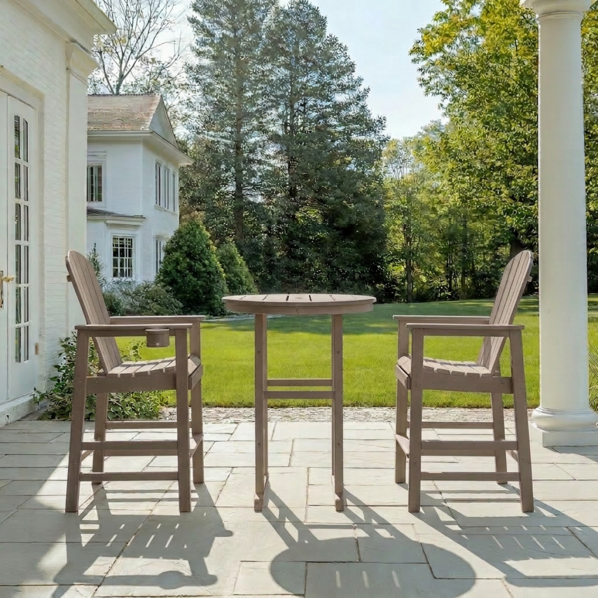 3-Piece Antique Wood HDPE Indoor Outdoor Bar Height Bistro Set, 31.1 Round Pub Table With 2 Bar Stools, All-Weather Patio Furniture For Balcony, Deck, Poolside & Coastal Use