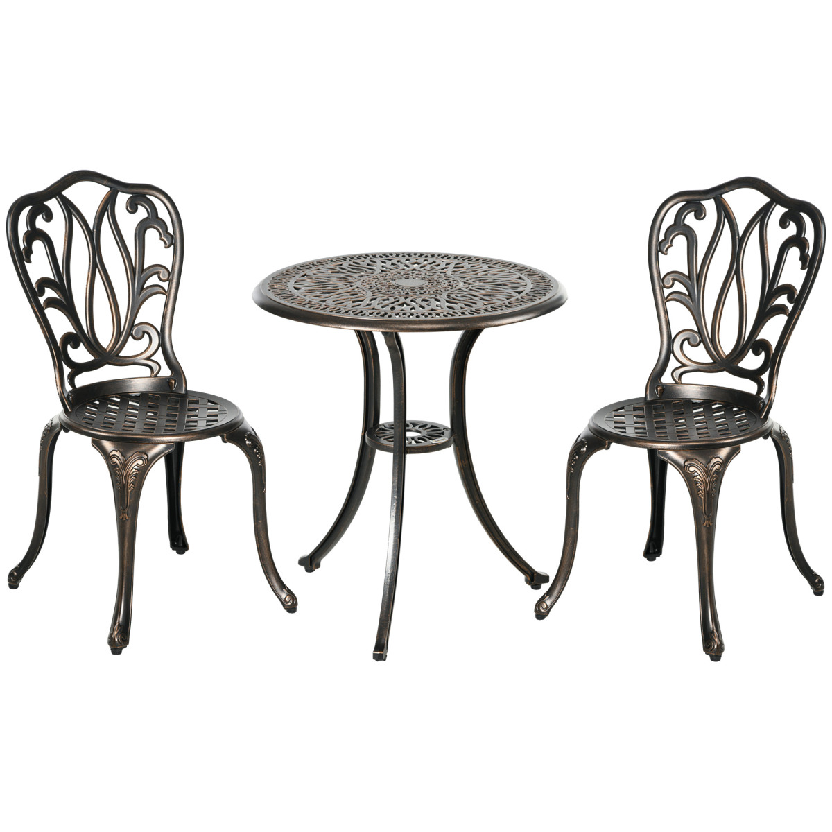 Add a touch of elegance to your outdoor areas with this set. Includes two chairs and a matching table. Centre umbrella hole to hold a parasol in place. Garden table and chairs are made from aluminium for strength, with the decorative patterns for a decorative finish.