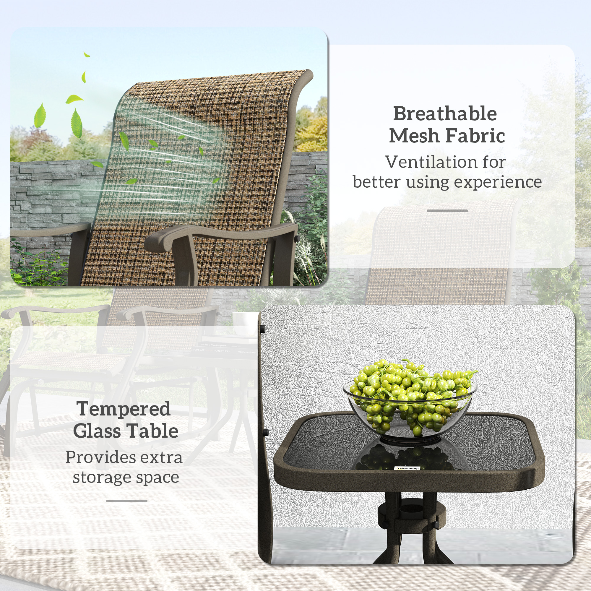 - Strong Structure: This patio set features a unique blend of ventilating mesh fabric on a solid steel body for maximum comfort and durability.