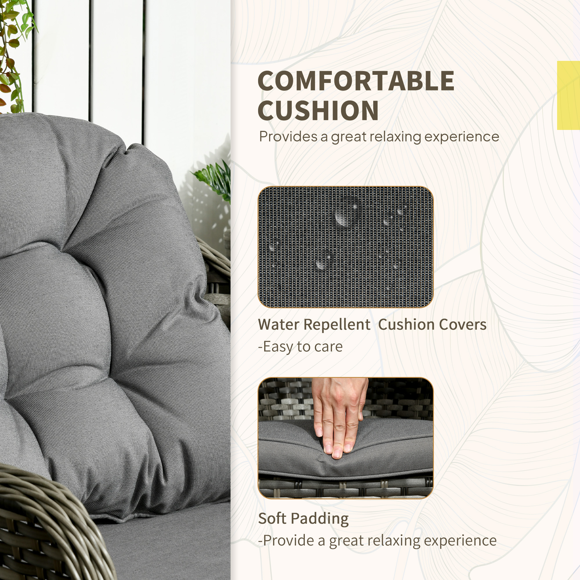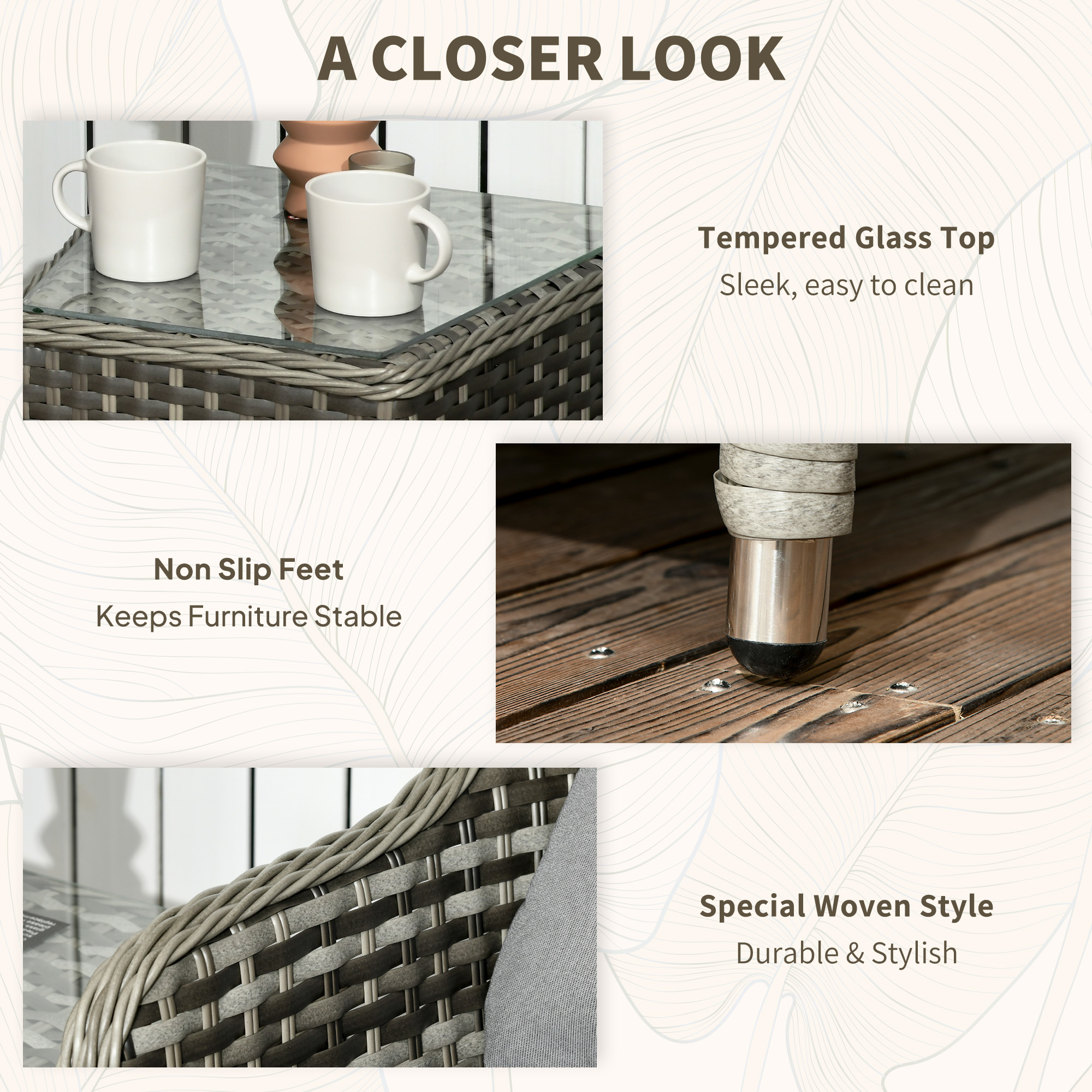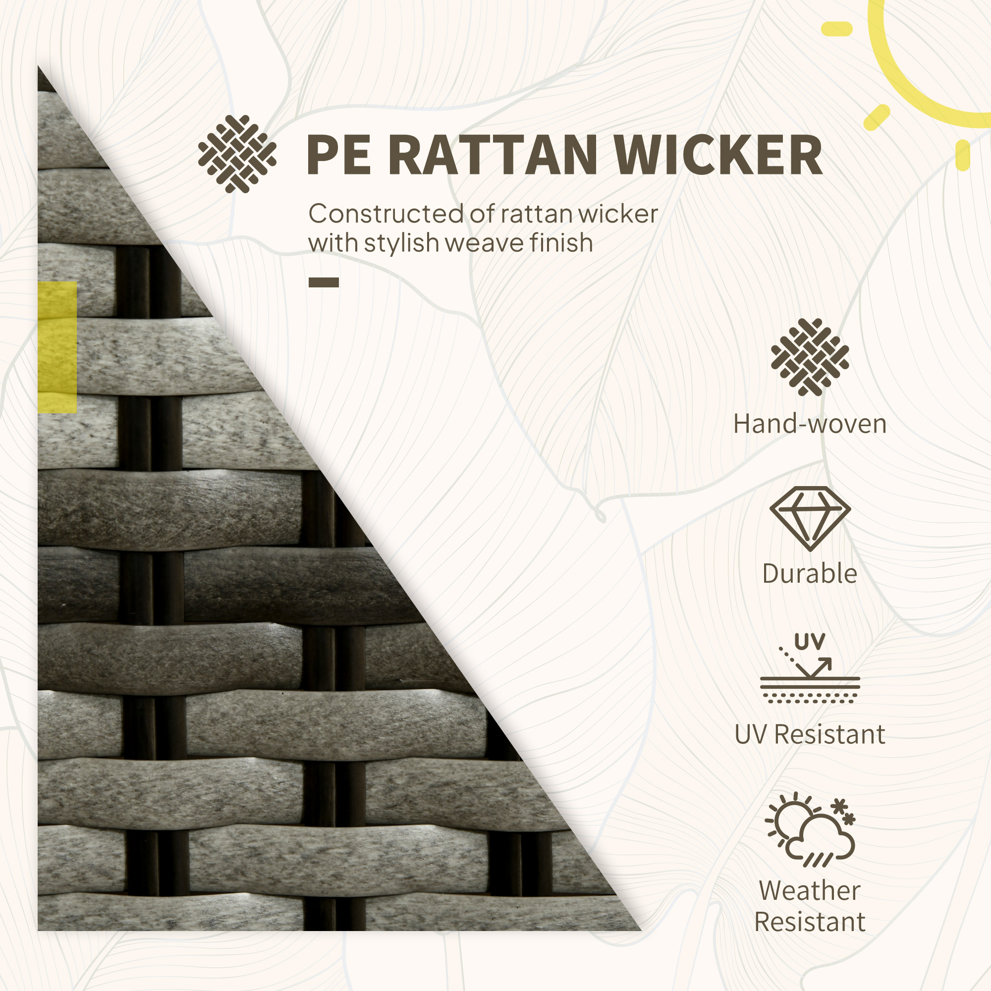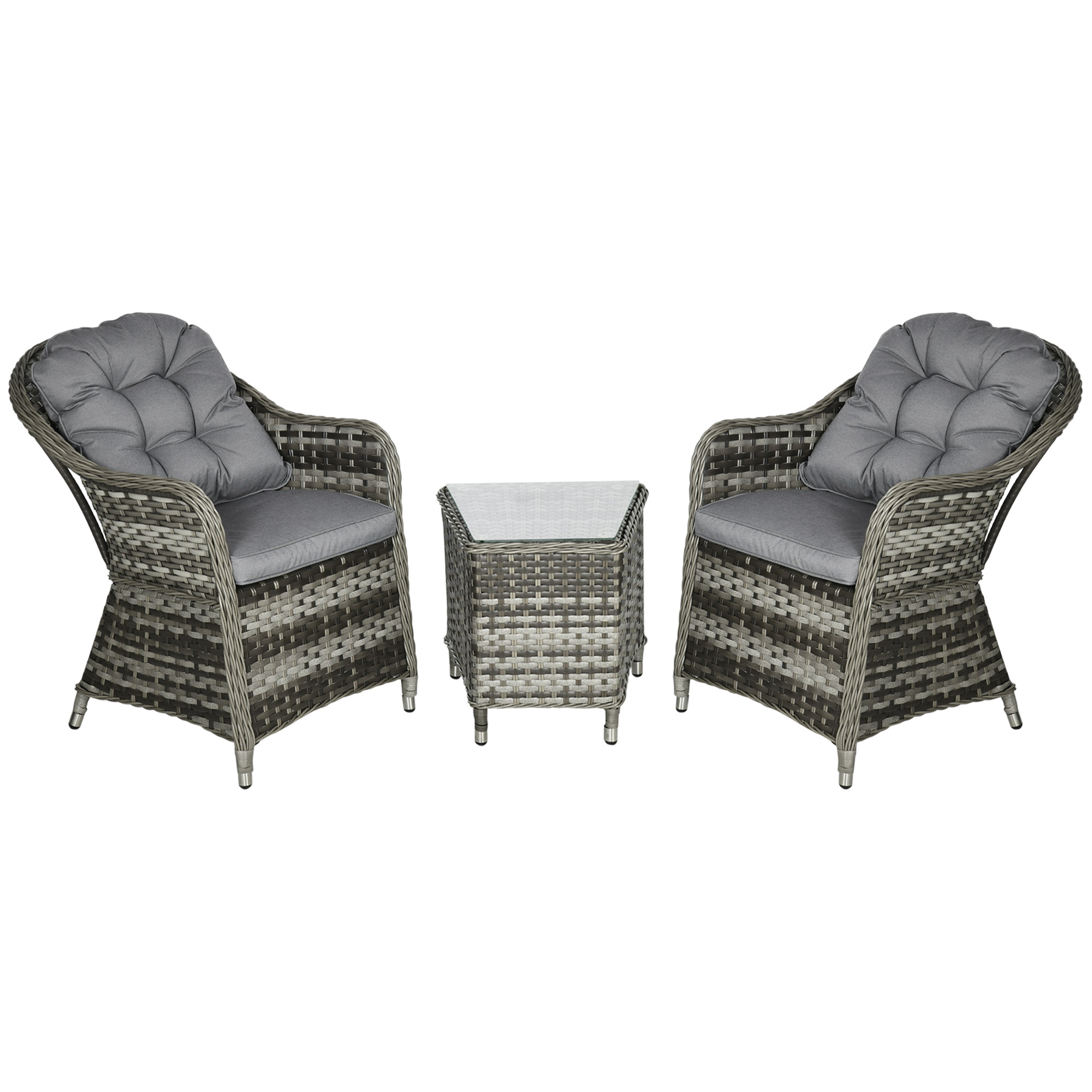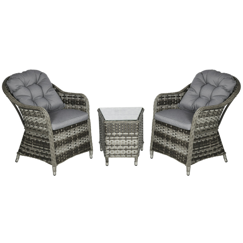 Do those lazy afternoons in the sun the right way – choose this rattan patio furniture set from . Formed of three pieces – a garden table and two chairs; enjoy outdoors with company. Powder coated aluminium frame for a strong structure, wrapped in stylish plastic rattan - double the durability. Both chairs come with seat and back cushions for comfort.