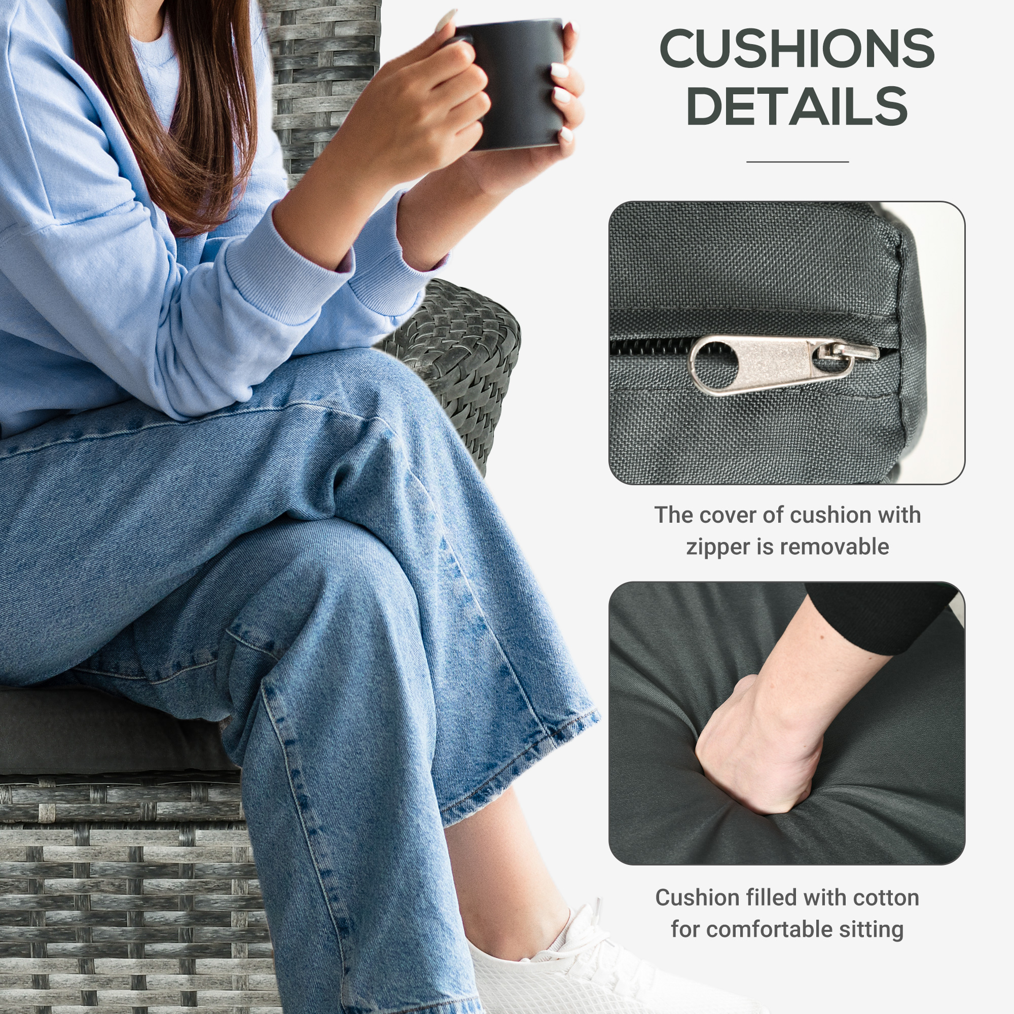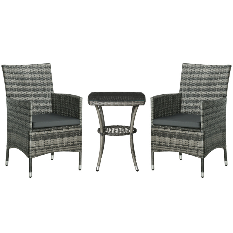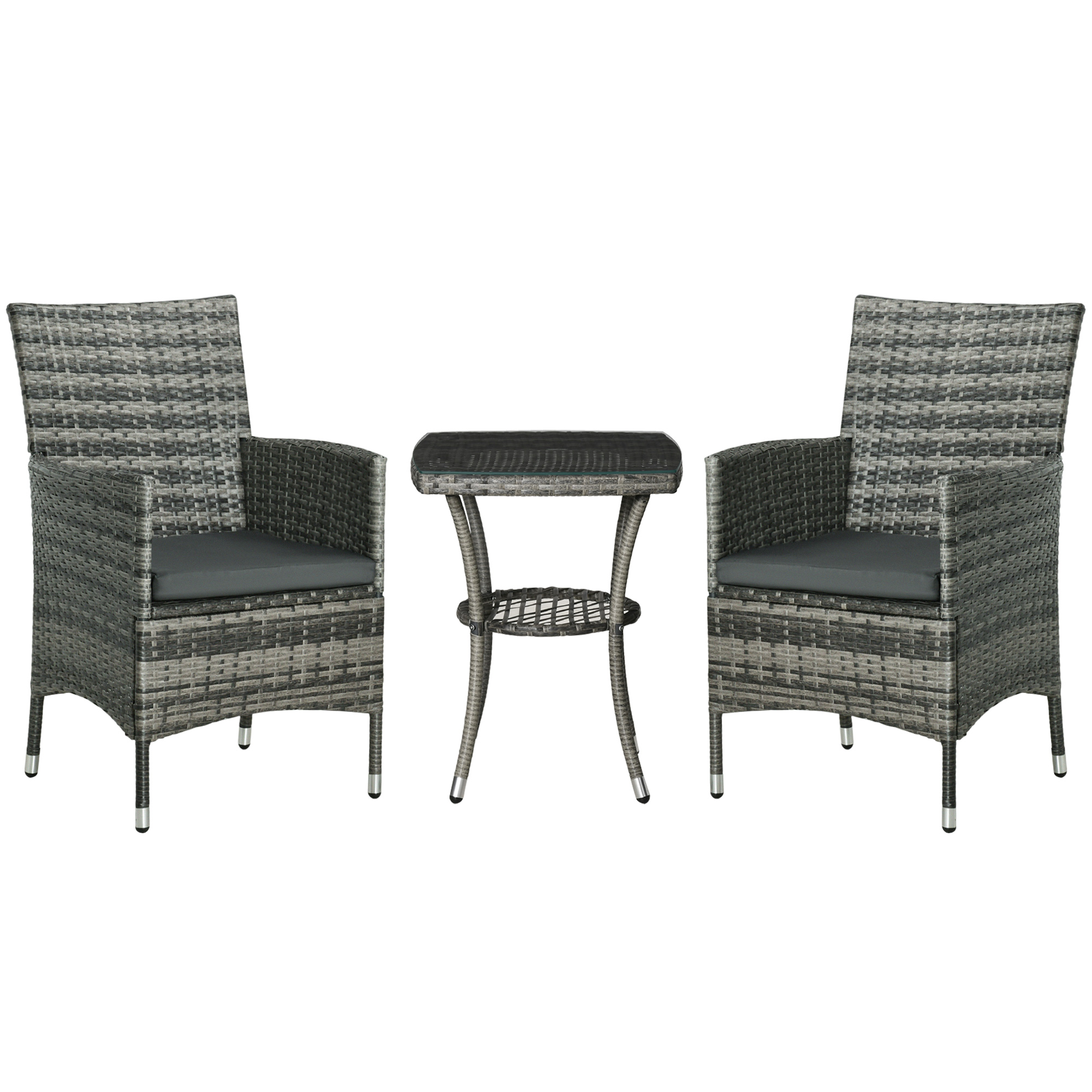 This outdoor bistro set is great for any patio, garden, porch and similar spaces. Frames of the rattan bistro set is made from powder coated steel mean a strong structure, wrapped in plastic PE rattan wicker for garden rattan style. UV and water resistant. Matching table gives a handy side surface, with a safe and sleek glass top. Repeat and use, season after season.