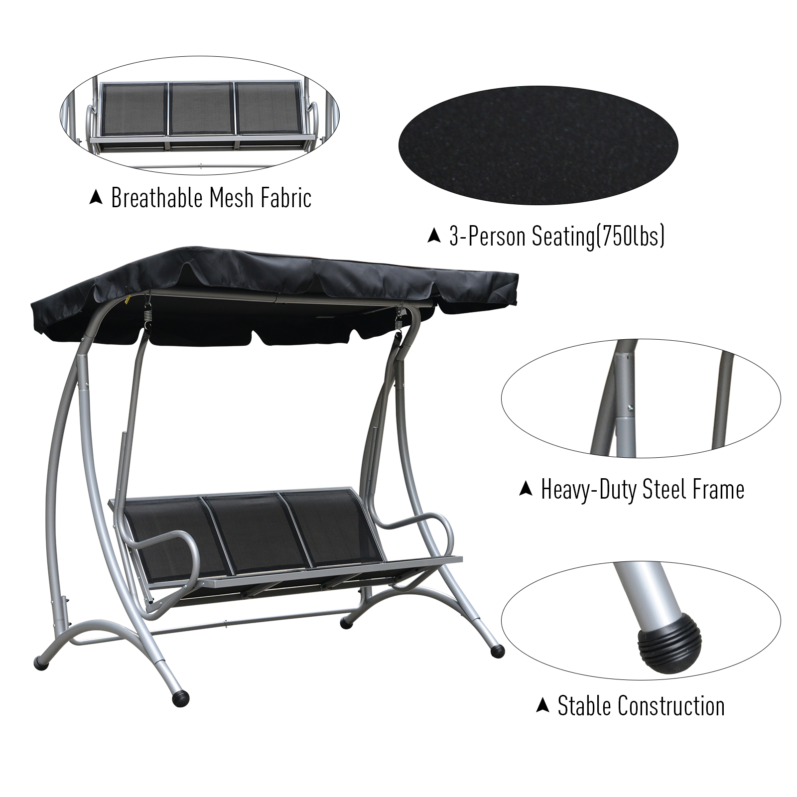 3-Seat Outdoor Porch Swing Chair, Patio Swing Glider With Adjustable Canopy, Breathable Seat, And Steel Frame For Garden, Poolside, Backyard, Black