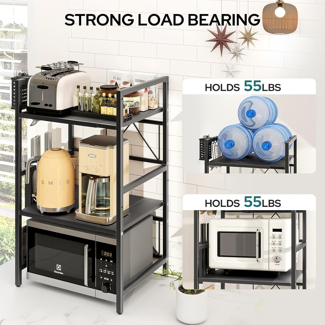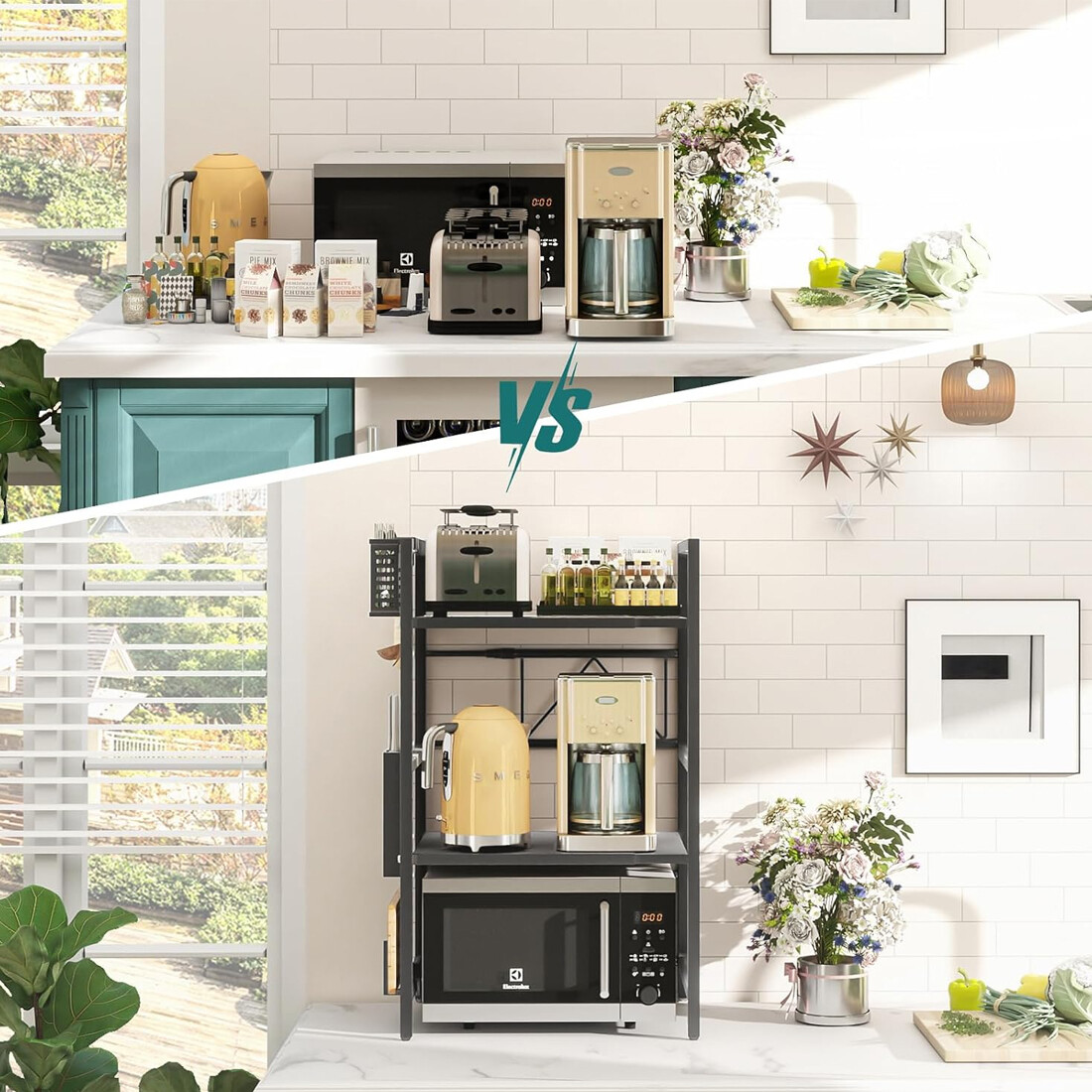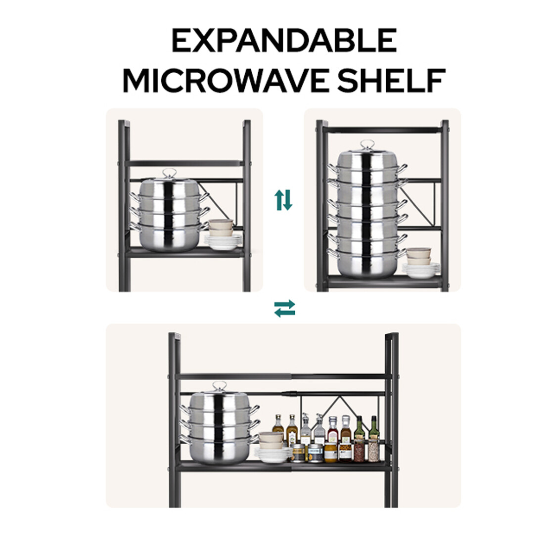 Durable Materialï¼The microwave shelf is finished with a safe and environmentally friendly black coating that offers waterproof and rust-resistant properties, making it easy to clean and maintain. Additionally, the bottom of the rack features 4 anti-slip suction cups to prevent sliding or scratching your kitchen countertop