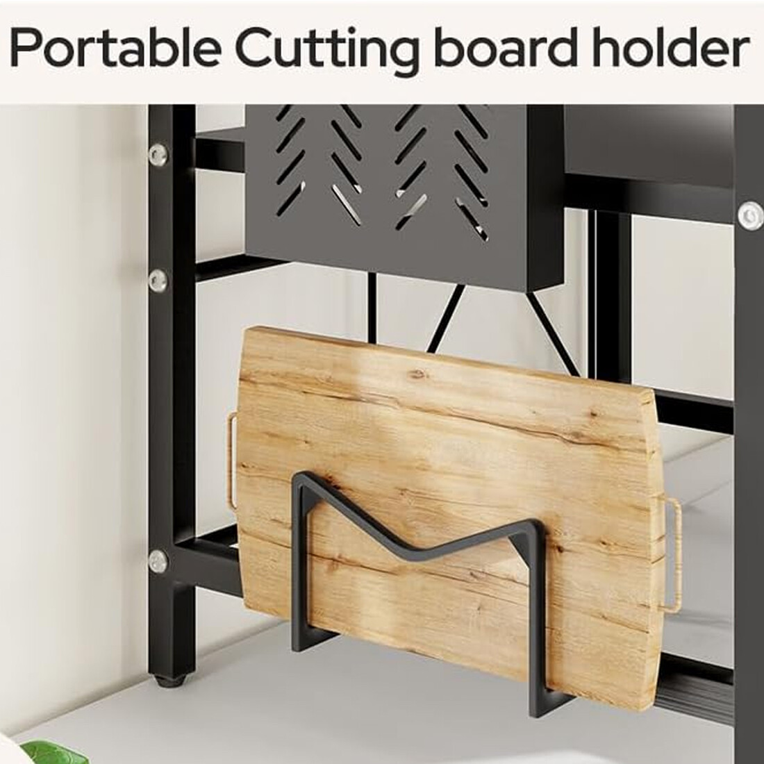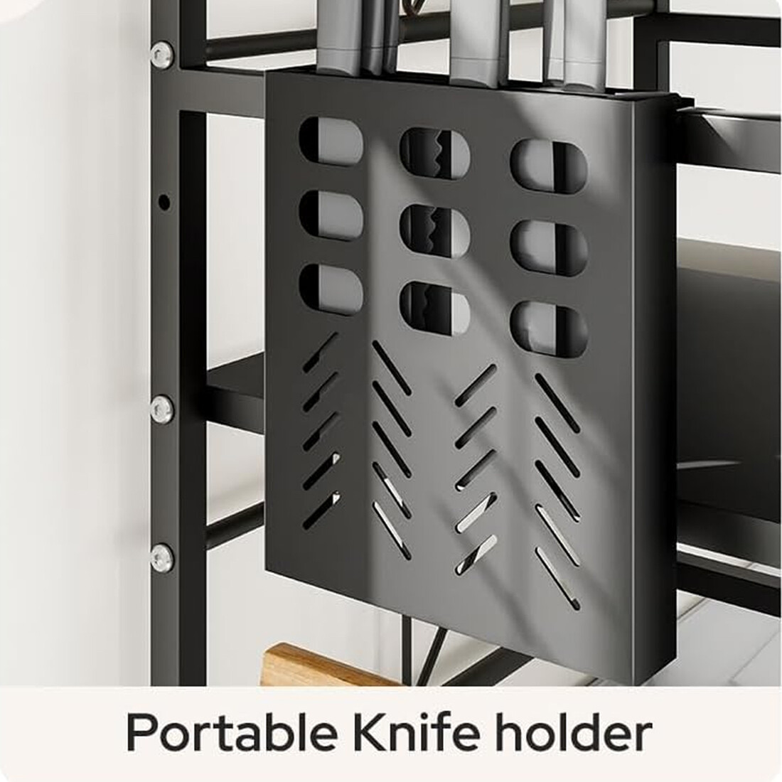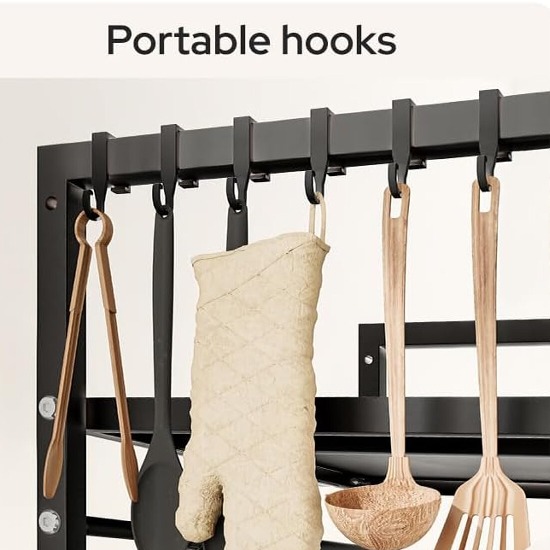 Multi-functional Accessories: The microwave shelf is equipped with 10 movable hooks, a chopping board rack, a knife rack, and a utensil box