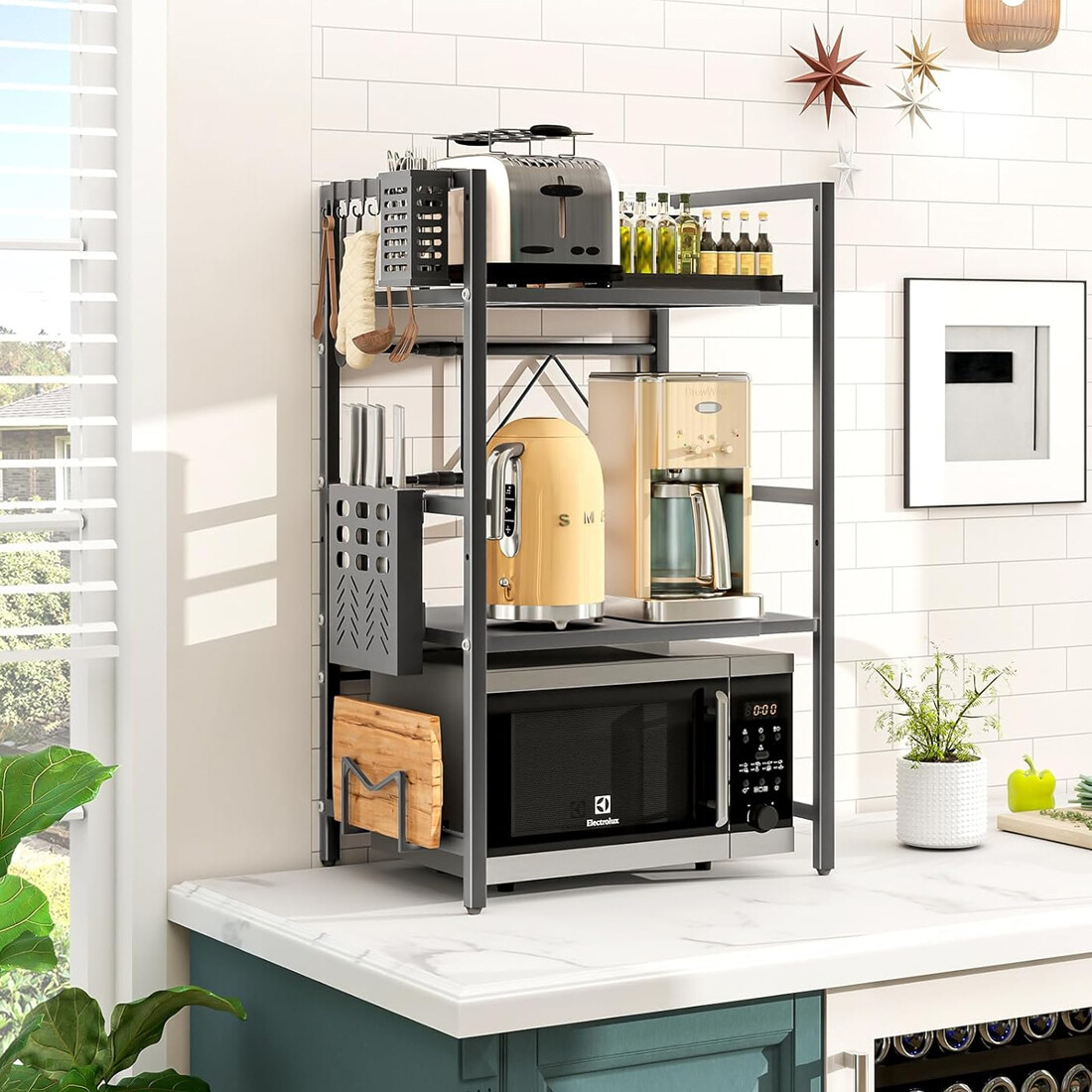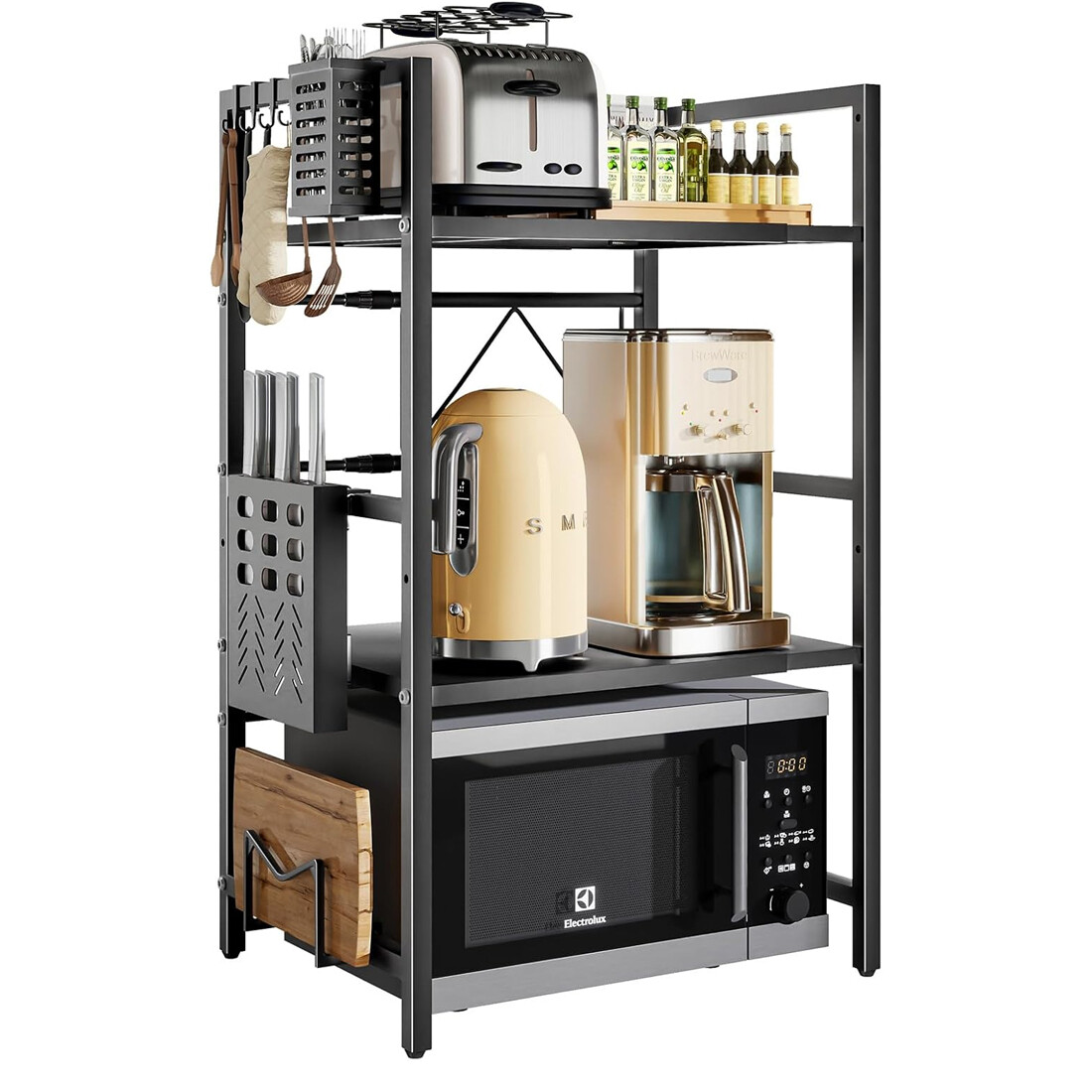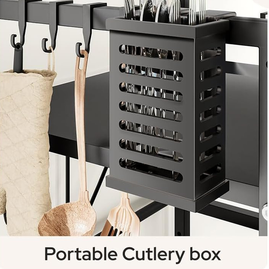 Multi-functional Accessories: The microwave shelf is equipped with 10 movable hooks, a chopping board rack, a knife rack, and a utensil box