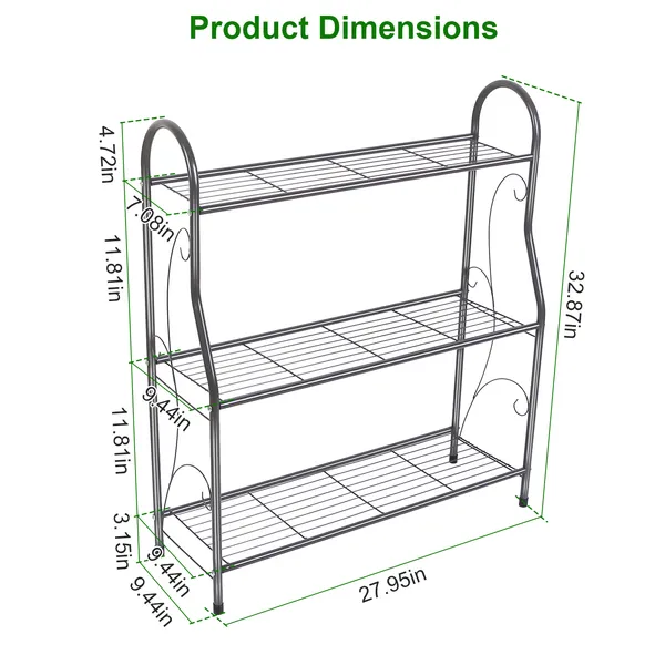 *Classic Retro Flower Rack*:Featuring with an elegant,retro design and baking finish iron pipe,this flower stand can well match your home decor;detachable foot pads protect your floor very well,free from scratches when moving around the flower rack. *3 Tier Flower Display Rack*:Vertical design makes full use of your space and provides spacious storage. It is not only a flower display shelf,but also perfect as a storage rack to your living room,bathroom,balcony,kitchen,garden,etc.. *88 LBS Overall Load*:Adopt long lasting use tube,the thinner tube and wide outside tube creates beautiful outlook and sturdy frame. 88LBS overall load is spacious enough for holding a variety of items like potted plants,books,shoes and other grocery,etc.. *Suits For Most Plants*:The second tier shelf can be detached according to the height of plants. Complement most plants. It is exactly the right combination for multiple plants,such as lush greenery,potted succulents and so on. Open and hollow structure is easy to maintain and clean. *Easy To Assemble*:Our plant stands are easy to install with simple wrenches and screws;with the guidance of the detailed instruction,you can assemble the plant stand within 15min.