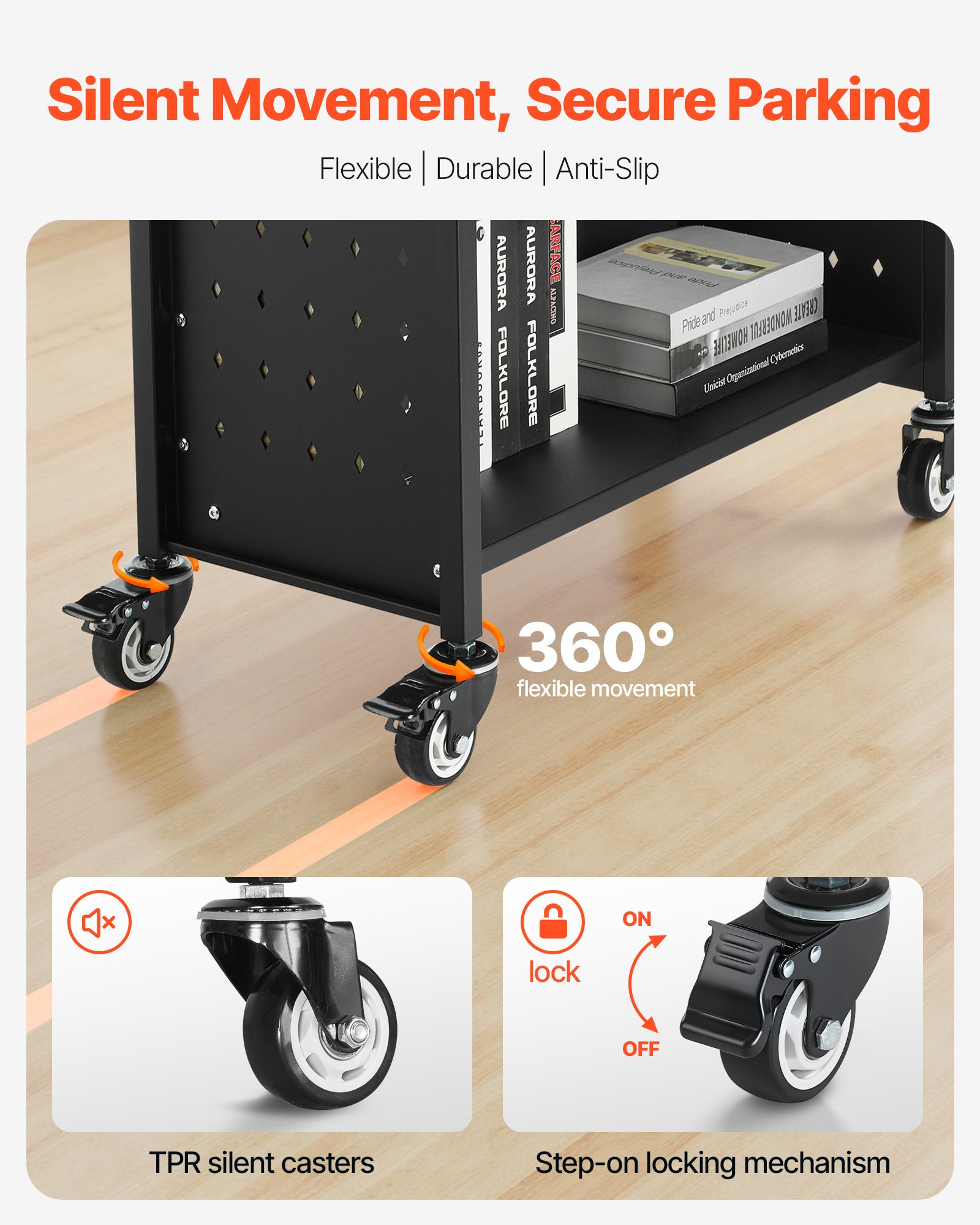 Silent Movement: TPR silent swivel casters glide smoothly, and two have a locking feature for secure positioning. Move the book truck effortlessly across wood or tile floors without disturbing anyone—great for libraries or nighttime use