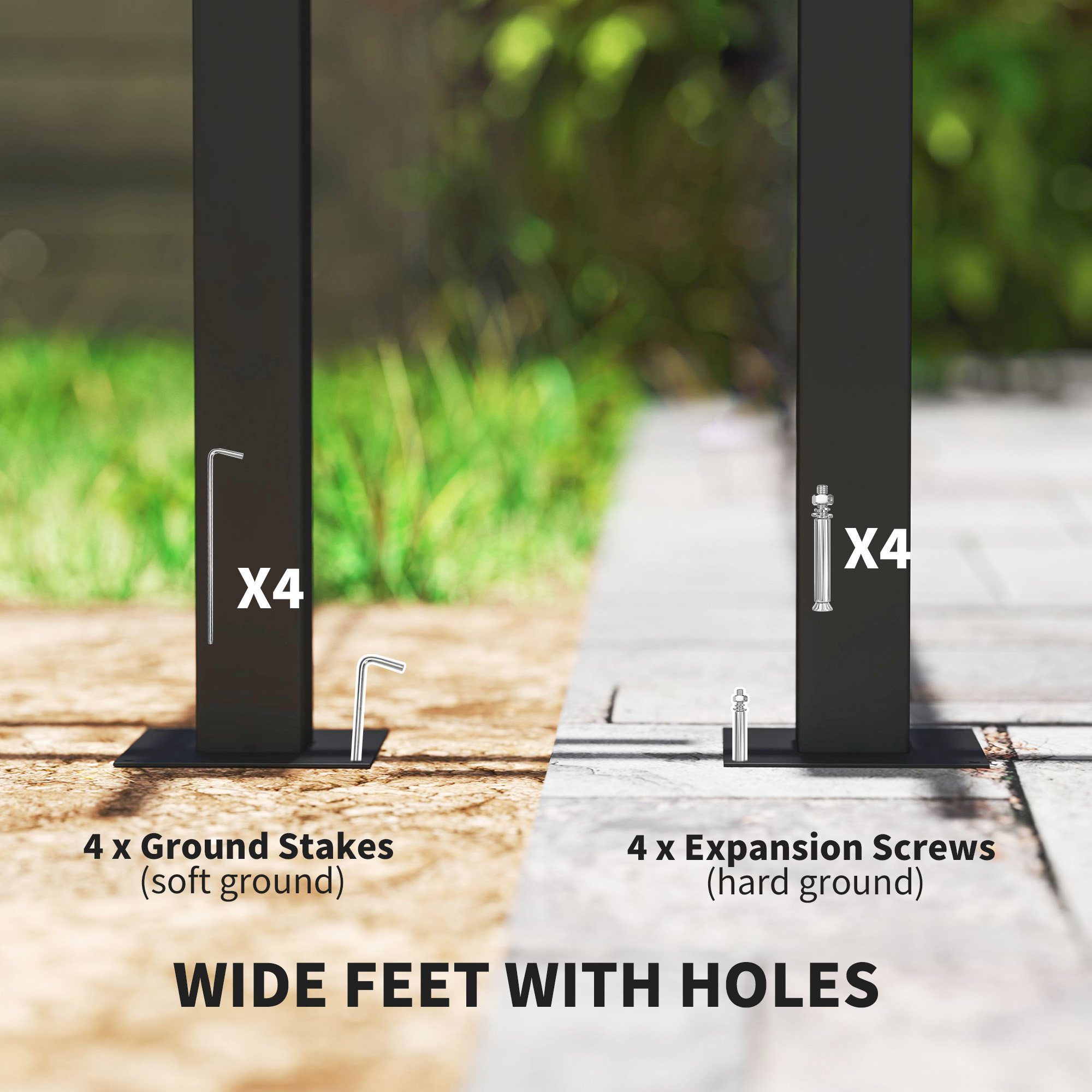 Be in control of how the sun shines around you. This garden pergola comes with a retractable top canopy, so you can move it to any position you want. A powder coated steel frame for a robust structure, with the wall-less design creating an open and inviting atmosphere. 3 x 4m size means it is a spacious piece, great for bringing you and friends together. Set comes with four ground stakes, eight wall expansion screws and four ground expansion screws.