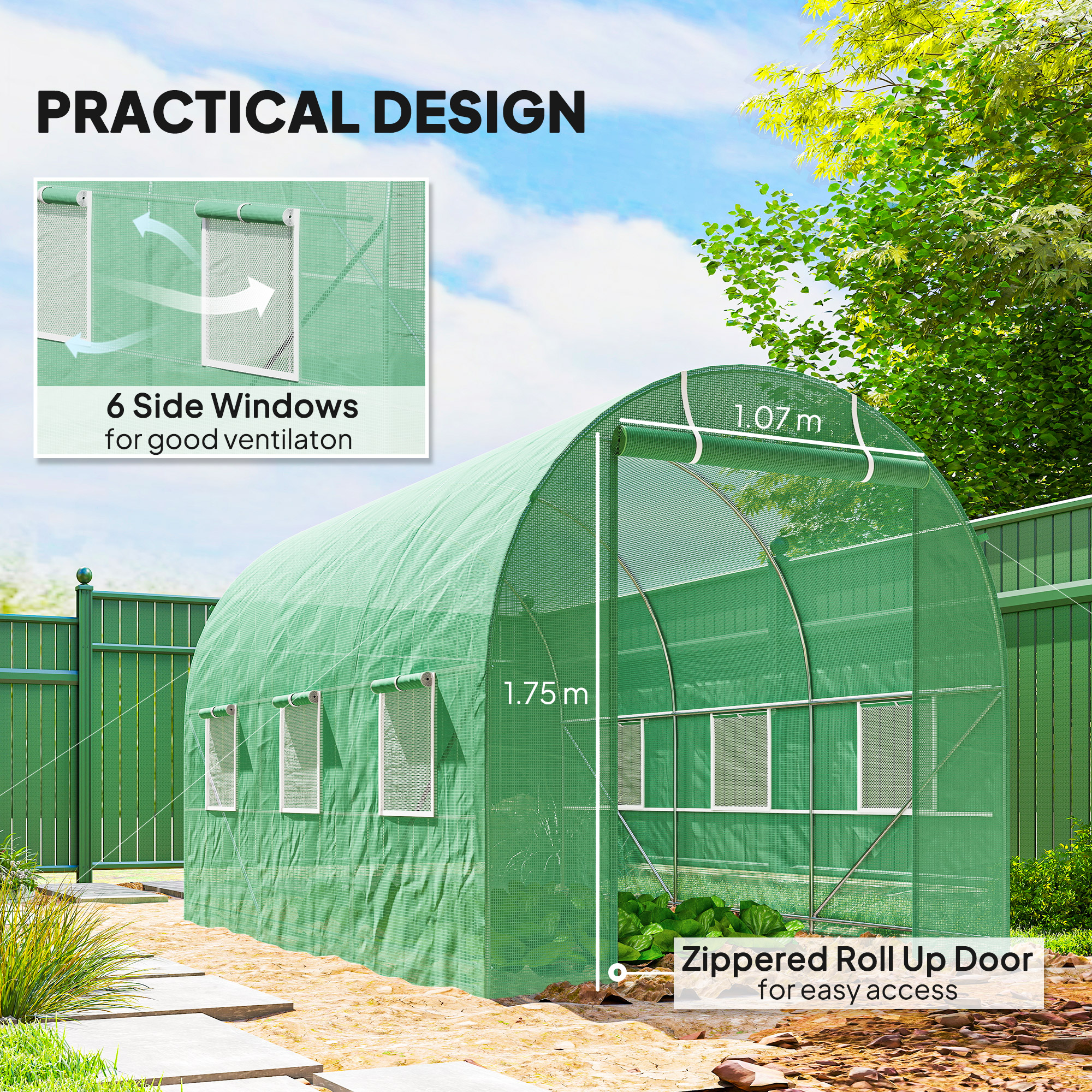 Put up and start growing a garden of greenery: look to this 3.5 x 2m garden polytunnel greenhouse. A spacious and open inside design, there's plenty of room to grow a variety of vegetables, flowers and more; how about bringing in shelves too for easy organisation? A steel frame for a strong standing structure, with metal rods for extra support. Use the included guy ropes and ground stakes to pin structure to ground. Complete with mesh windows and large roll-up door.