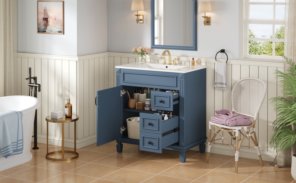 • [Smart Storage Solutions] This vanity provides multiple storage options to keep your bathroom organized. It features two deep drawers for larger essentials and an adjustable shelf to customize space according to your needs. The smooth sliding rails ensure effortless access, making daily routines more convenient and clutter-free.