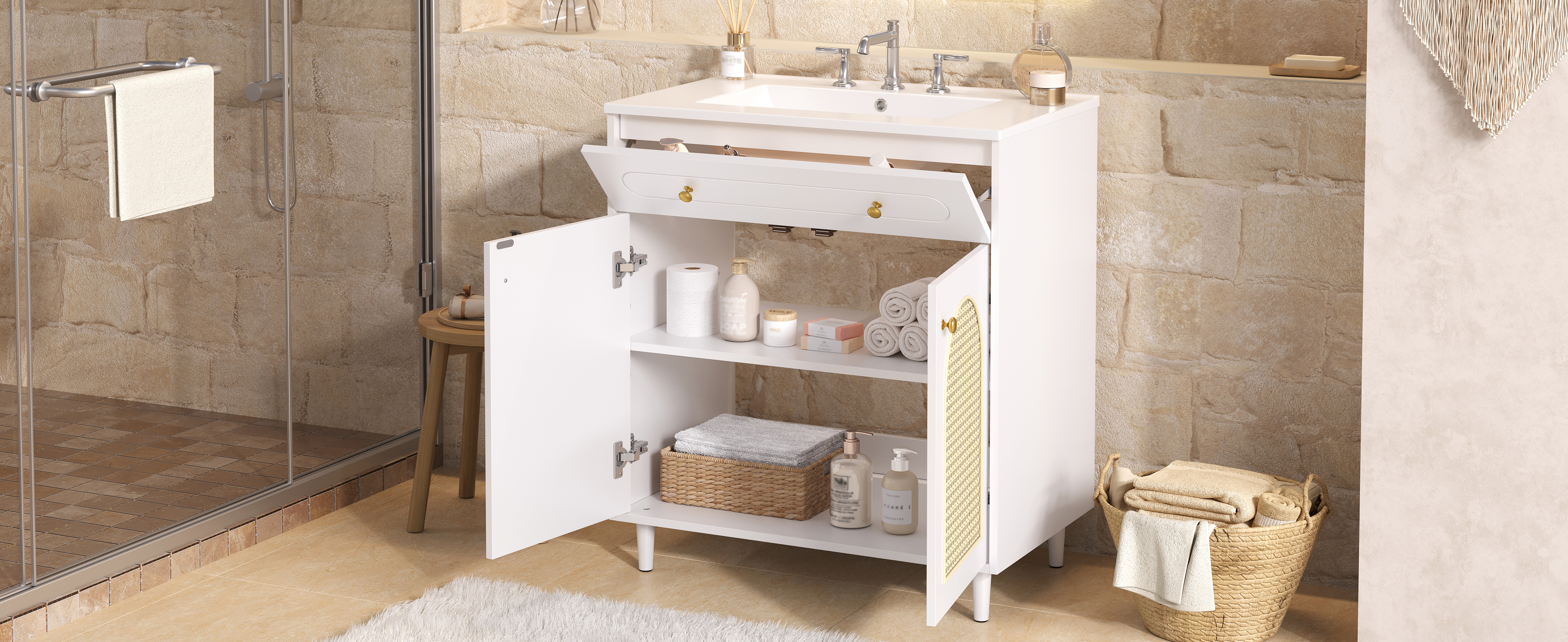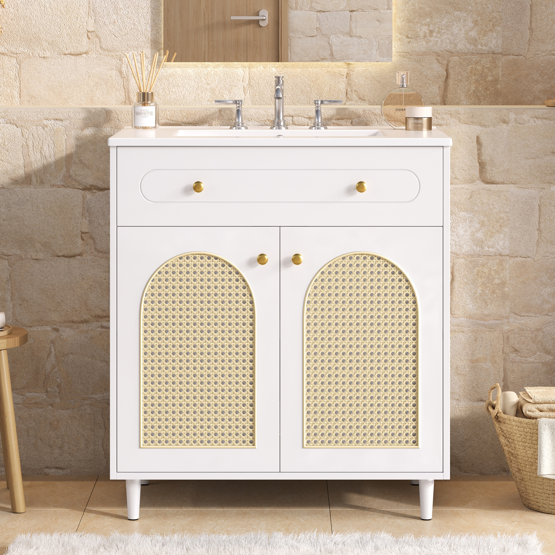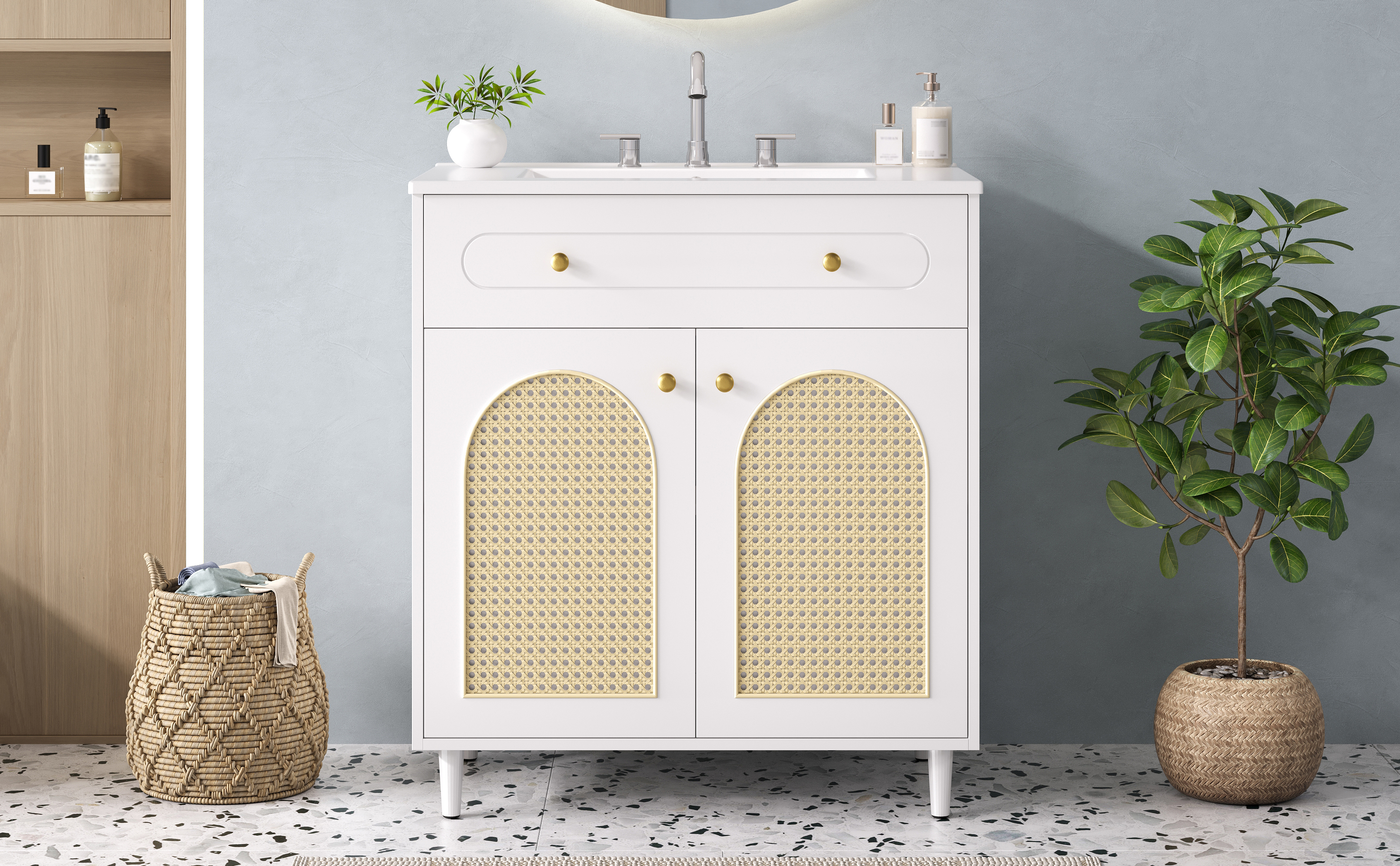 Crafted to bring refined style into your home, this elegant vanity combines artisanal charm with modern functionality. The smooth ceramic basin offers easy, wipe-clean maintenance, while the sturdy solid wood base and durable MDF frame ensure lasting stability. Soft-close hinges provide quiet, gentle operation, and the handwoven rattan front panel adds natural texture and warmth. Together, these carefully chosen materials create a cohesive look of understated luxury—perfect for elevating your bathroom or bedroom with both beauty and everyday practicality.