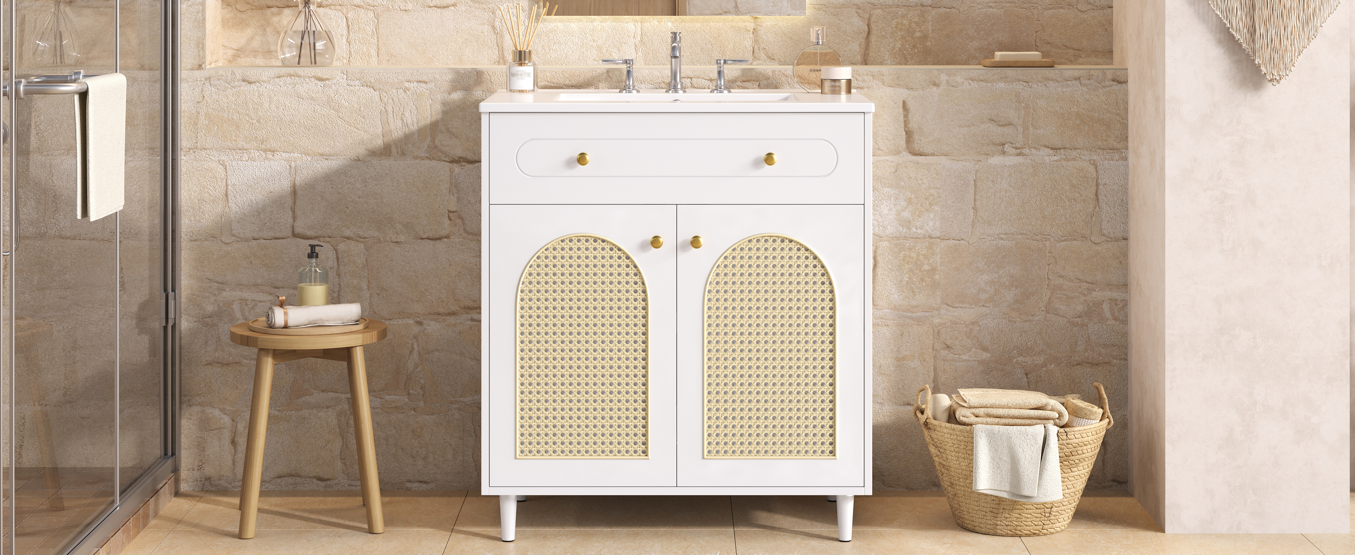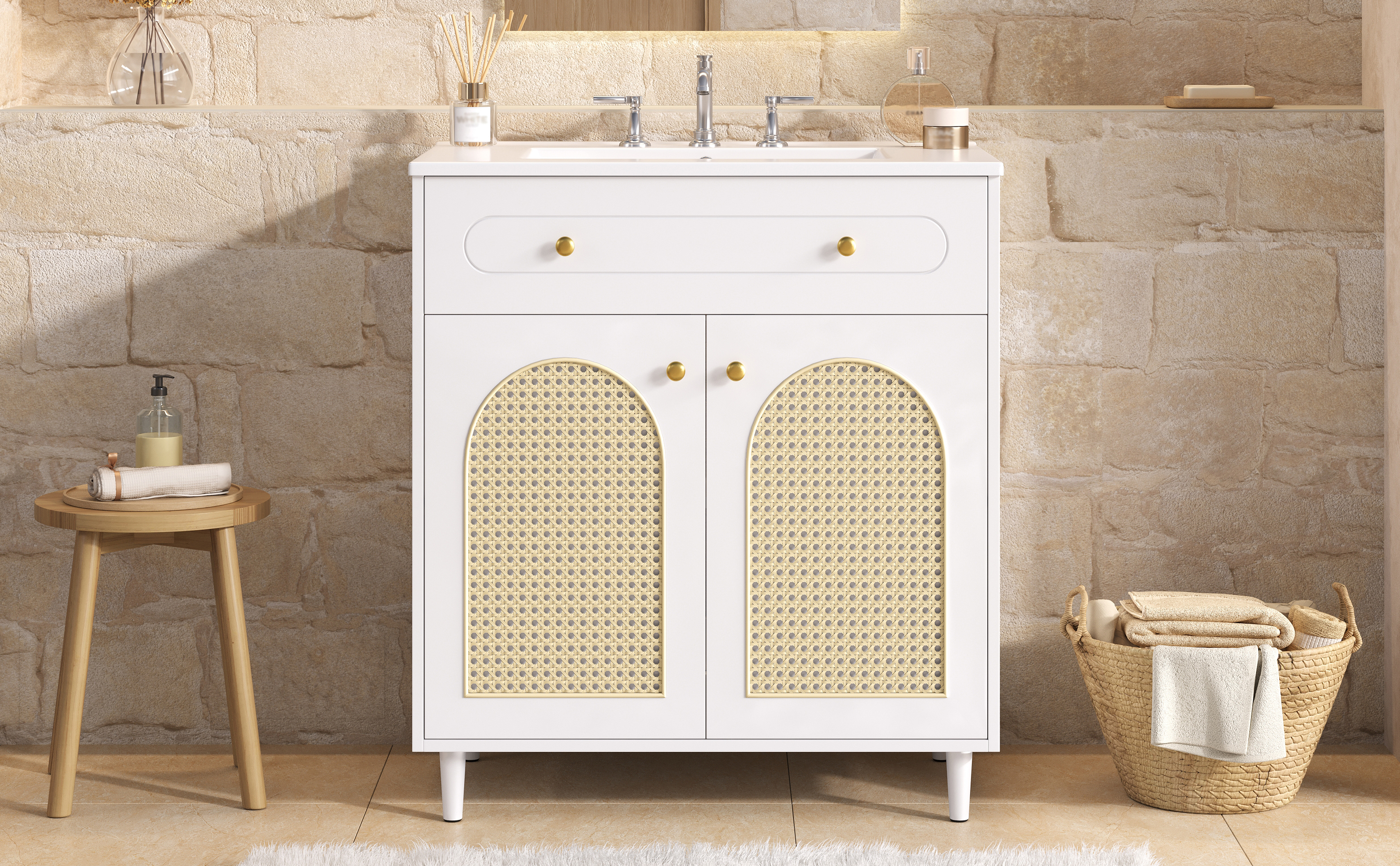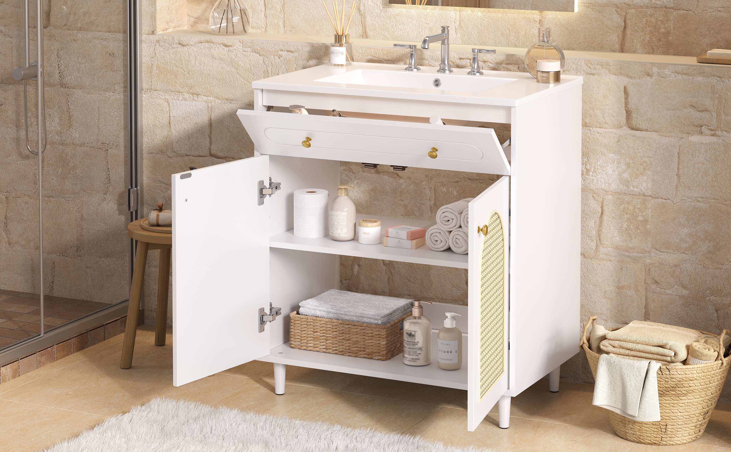 Crafted to bring refined style into your home, this elegant vanity combines artisanal charm with modern functionality. The smooth ceramic basin offers easy, wipe-clean maintenance, while the sturdy solid wood base and durable MDF frame ensure lasting stability. Soft-close hinges provide quiet, gentle operation, and the handwoven rattan front panel adds natural texture and warmth. Together, these carefully chosen materials create a cohesive look of understated luxury—perfect for elevating your bathroom or bedroom with both beauty and everyday practicality.