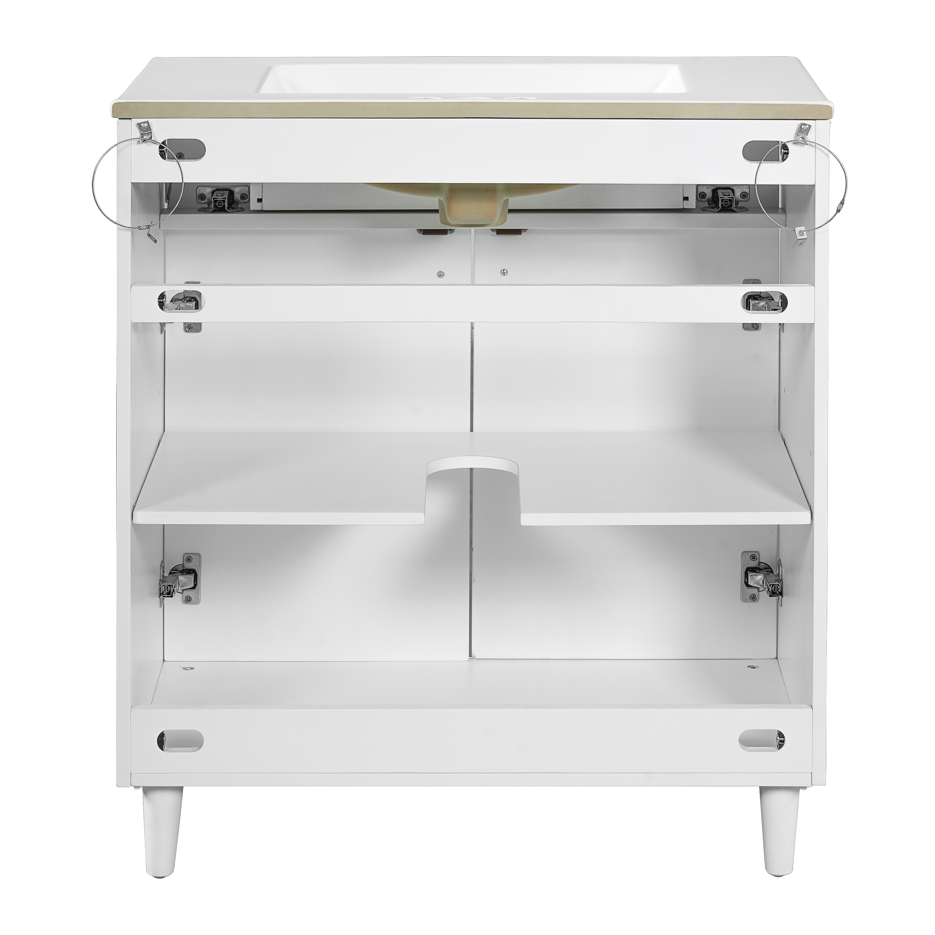 • [30 INCH VANITY] This 30-inch vanity combines elegant craftsmanship with practical design, offering an ideal storage solution for your bath remodel. Its engineered wood construction ensures lasting durability, while the classic U-shaped cutout is specifically designed to fit seamlessly under most standard sinks. This smart design perfectly conceals plumbing fixtures, creating a clean, organized look that enhances the overall aesthetic of your bathroom.