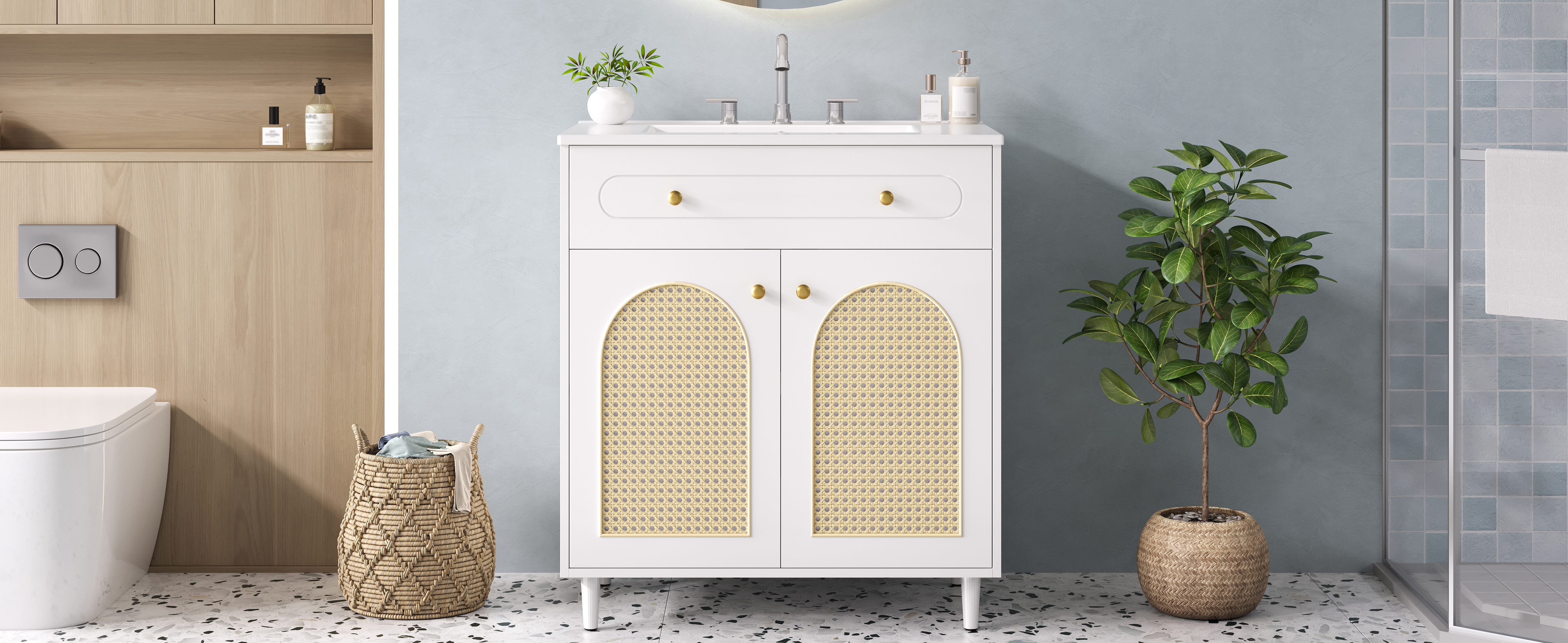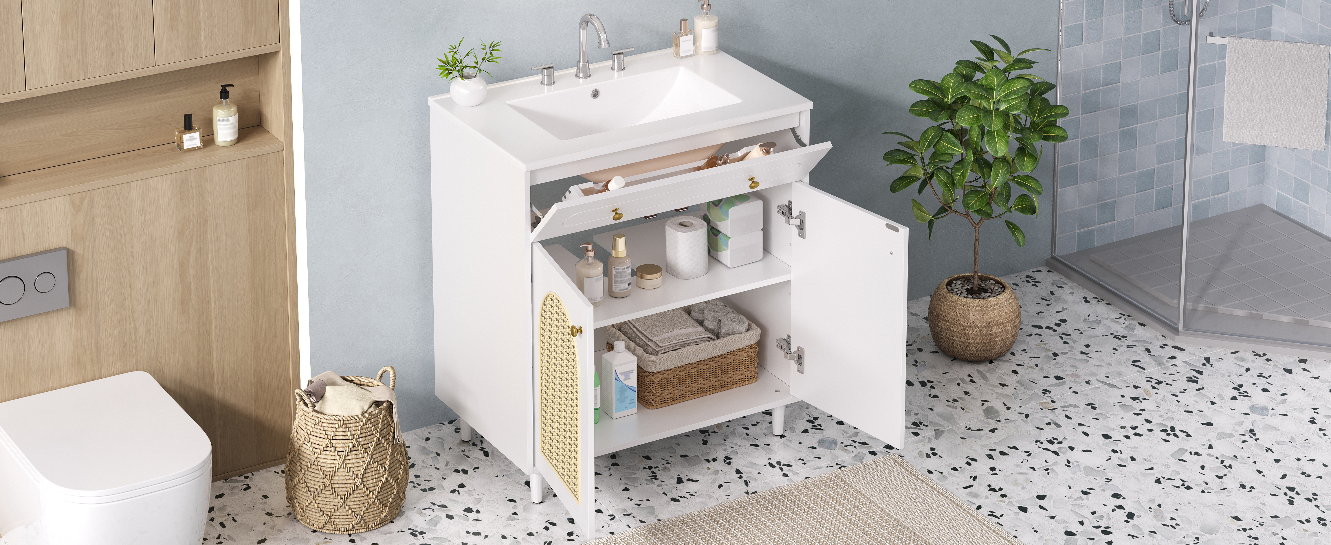 Artfully combining natural texture with refined finishes, this piece features a woven rattan front, a smooth ceramic basin for easy cleaning, and polished metal handles. Together, they create a look of timeless elegance—a seamless blend of artisan charm and modern simplicity for your daily routine.