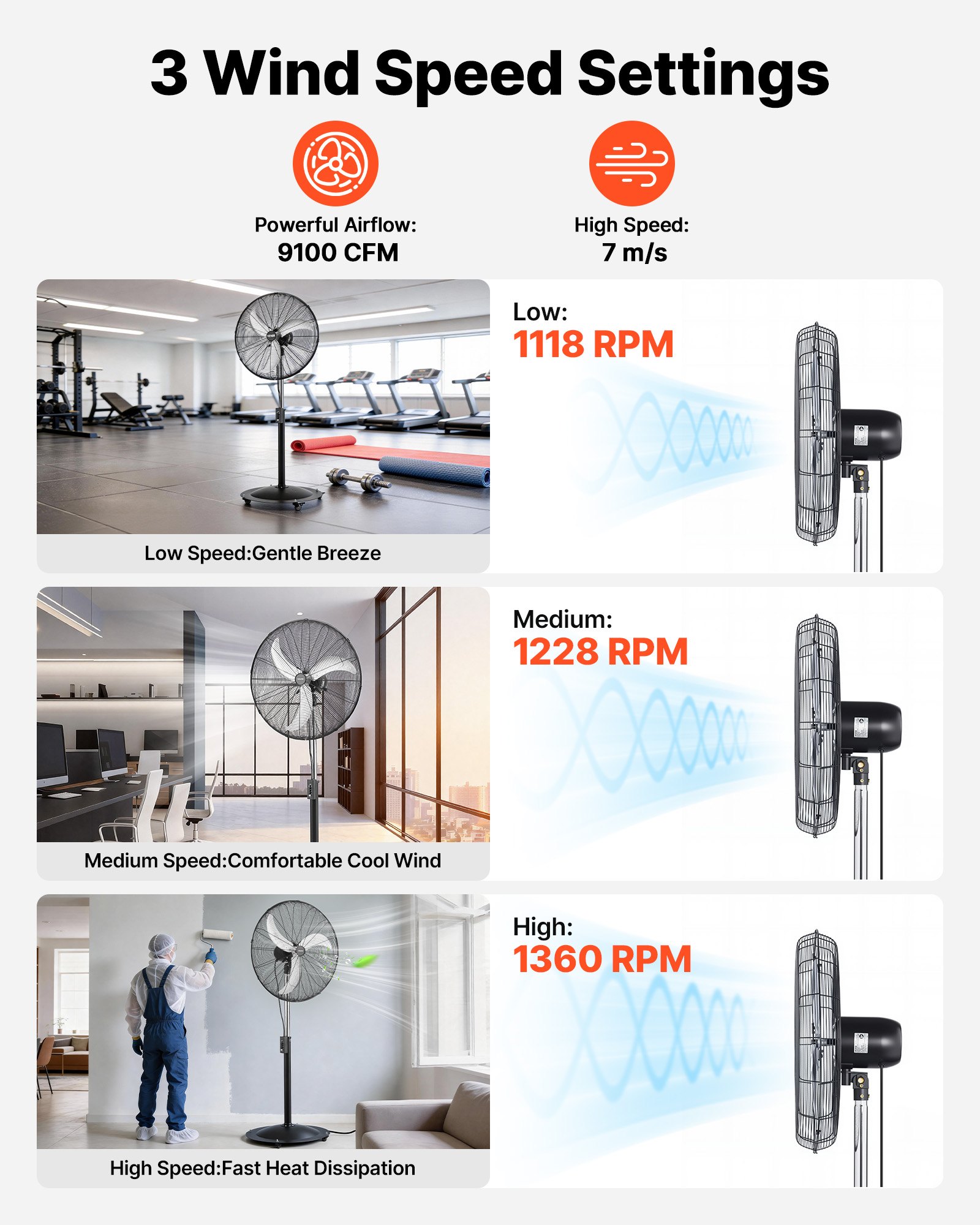 3-Speed Airflow: The pedestal fan provides low, medium, and high speed settings for precise cooling and faster air circulation. At high speed, airflow reaches up to 7 m/s, making it ideal for garages, workshops, warehouses, gyms, and living rooms