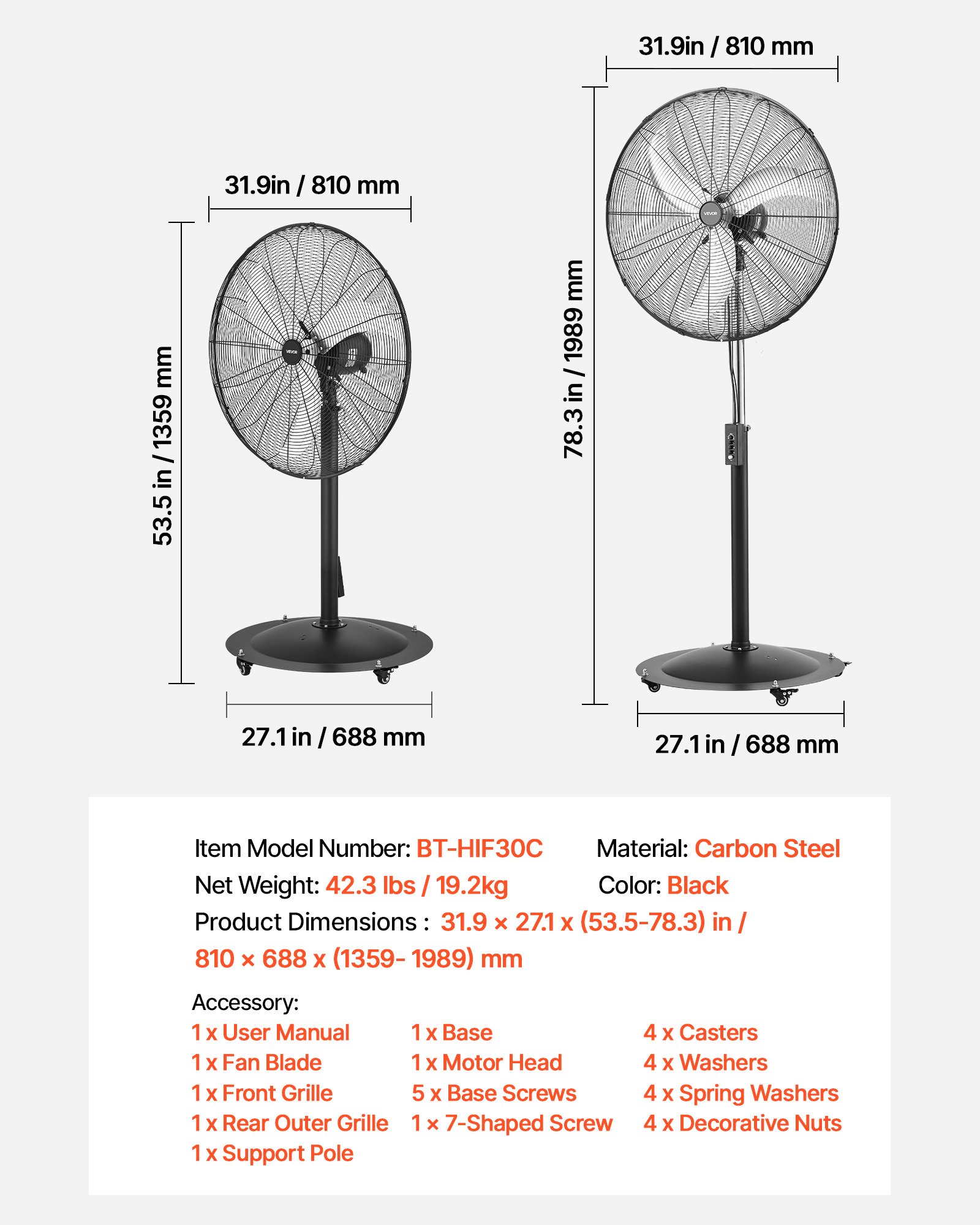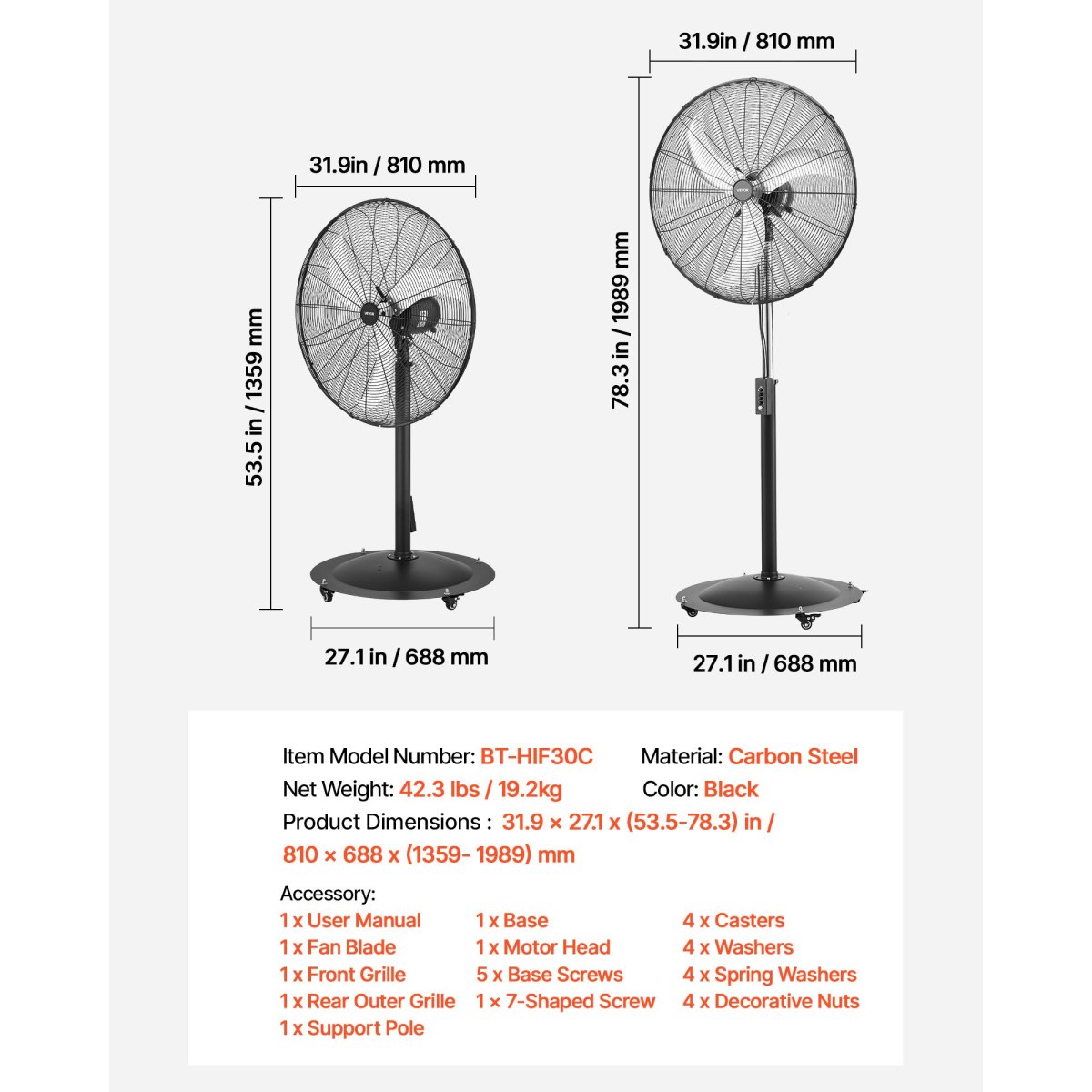 Powerful Motor: Equipped with a stable 215W high-power motor, our standing fan reaches up to 1350 RPM. It delivers strong and continuous airflow at a low noise level of ≤70 dB, ensuring efficient cooling without disturbing daily activities