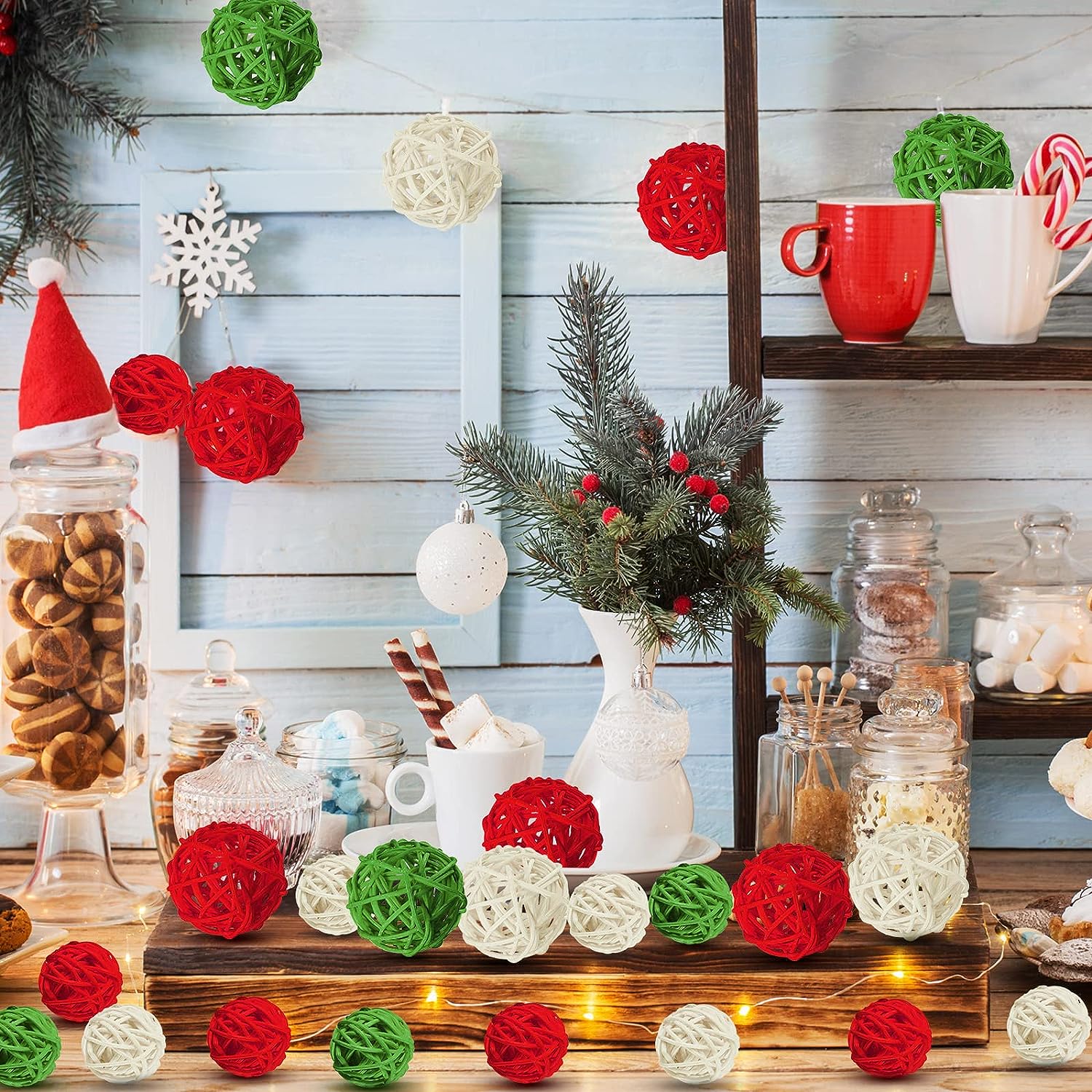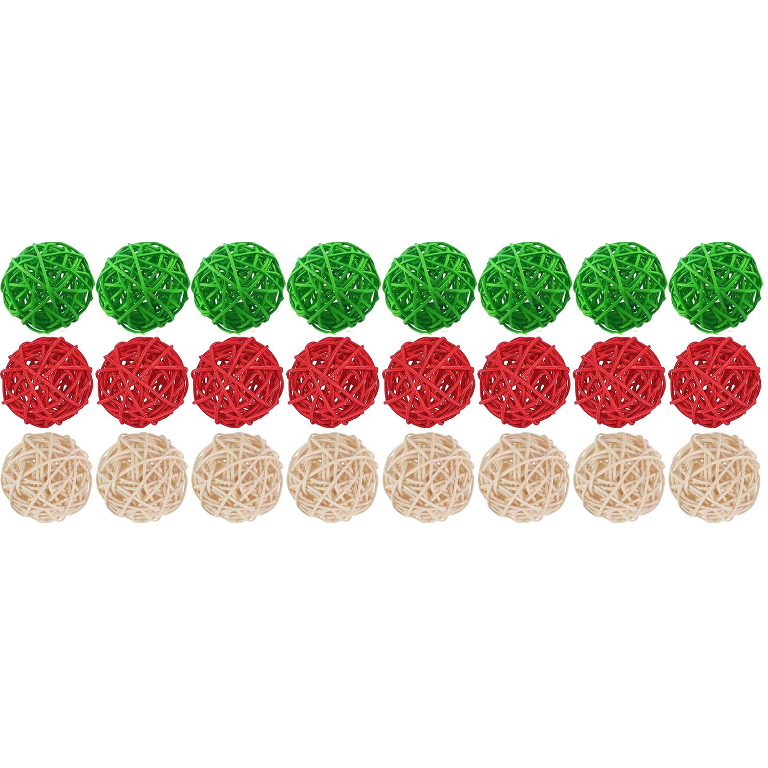 Specification: Material: woven rattan wood Diameter: 1.18 inch/ 30 mm Color: red, white and green Quantity: each color has 10 pieces, total 30 pieces