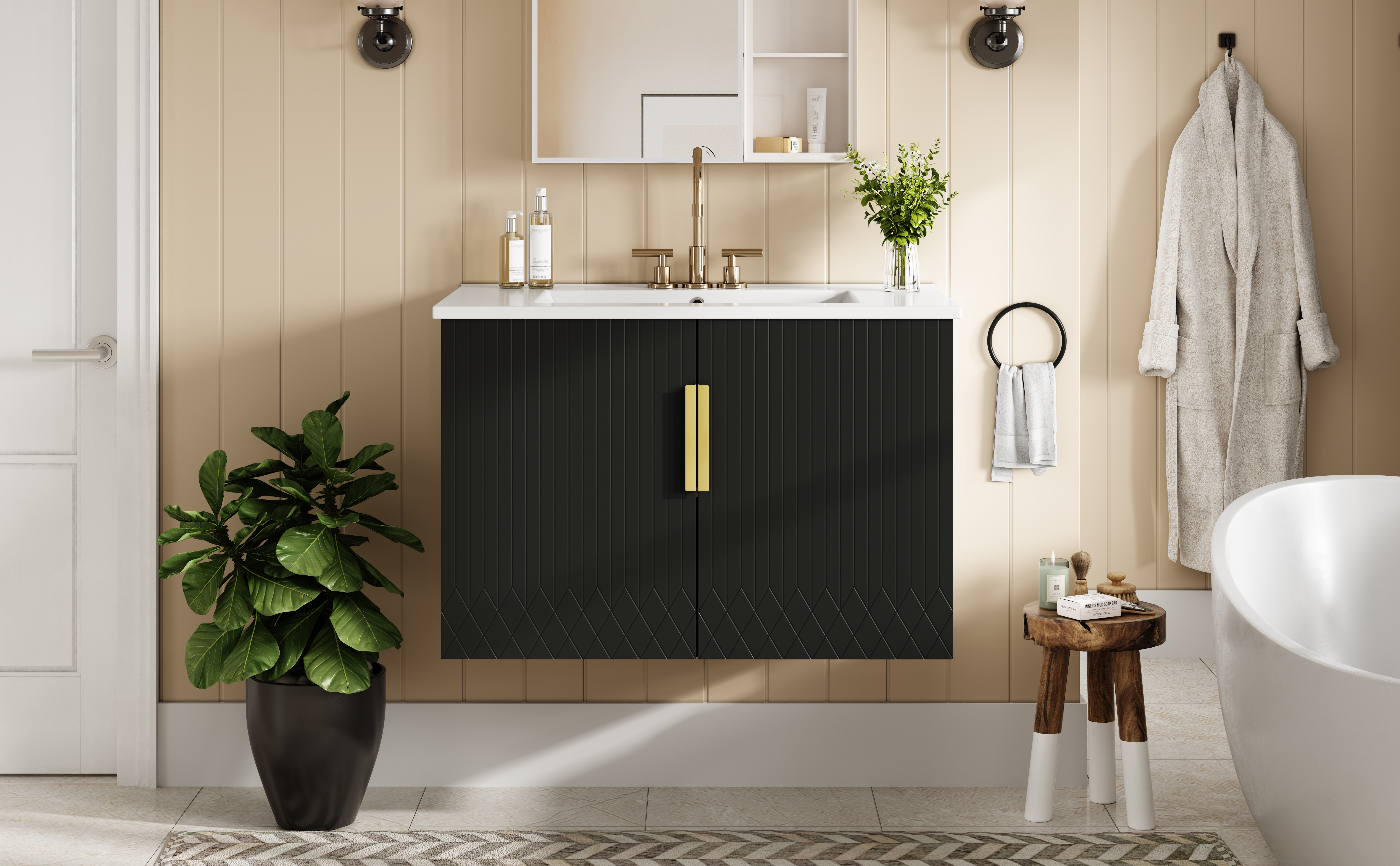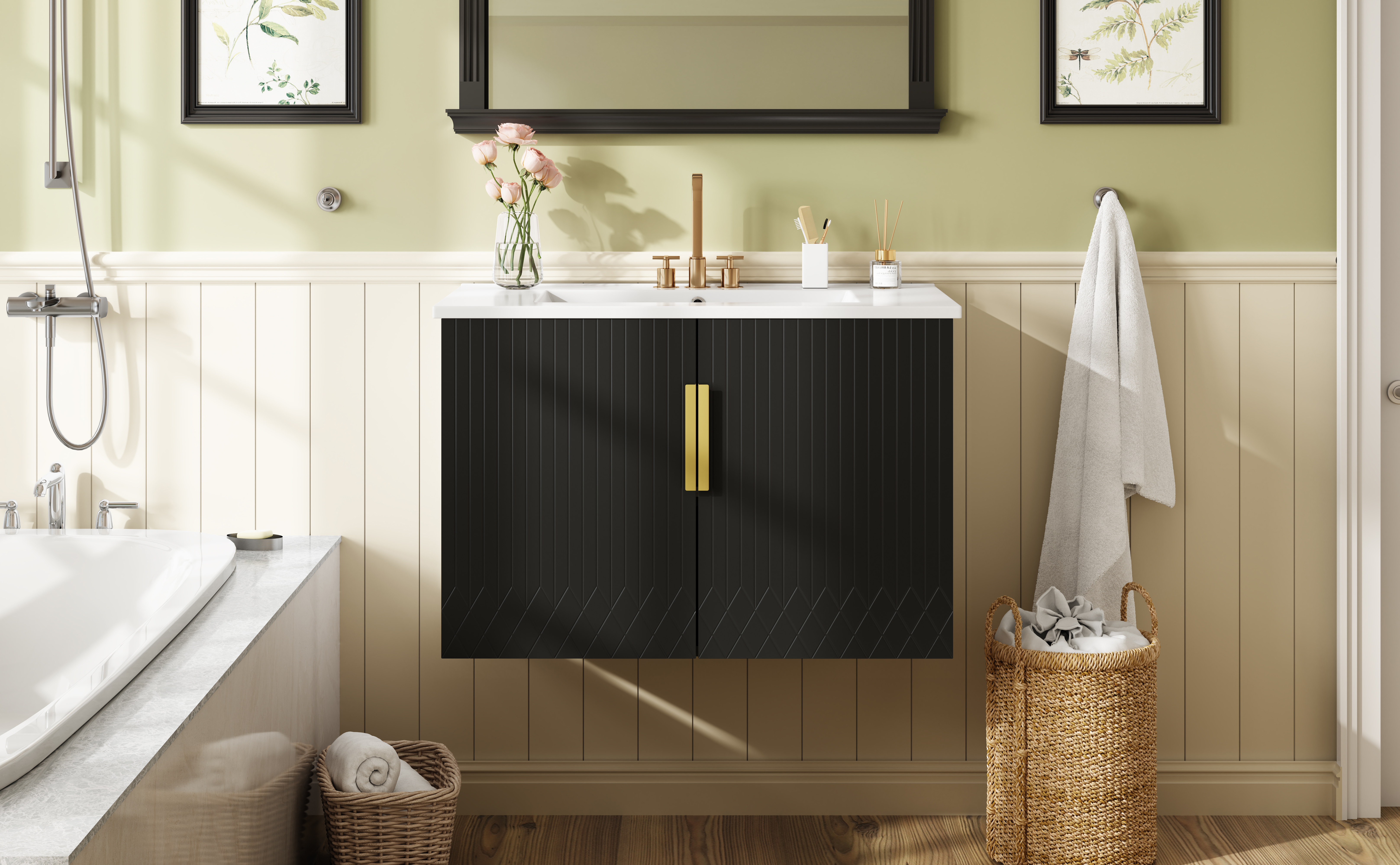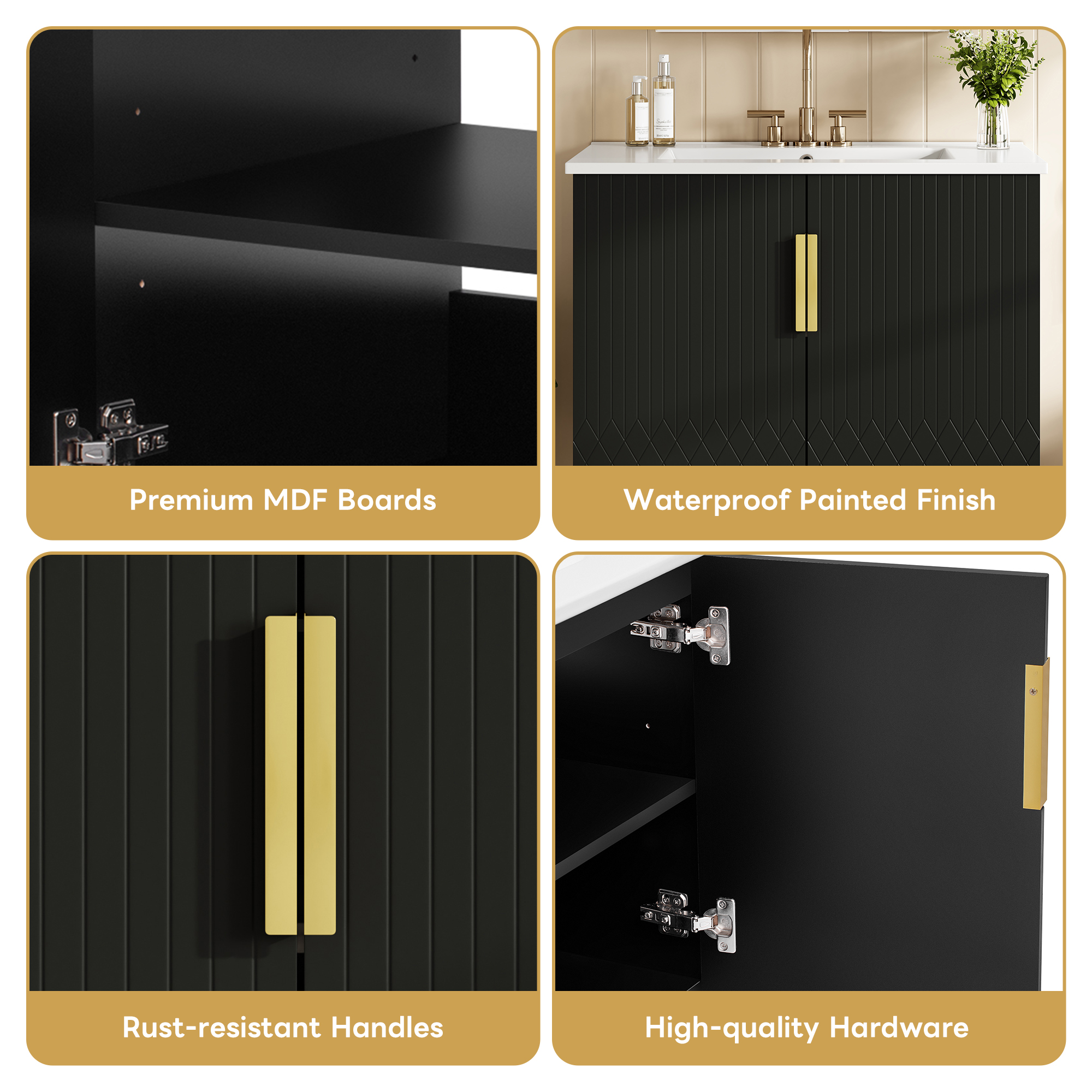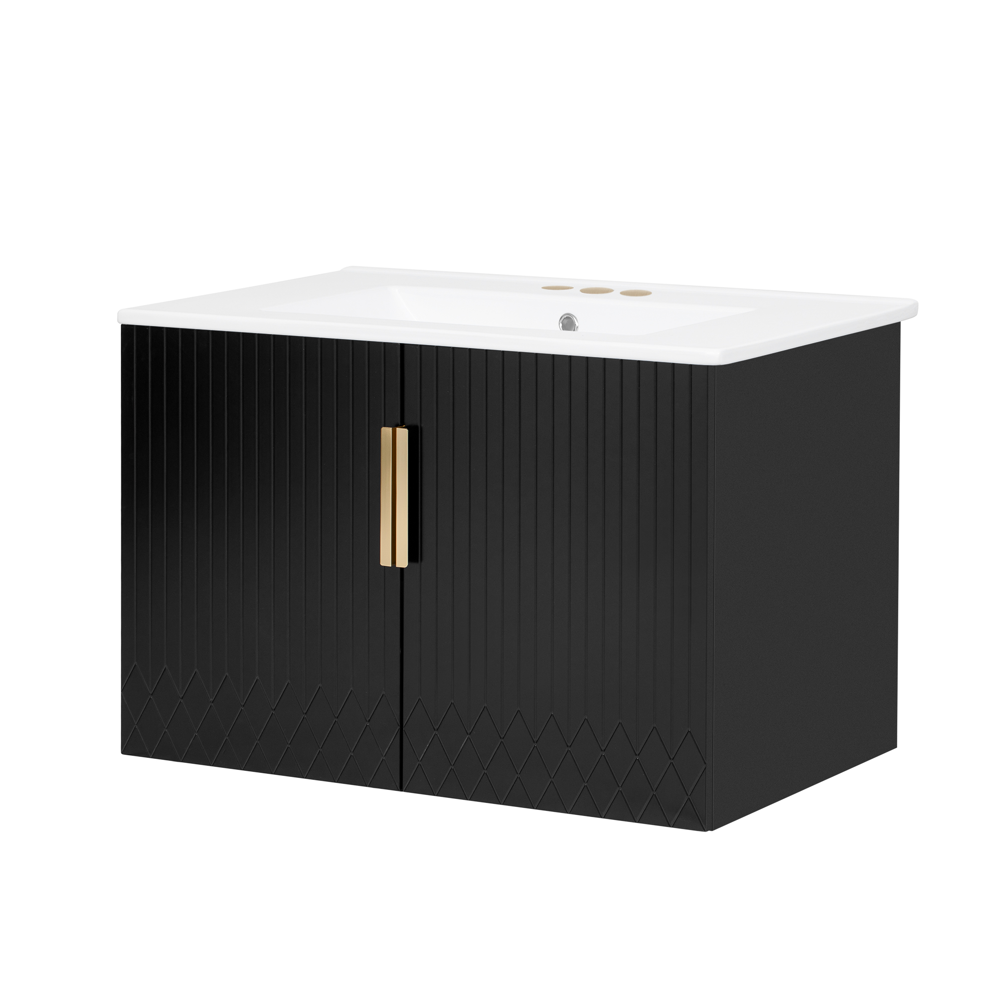 - Minimalist striped design with sleek hardware - Glossy white ceramic sink for a clean - Constructed from high-quality MDF and solid wood - Spacious storage with dual doors + adjustable shelf - Easy-to-clean, stain-resistant ceramic sink with overflow protection - High-end corrosion-resistant hardware