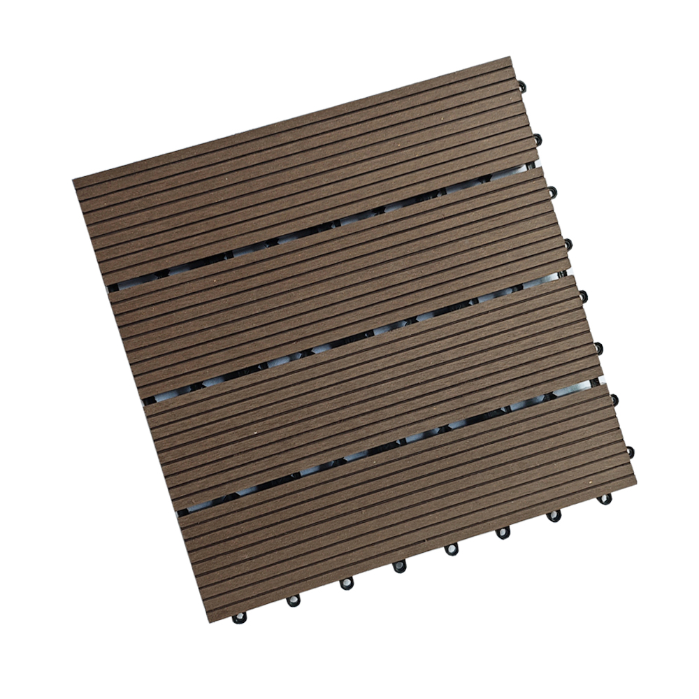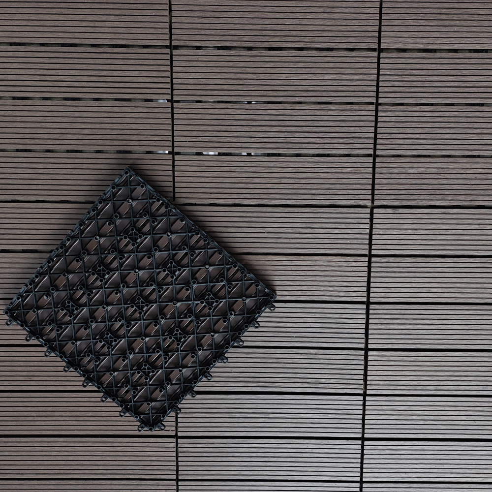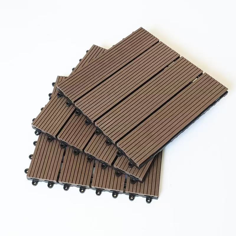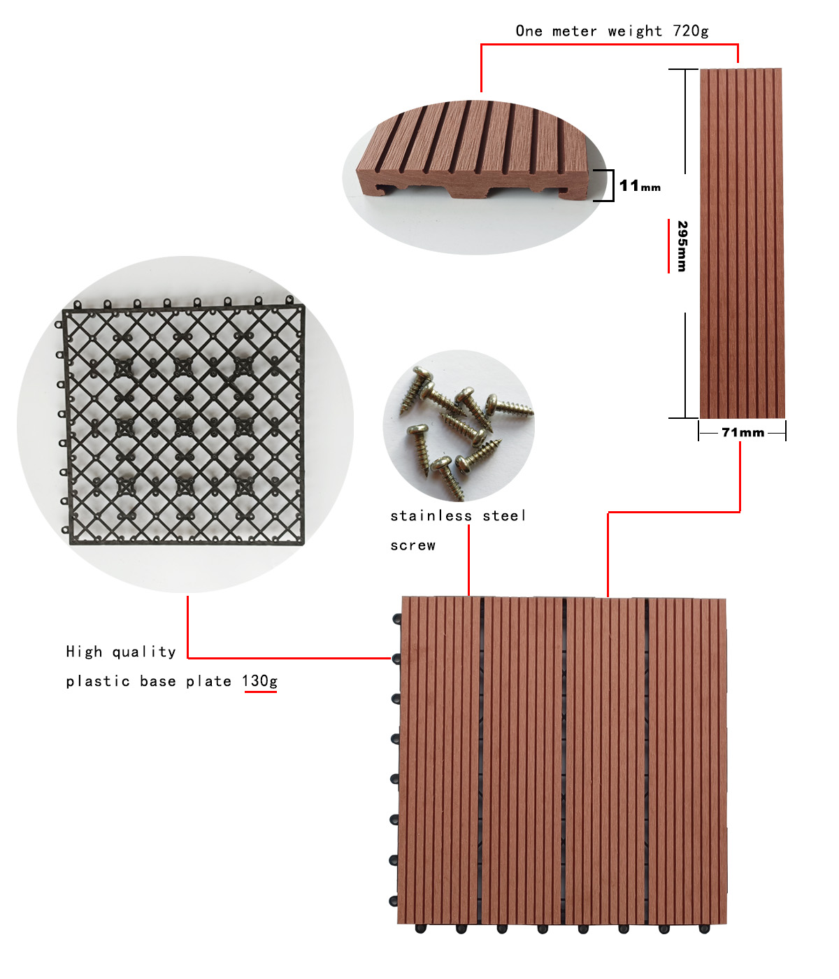 A box of 11 pieces, covering an area of 1 square meter, with a size of 300 * 300 * 22mm per piece, made of wood plastic composite material and plastic bottom plate, easy to install and assemble with snap fasteners to lay on the ground, corrosion-resistant and high temperature resistant, with a lifespan of over 15 years.