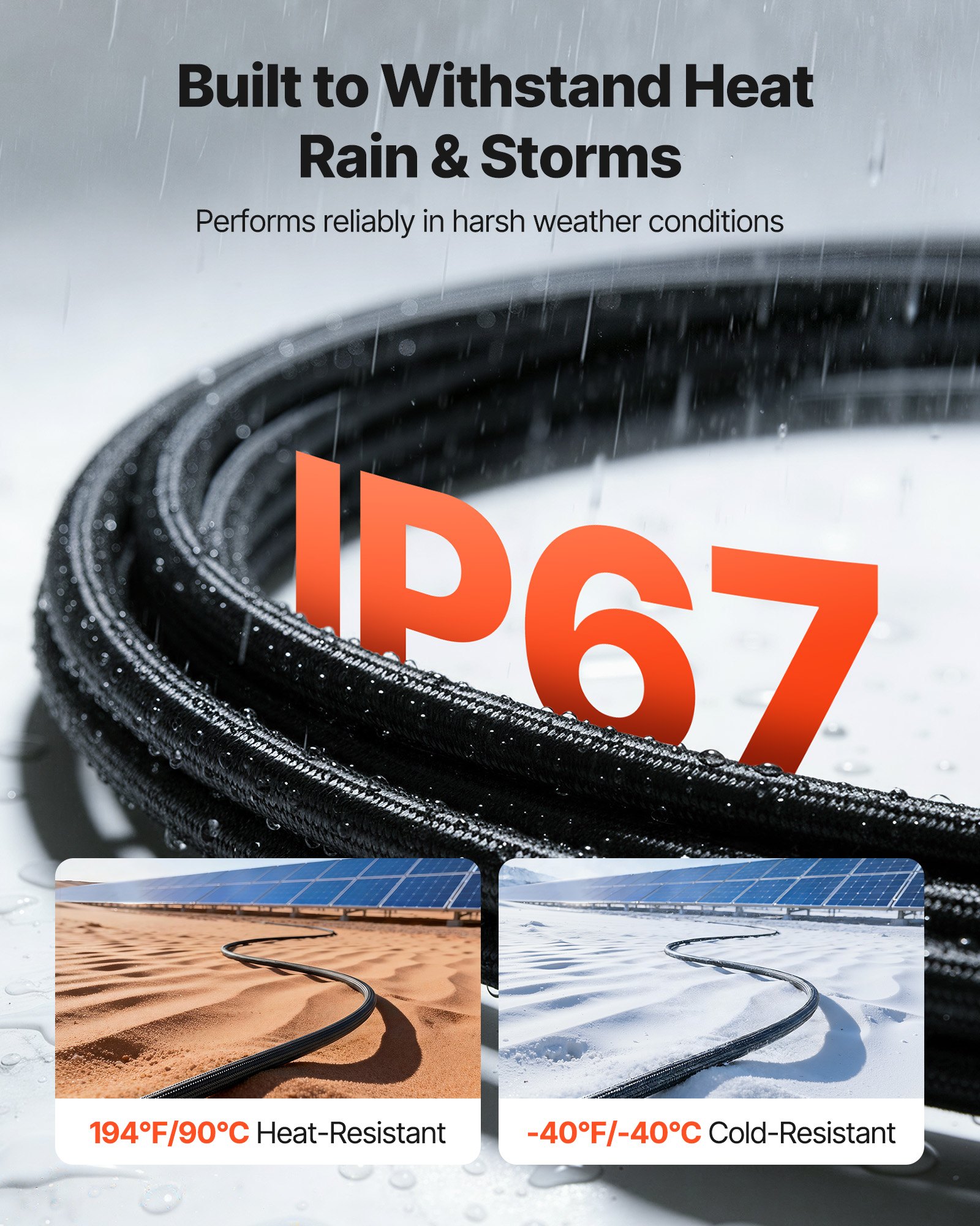 All-Weather Reliability: This solar panel wire operates from -40°F to 194°F and is IP67 waterproof rated, ensuring stable performance in rain, snow, heat, and harsh outdoor conditions for year-round dependable power delivery
