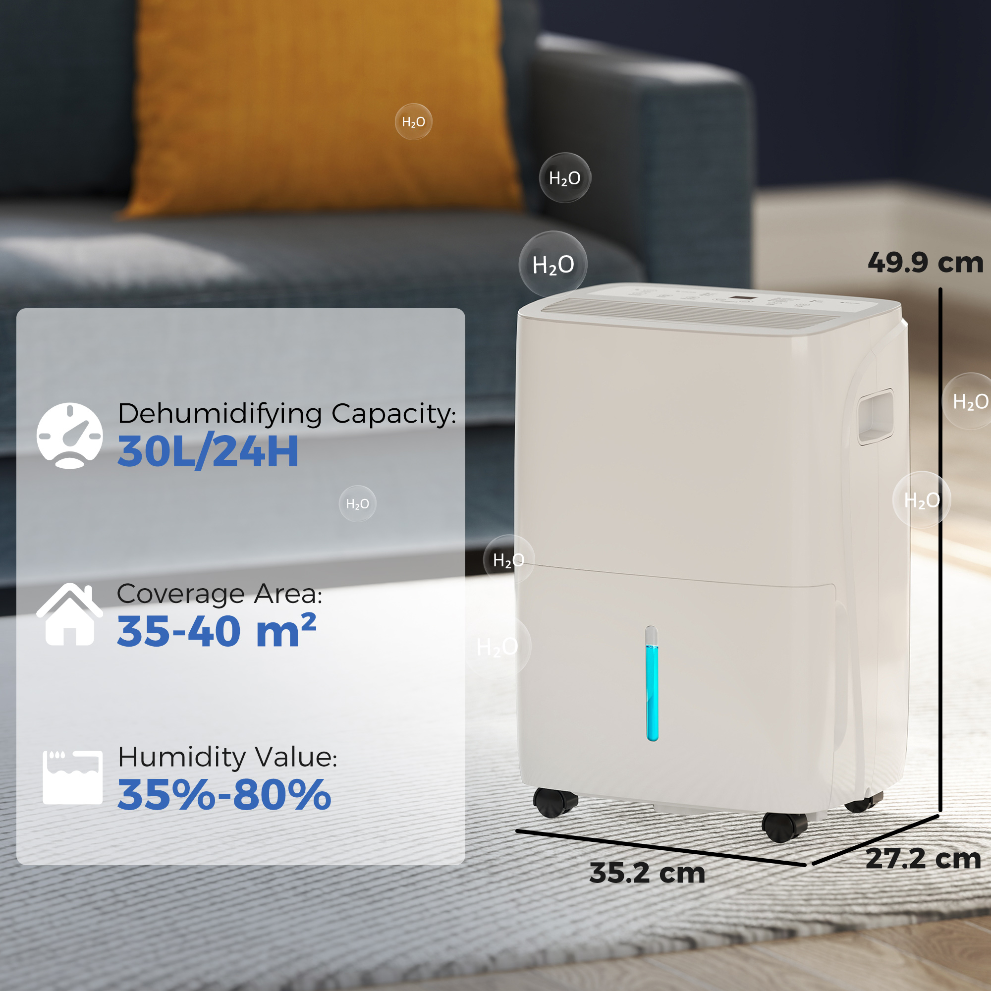 Discover the Dehumidifier for home damp, your new ally against dampness! Effortlessly removing up to 30L of moisture in spaces up to 40m², this home dehumidifier is great for any room—from bedrooms to garages. Enjoy effortless control with its simple touch interface, child lock for safety and LED display to monitor humidity. Plus, never worry about overflow with its full tank alert and automatic shut-off. Say goodbye to damp air today!