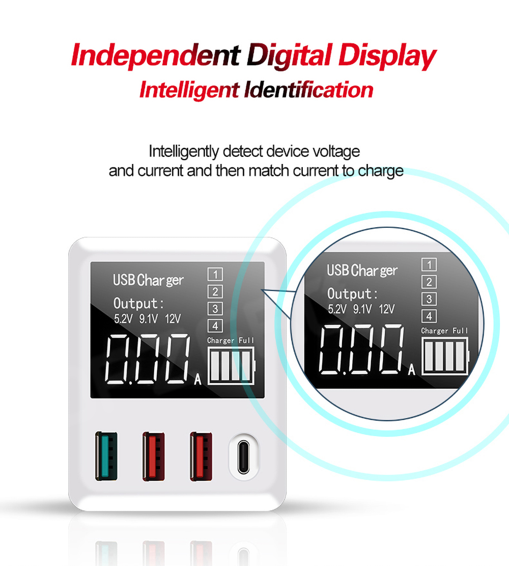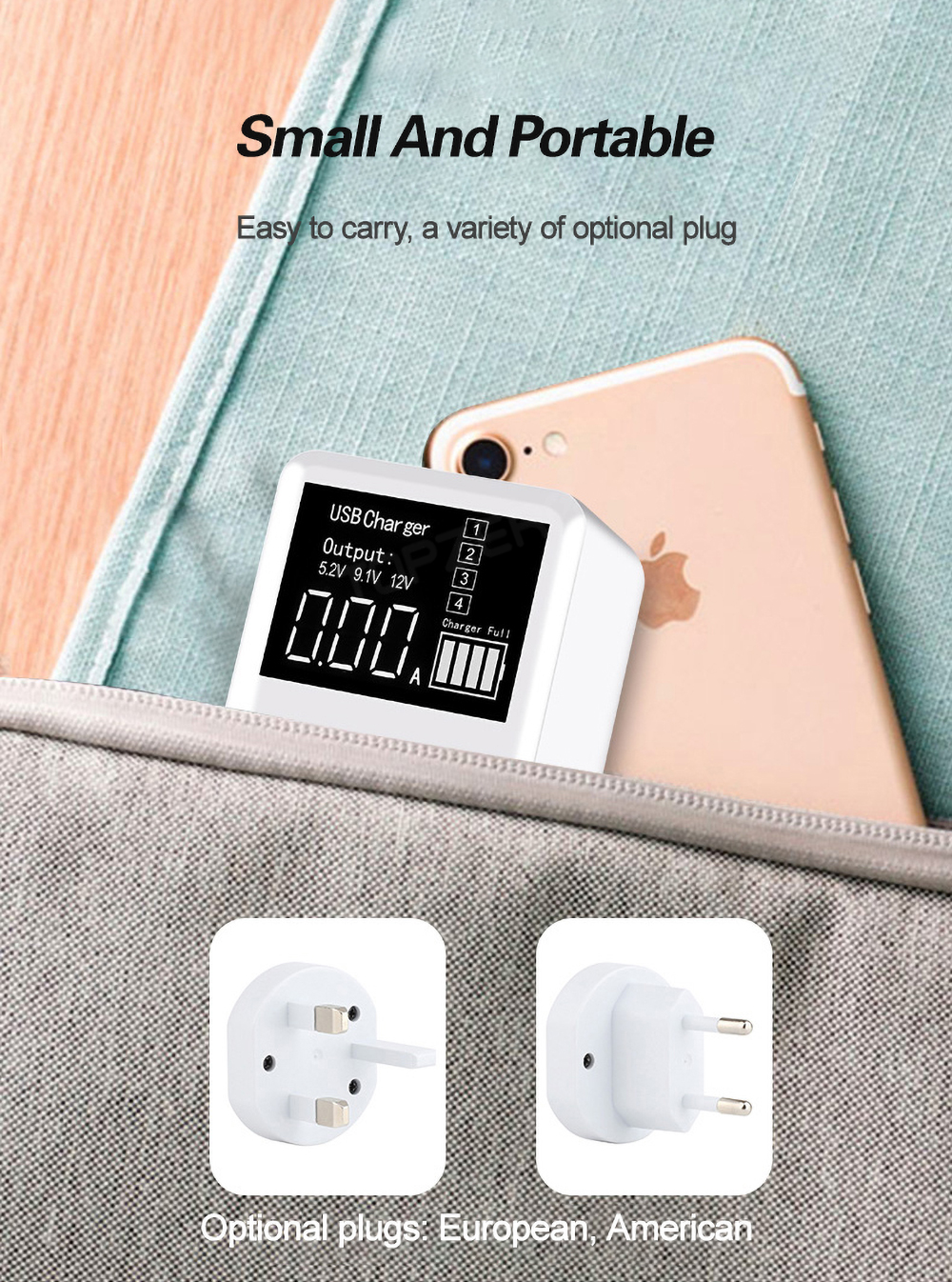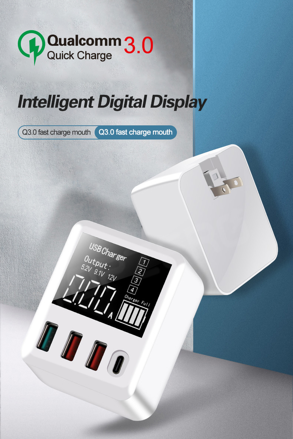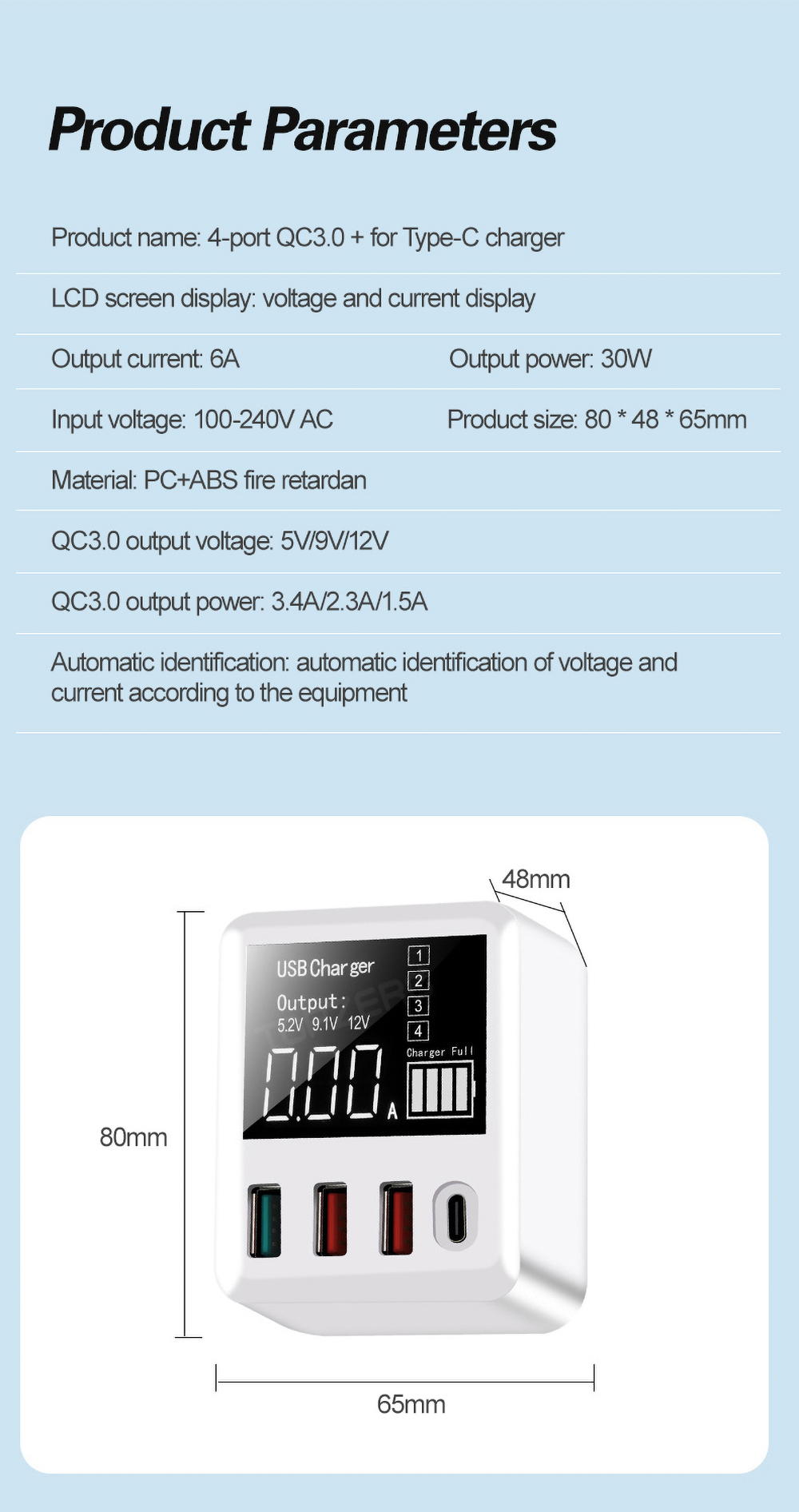 Product name: 4USB/QC3.0 intelligent charger with display. Product Model: A9T. LCD screen display: voltage and current display. Input voltage: 100-240V AC. Output current: 6A. Output power: 30W. QC3.0 output voltage: 5V/9V/12V. QC3.0 output power: 3.6A/2A/1.5A. Automatic identification: automatic identification of voltage and current according to the equipment.