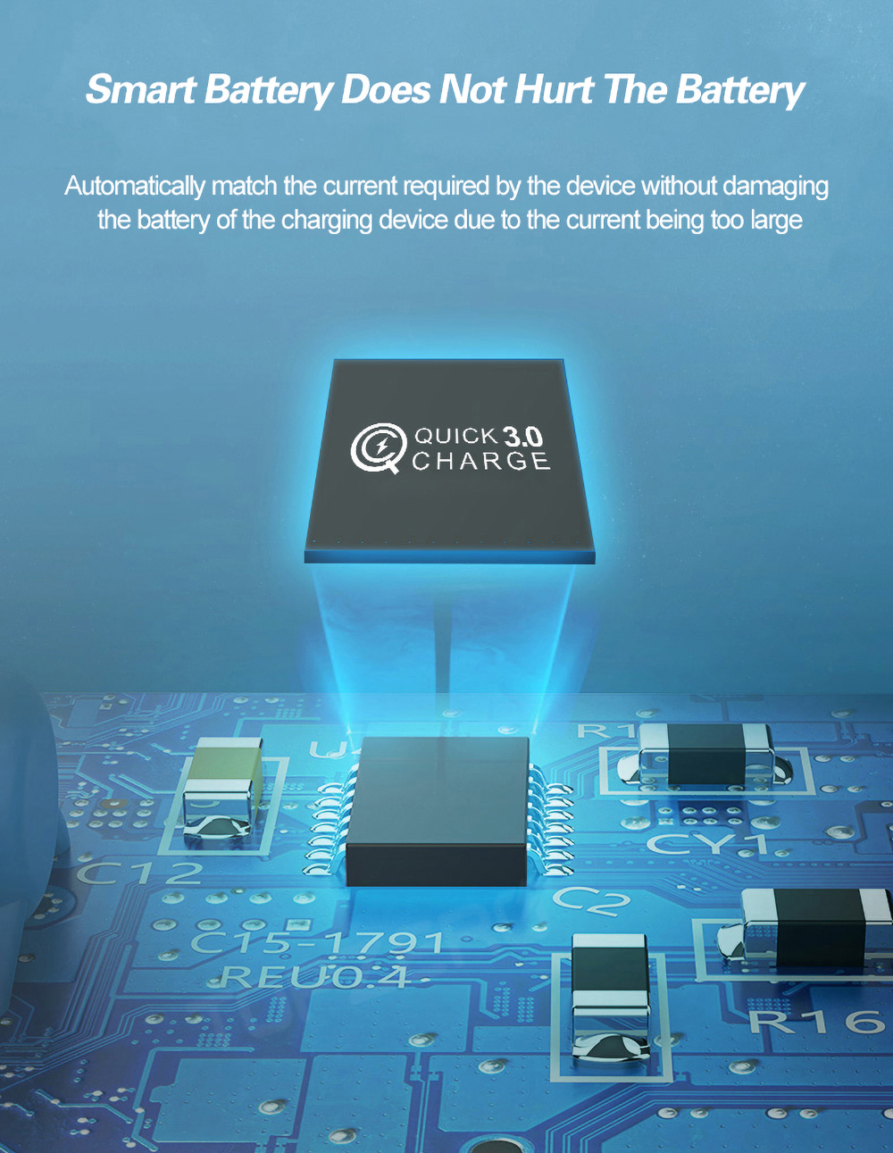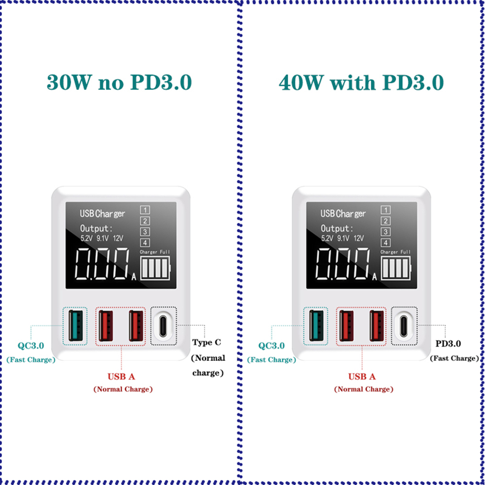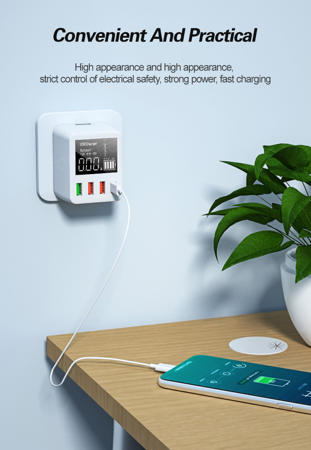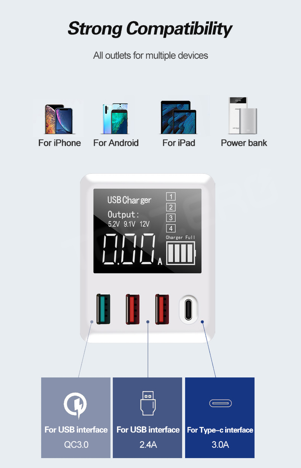 Product name: 4USB/QC3.0 intelligent charger with display. Product Model: A9T. LCD screen display: voltage and current display. Input voltage: 100-240V AC. Output current: 6A. Output power: 30W. QC3.0 output voltage: 5V/9V/12V. QC3.0 output power: 3.6A/2A/1.5A. Automatic identification: automatic identification of voltage and current according to the equipment.