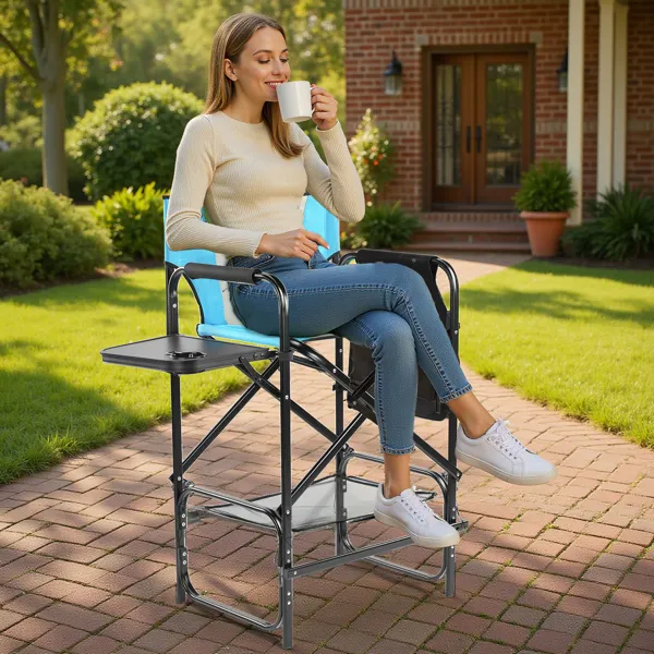 31" Tall Directors Chair With Footrest, 4Portable Bar Height Folding Camping Chair With Built-in Cup Holder, Side Table, Storage Pocket, Blue & Gray