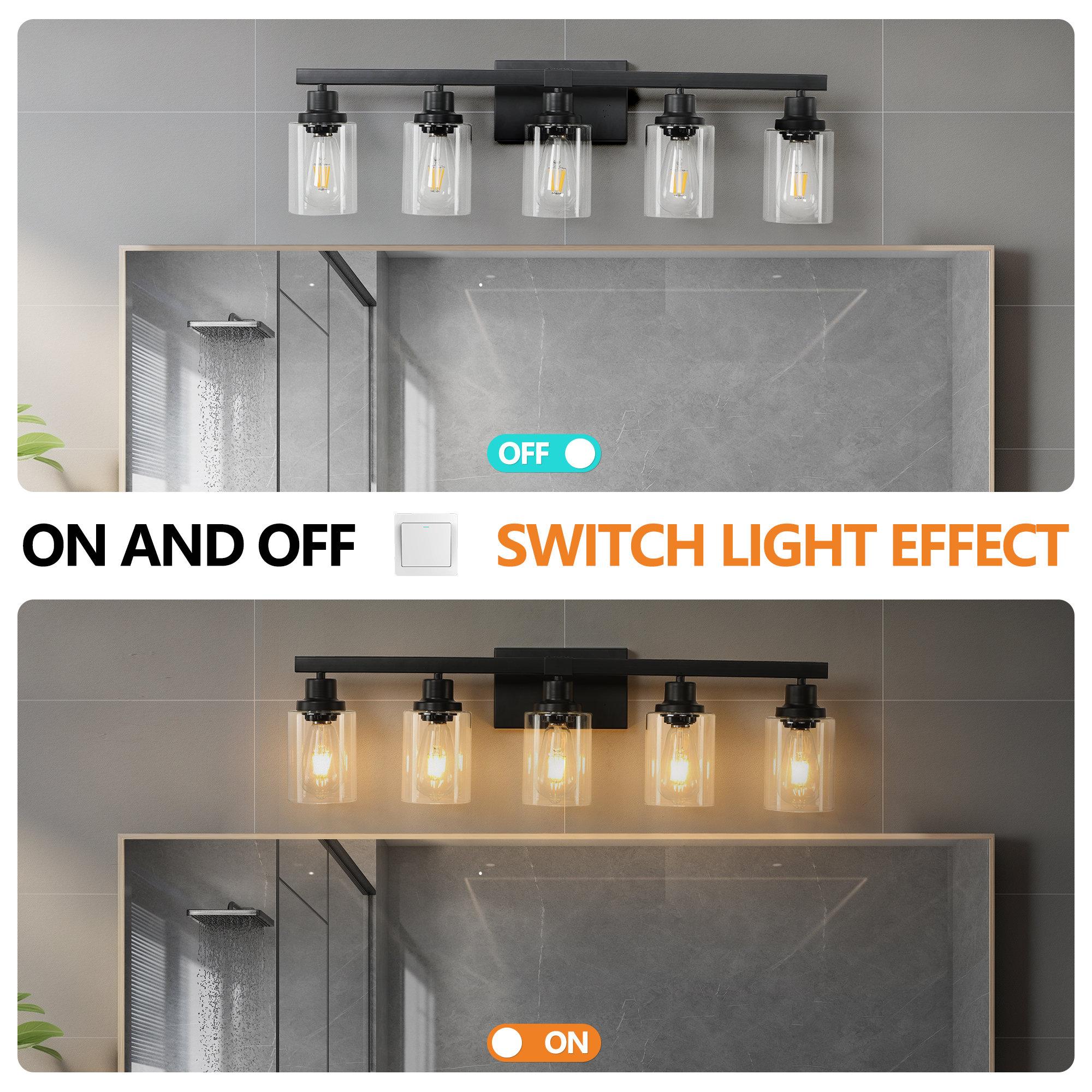 Rustic & Farmhouse Design:A combination of black design brings modernity and rustic style, which shows a simple and pure atmosphere and perfectly suits for your home decoration.Premium Material:Our bathroom light fixture is made of high quality metal and glass, compatible with incandescent, LED, CFL and other bulbs of E26 standard medium base .Maximum power 60W, (Bulbs NOT Included).Applicable Scenarios:This 5-light bathroom light fixture perfectly transforms a bathroom into a romantic, rustic relaxing atmosphere for any bathroom and vanity setting in a farmhouse, urban industrial or vintage electric interior.Easy to install:All mounting hardware for quick and easy installation are included in the package.